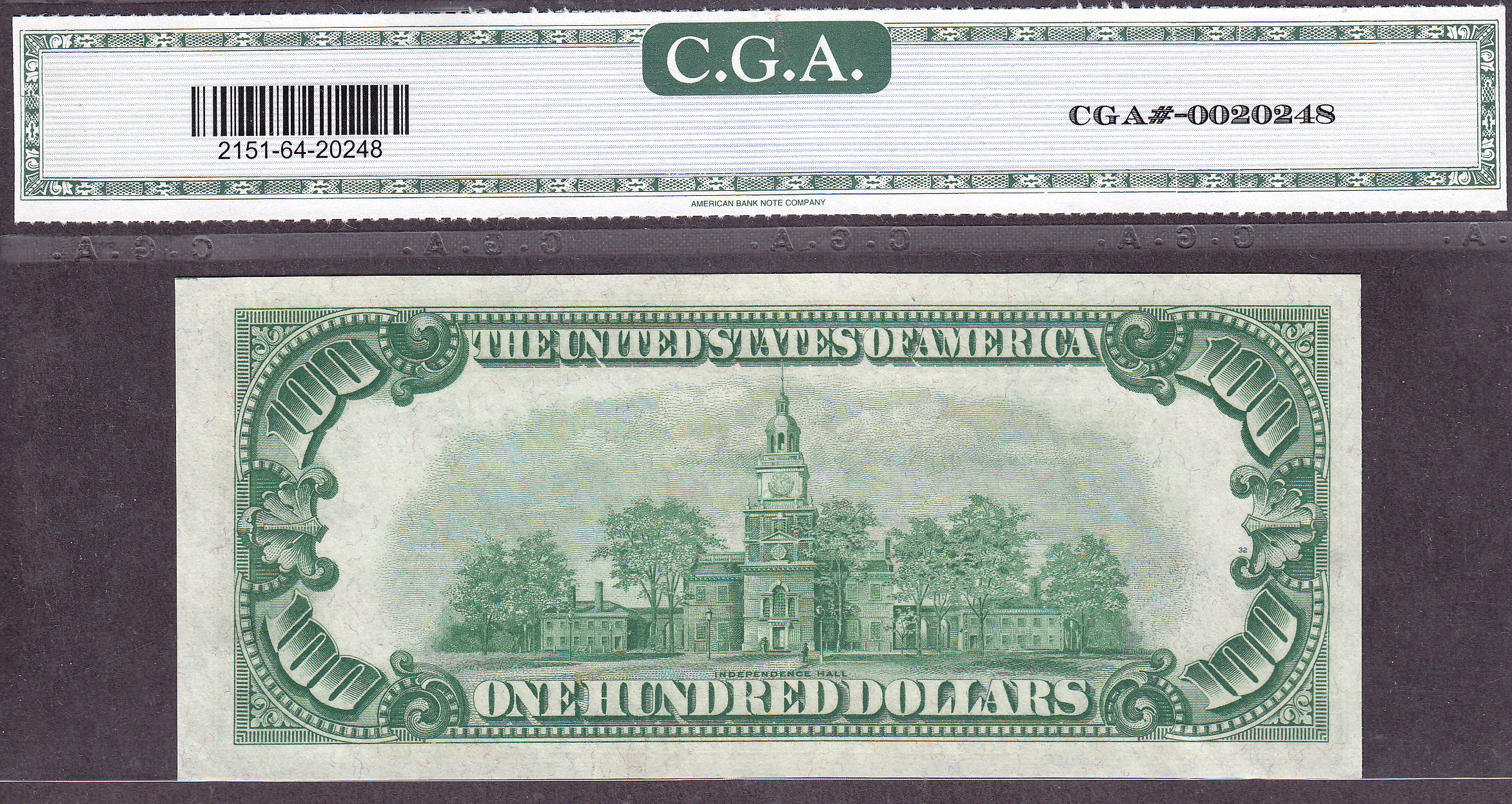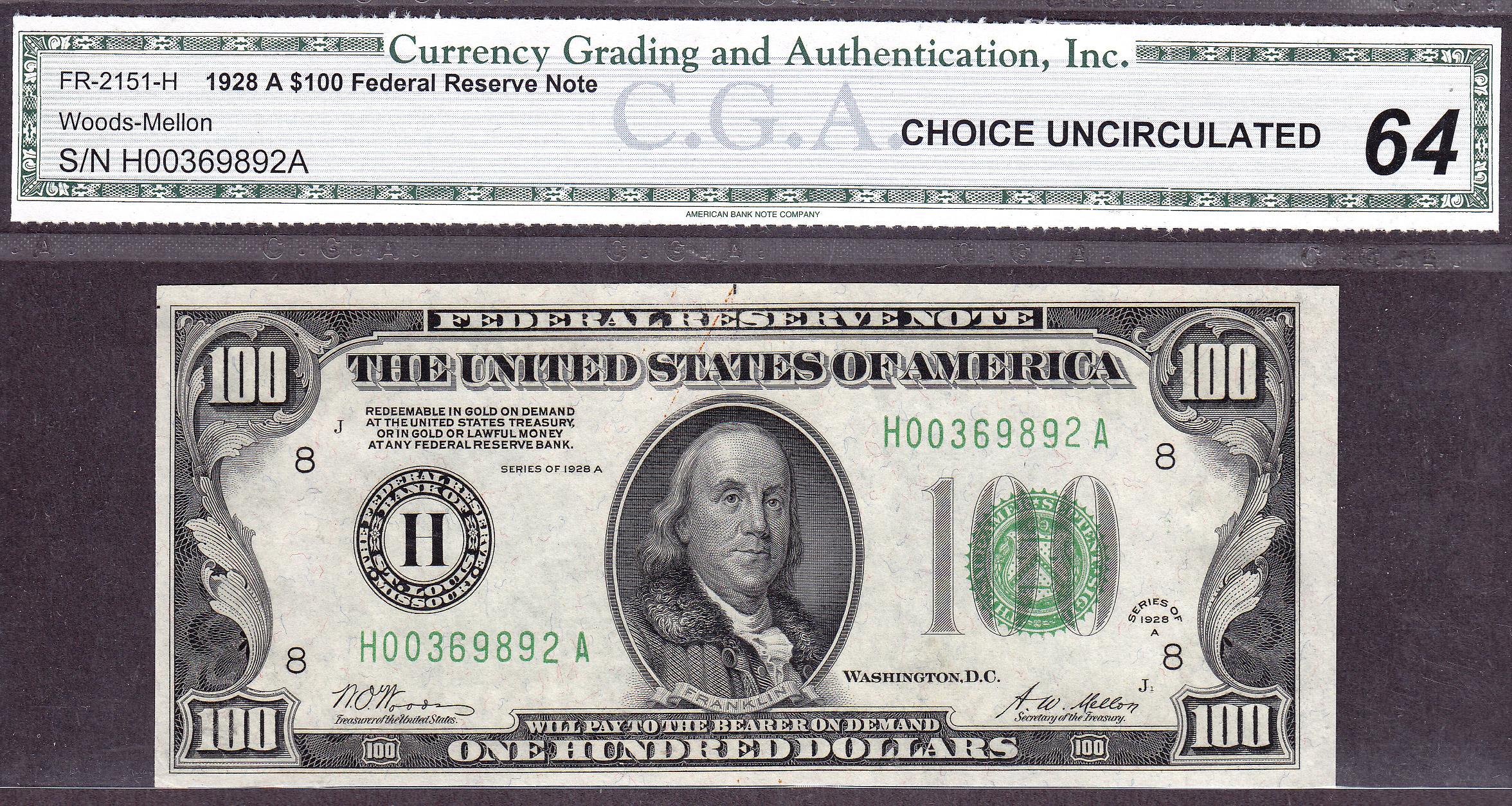 This 1928A $100 FRN is between the Dark Green and Light Green Varity. After comparing it to the 1928 $100 FRN from the Philly District (which is the note advertised above this one on my website) I think it is definitely more Light Green than Dark Green. However it is a very nice and clean note. It is in a CGA-64 holder