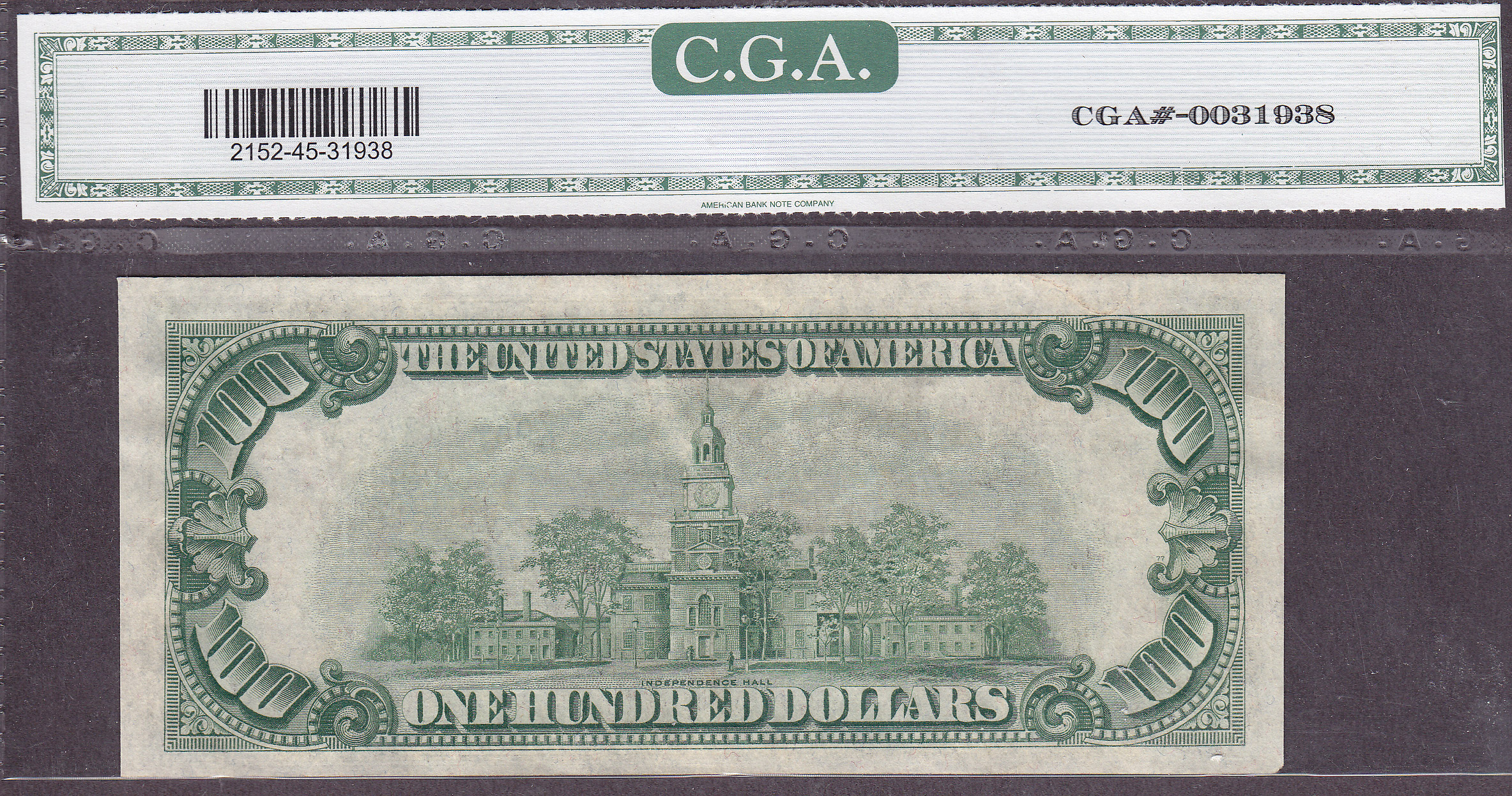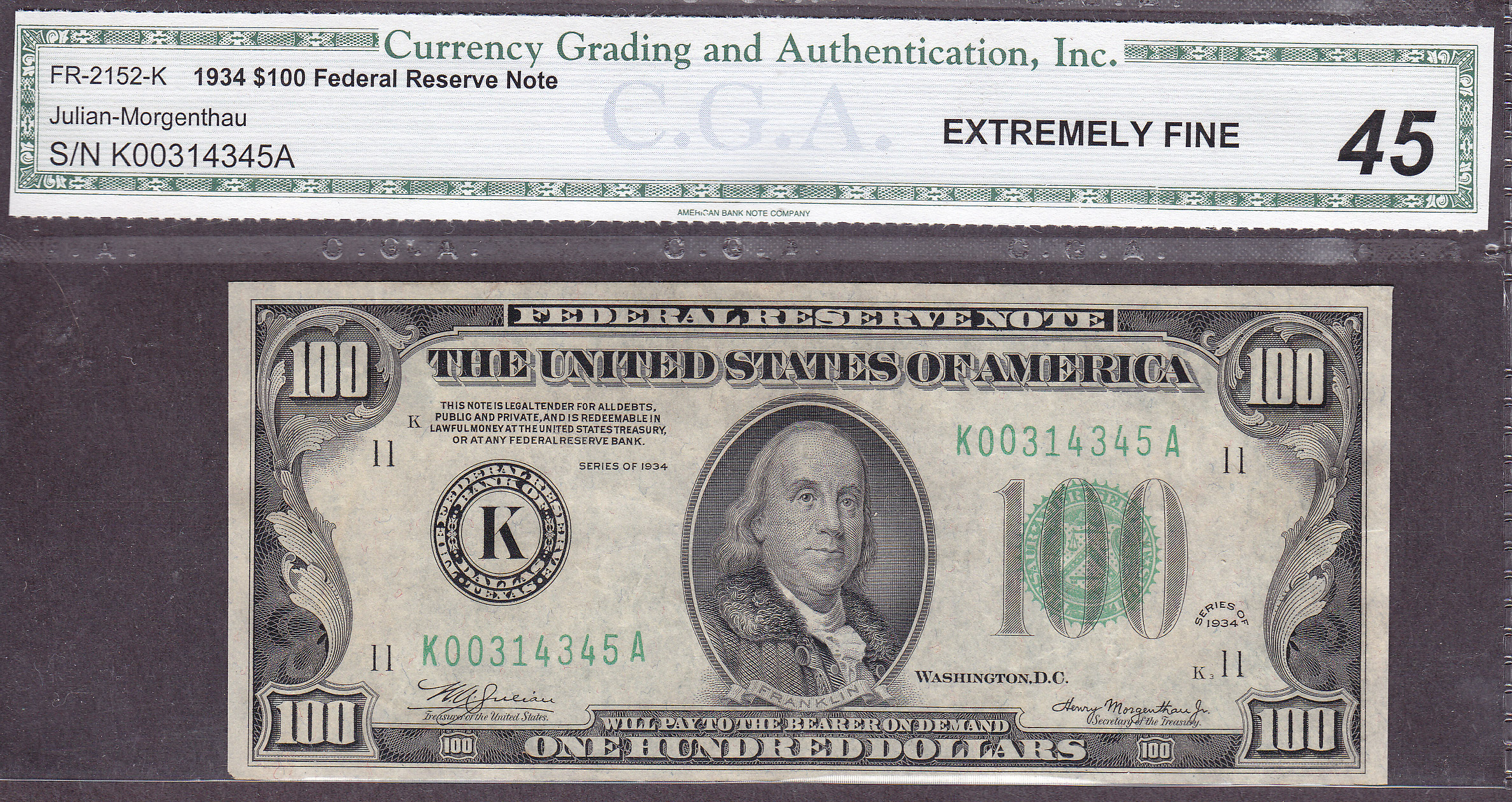Here is a truly problem free 1934 $100 FRN from the every popular and tough Dallas District. The serail number is K00314345A and id housed in a CGA EF-45 holder. You won''t find a 1934 $100 Dallas note any cheaper anywhere on the internet.