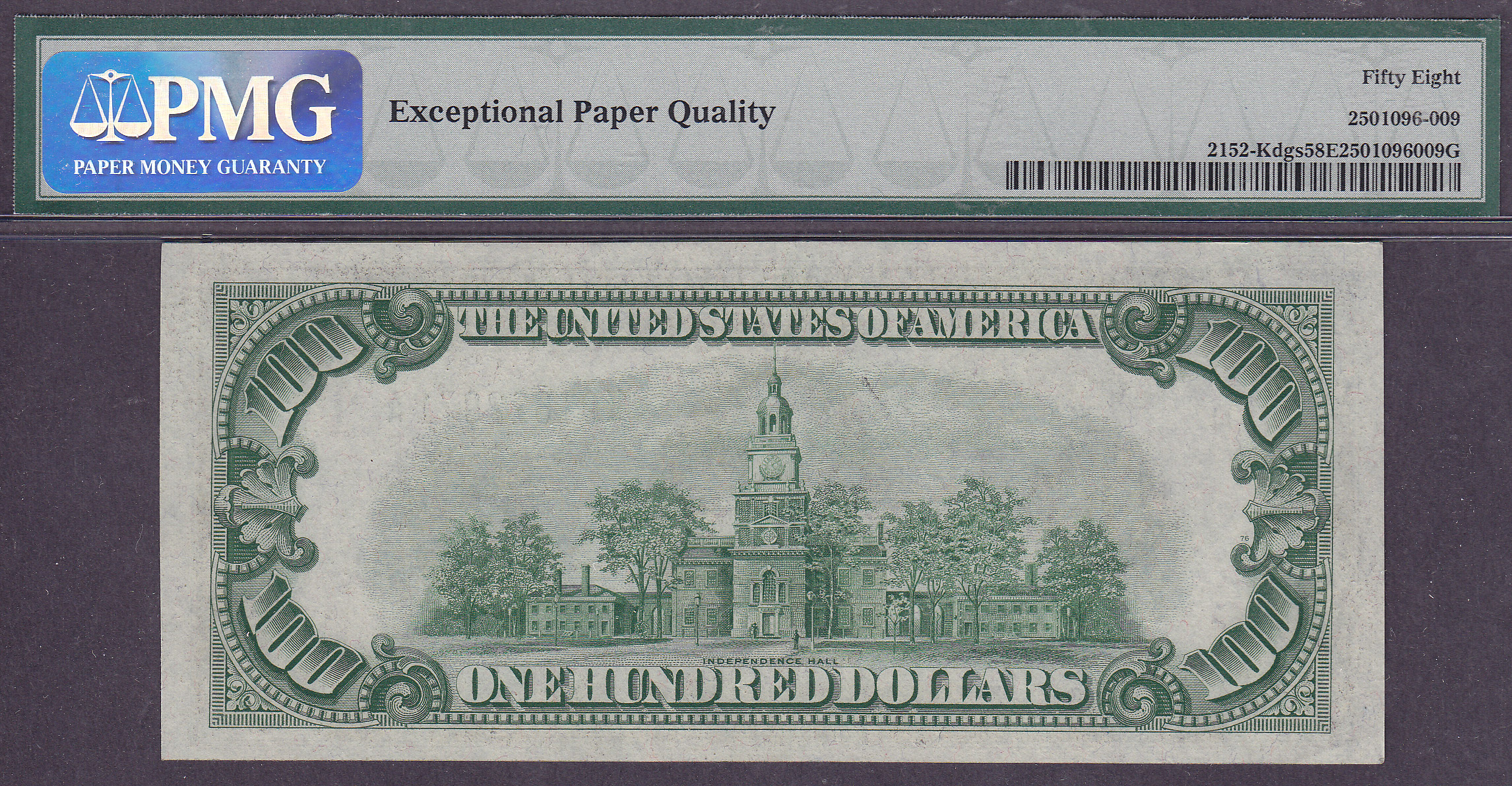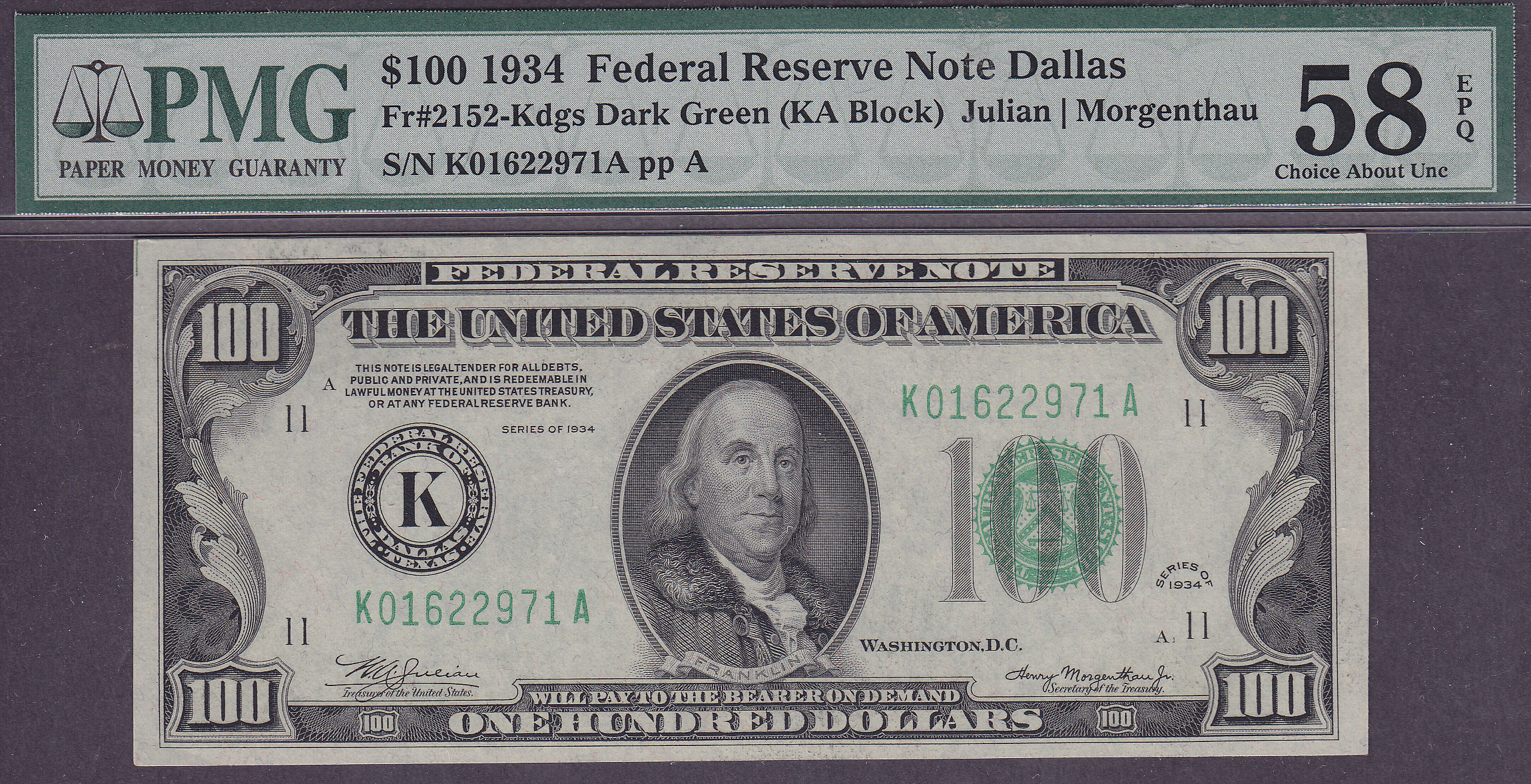 Here is a really nice 1934 $100 Dallas FRN. The serial number is K01622971A. I bought this as a GEM note and I still can't find why it is in a PMG-58EPQ holder. I do not see any folds or creases. But it is what it is. The plate numbers are A1/76.
