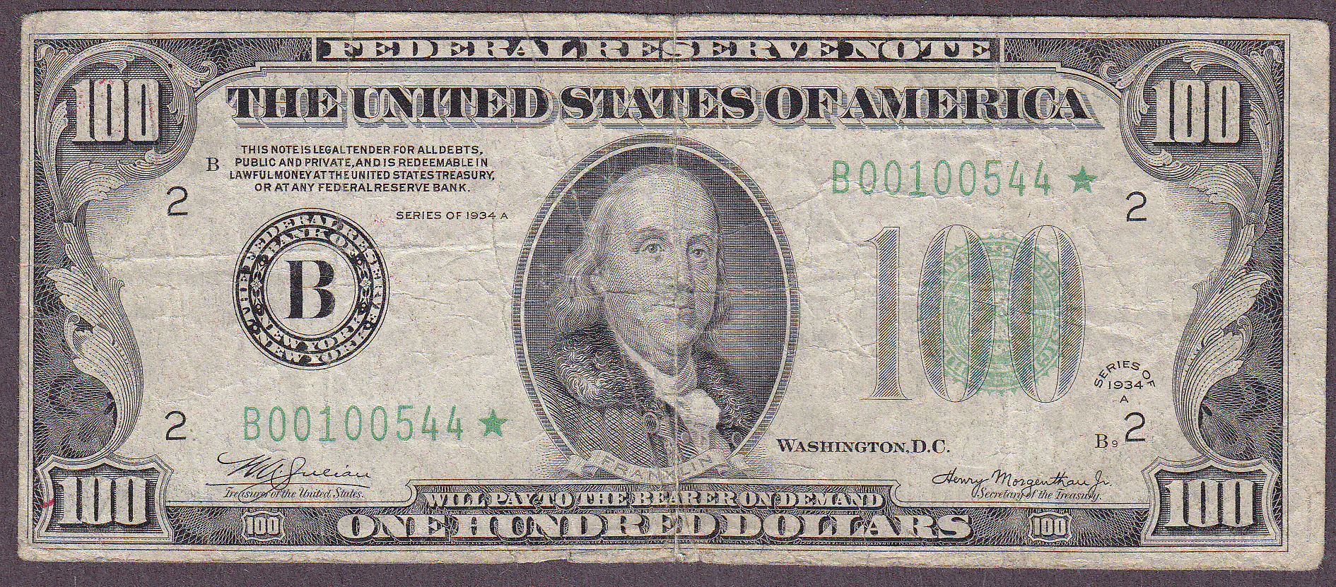 Here is a original 1934A Mule Green Seal $100 FRN Star from the New York District. It has never been cleaned or pressed.There areabsolutely NO rips, tears, pinholes or markings. The serial number is B00100544*. This is a new low serial number star known from the 9th edition of the Schwartz/Lindquist book.