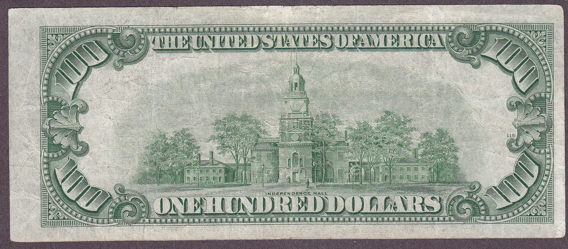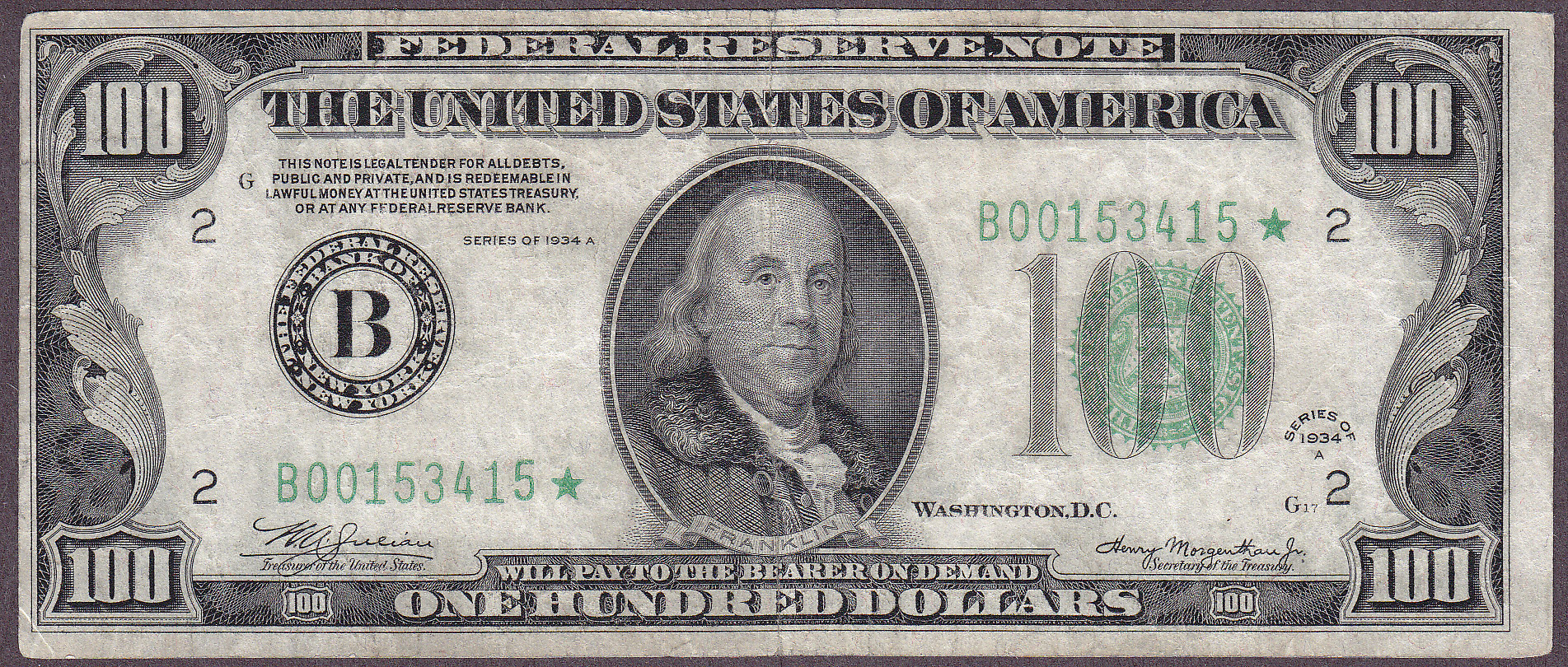 Here is a very scarce original 1934A Mule Green Seal Star $100 from the New York District. It has a back plate # of 115which make it a Green Seal star, not a Mule Star. It has never been cleaned or pressed.Featuring decent margins with absolutely NO rips, tears, pinholes or markings. The serial number is B00153415*.