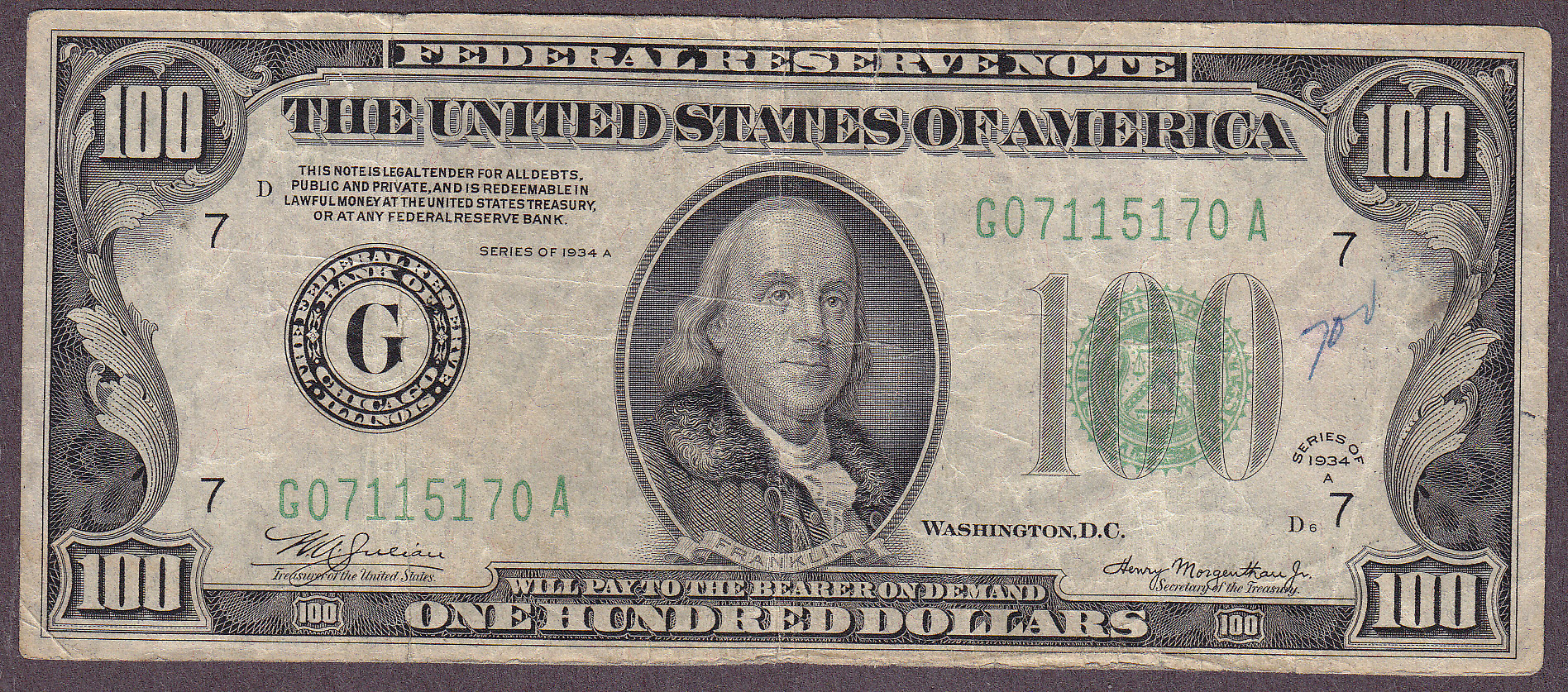 Fr.-2153 1934-A $100 Chicago Ser. G07115170A Raw