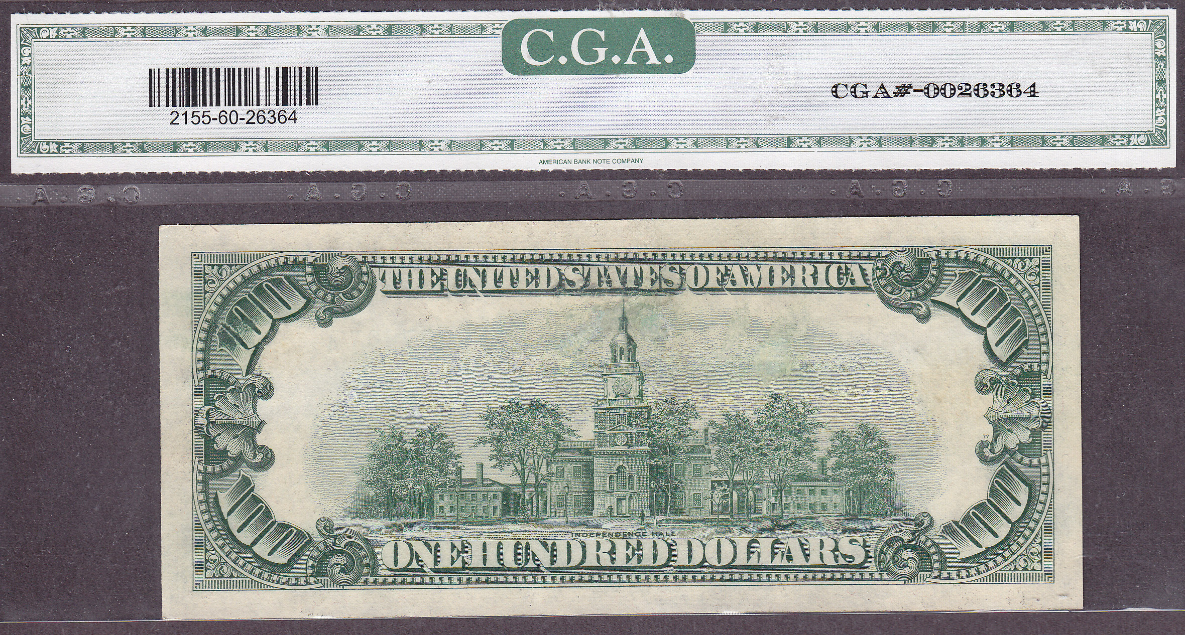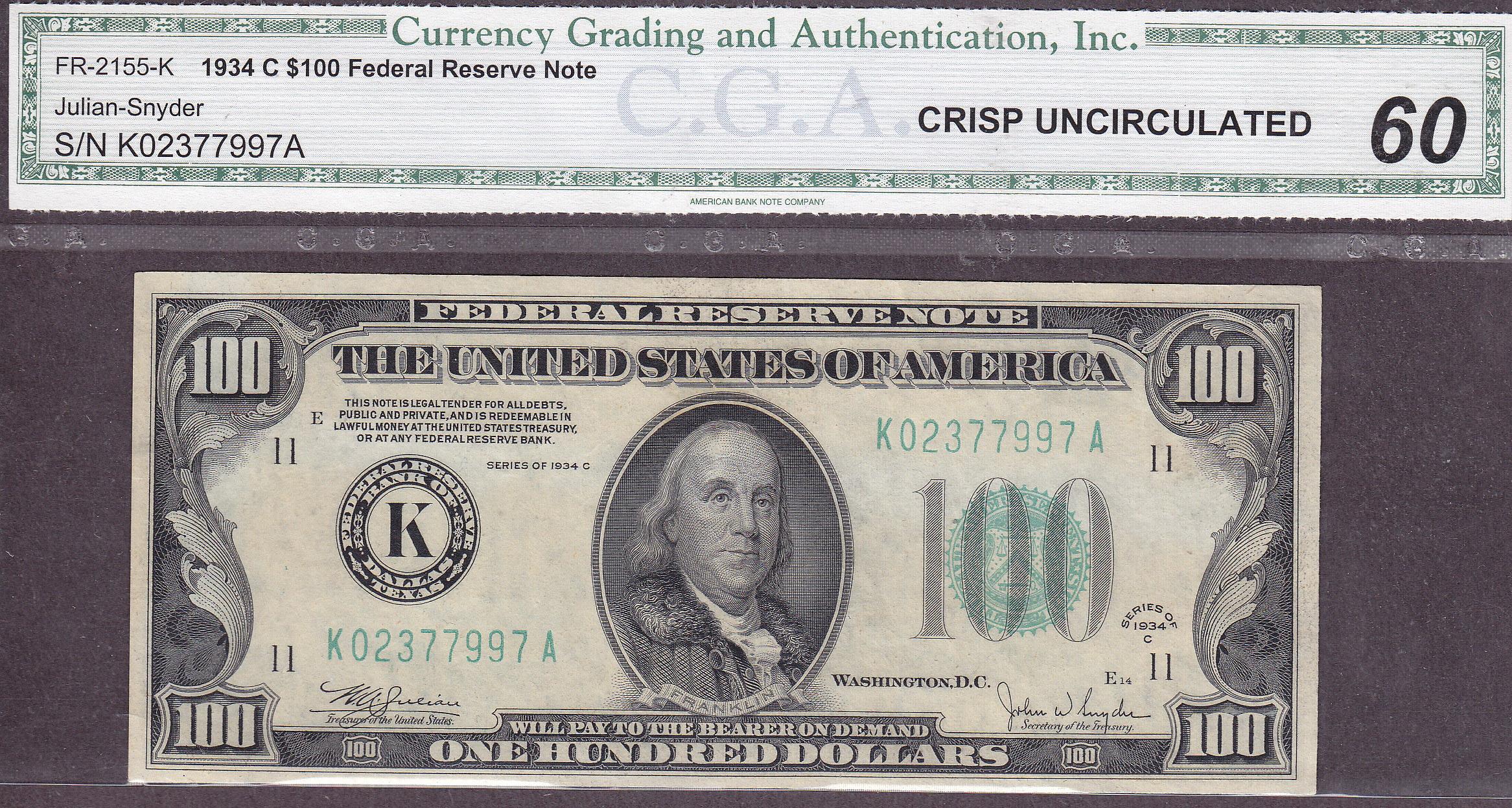 This is one tough note to find in any condition. It is a 1934C $100 FRN from the very popular and tough "Dallas" district. It is a Dark Green Seal variety and it is also a MULE note.