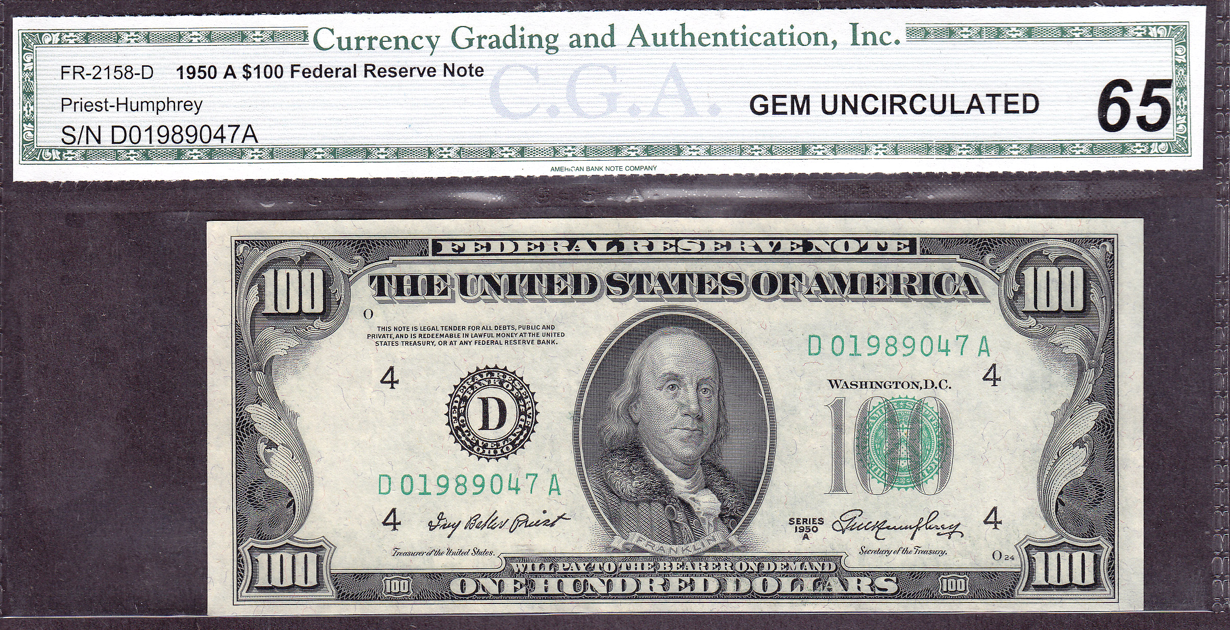 Fr.-2158 1950D $100 Cleveland FRN Ser. # D01989047A CGA-65