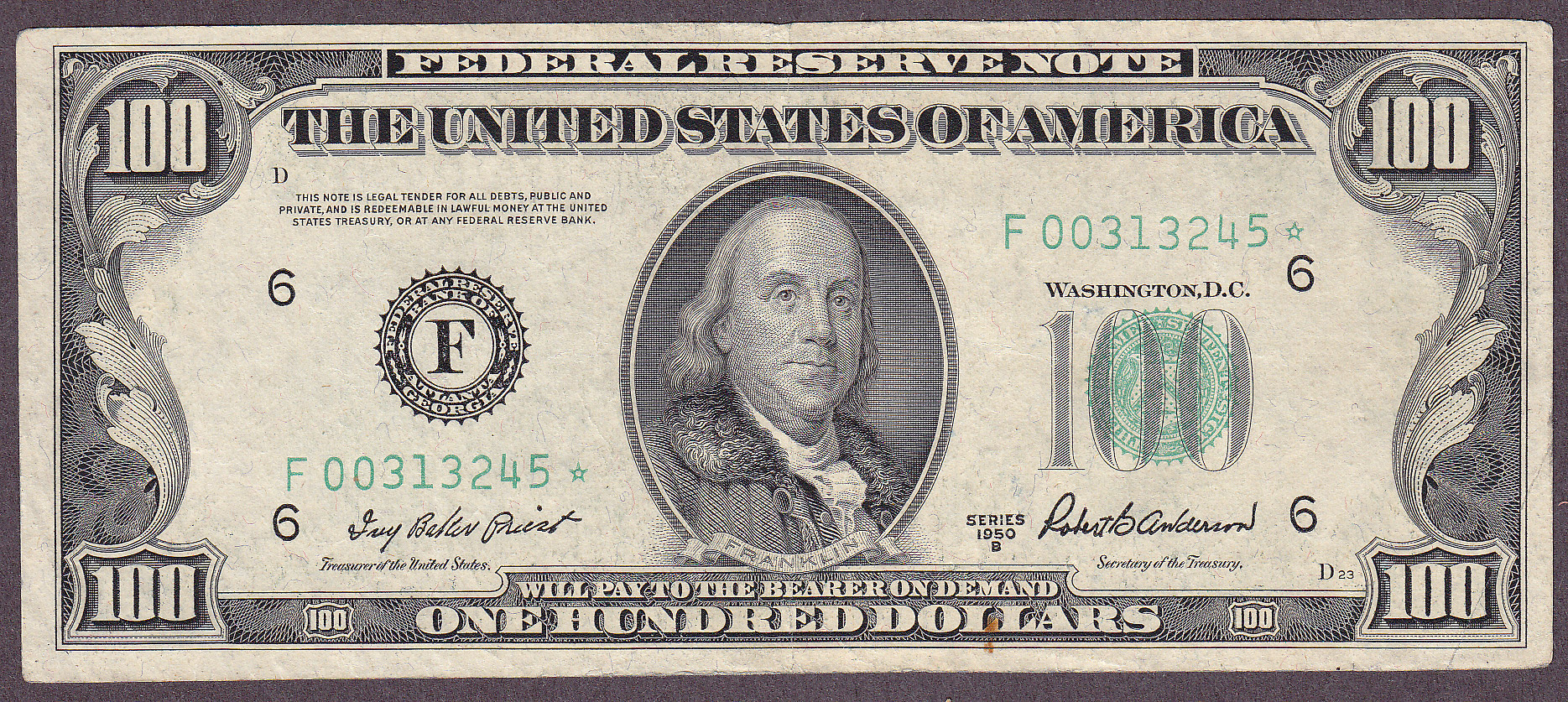Here is a scarce and nice 1950B* $100 Atlanta star note. The serial number is F00313245*. There are no rips, tears, pinholes or bank marks. 1950B* stars are very hard to come by and Minneapolis is one of the key districts.