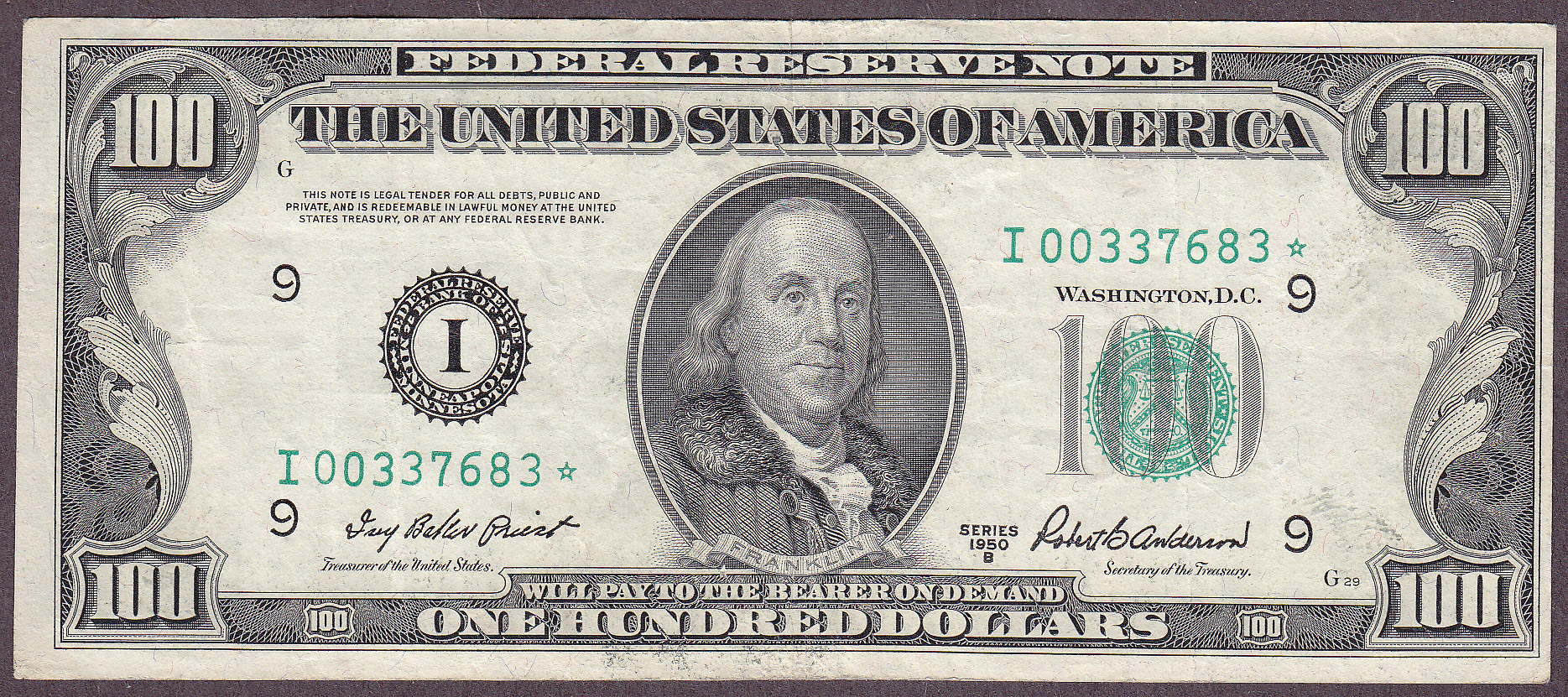 Here is a scarce and nice 1950B* $100 Minneapolis star note. The serial number is I00337683*. There are no rips, tears, pinholes or bank marks. 1950B* stars are very hard to come by and Minneapolis is one of the key districts.