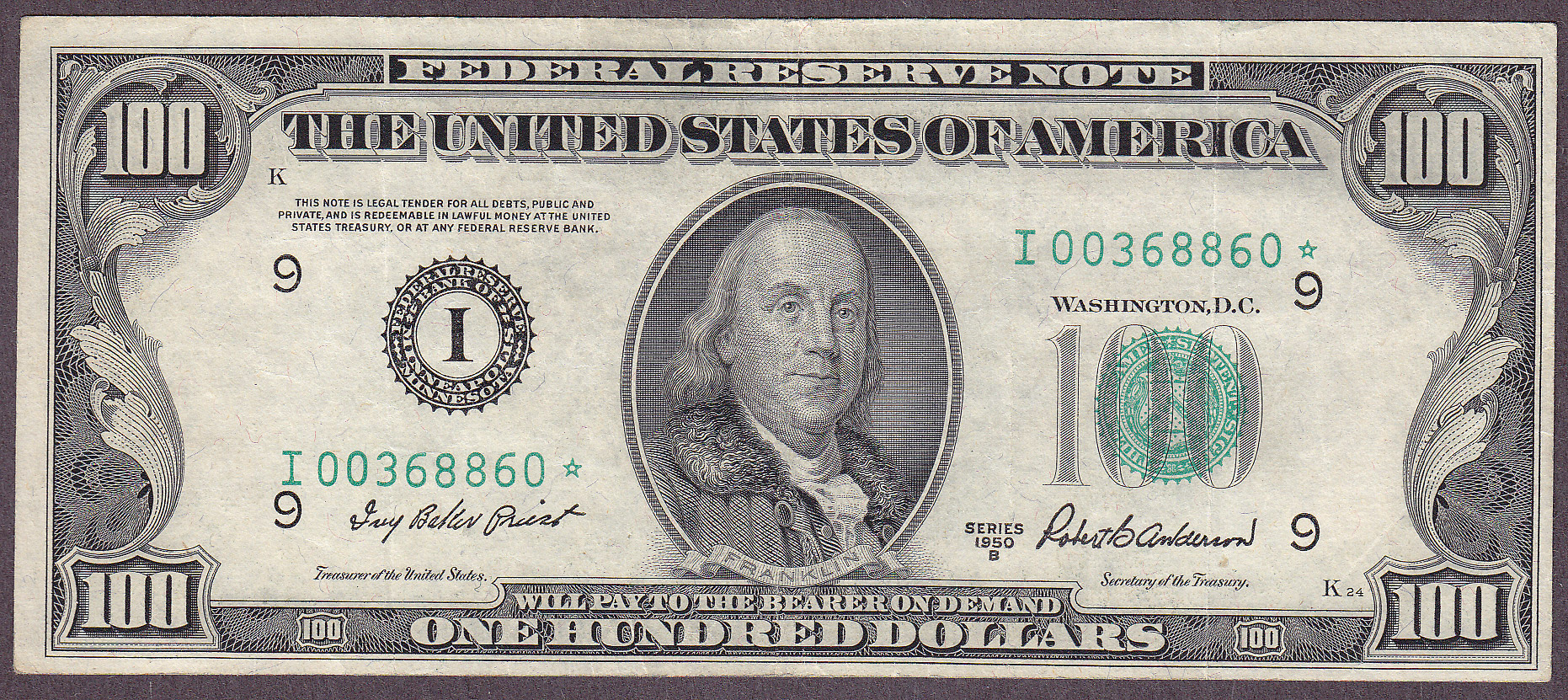 Here is a scarce and nice 1950B* $100 Minneapolis star note. The serial number is I00368860*. There are no rips, tears, pinholes or bank marks. 1950B* stars are very hard to come by and Minneapolis is one of the key districts.