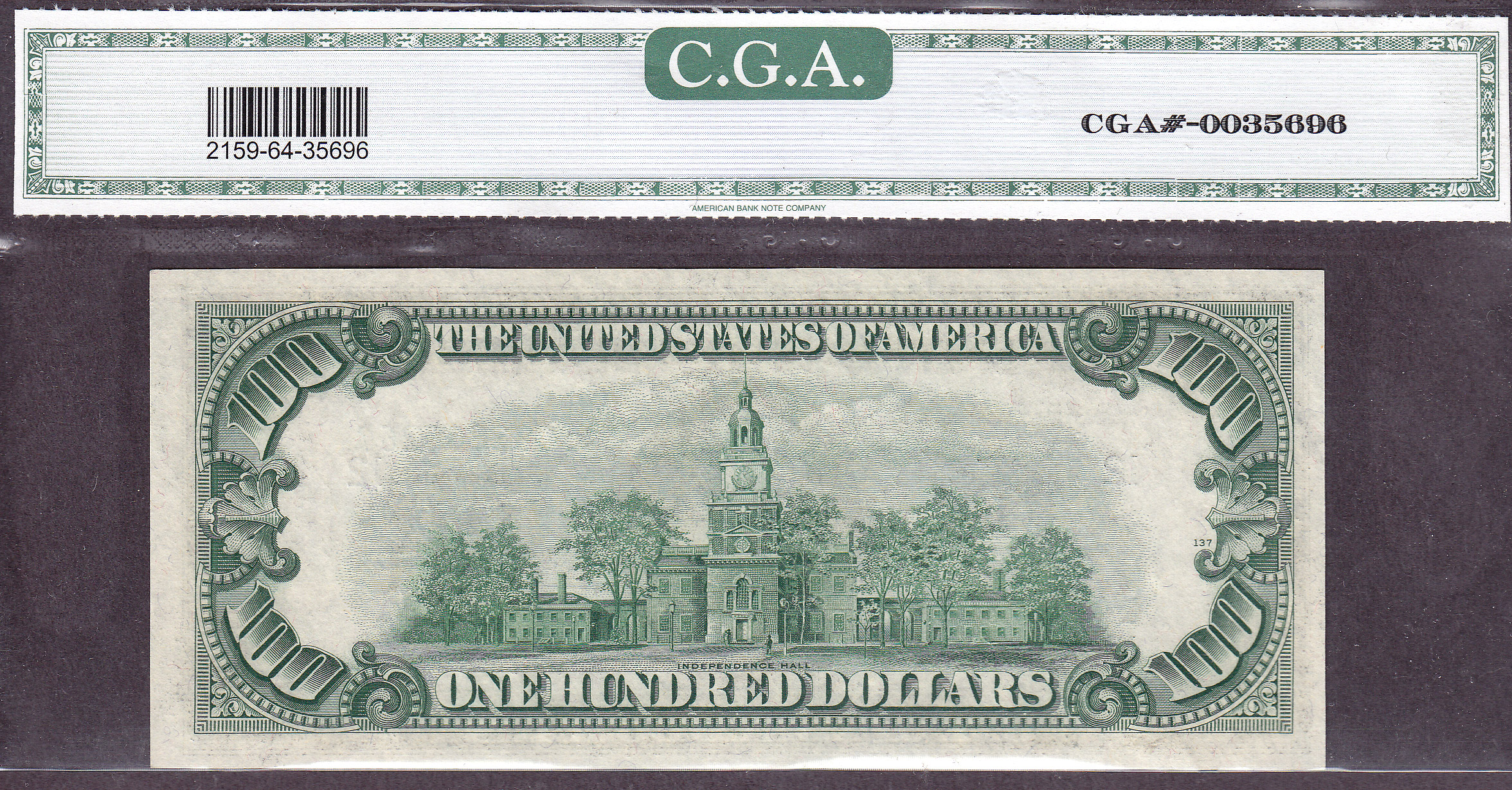 This 1934 $100 FRN from San Francisco is one of the nicest 1950B notes you will find. SF is a real tough district to locate in high grade. THE BACK PLATE NUMBER IS 137.