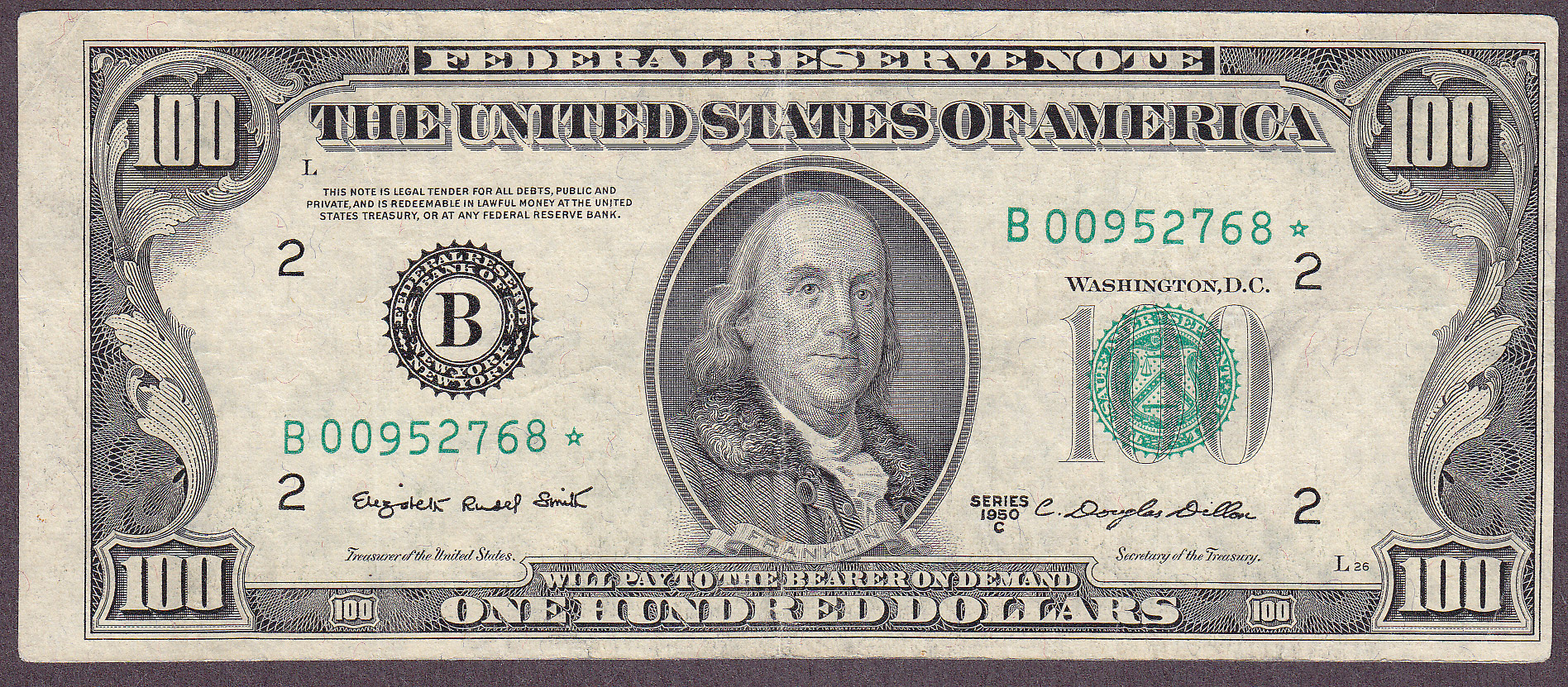 Here is a nice 1950C* $100 New York star note. The serial number is B00952768*, which is also the exact serial number that Schwartz/Lundquist uses as their high serial number known in their 9th edition book. There are no rips, tears, pinholes or bank marks. 1950C* stars are very hard to come by.