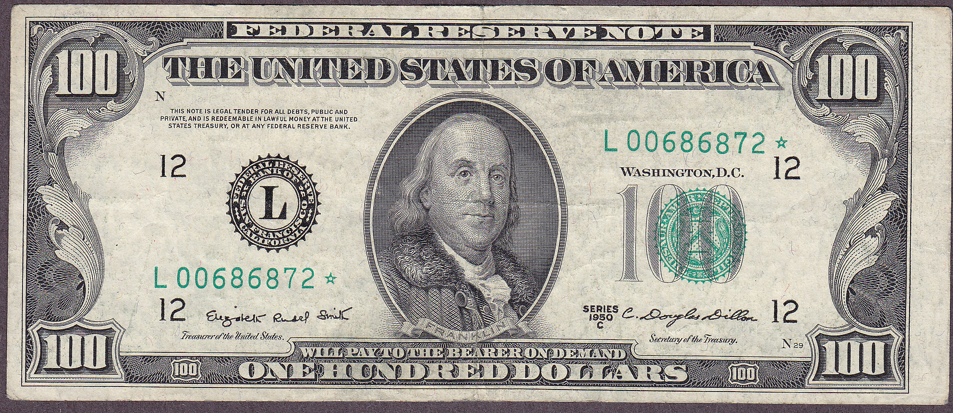 Here is a nice 1950C* $100 San Francisco star note. The serial number is L00686872*.There are no rips, tears, pinholes or bank marks. 1950C* stars are very hard to come by.