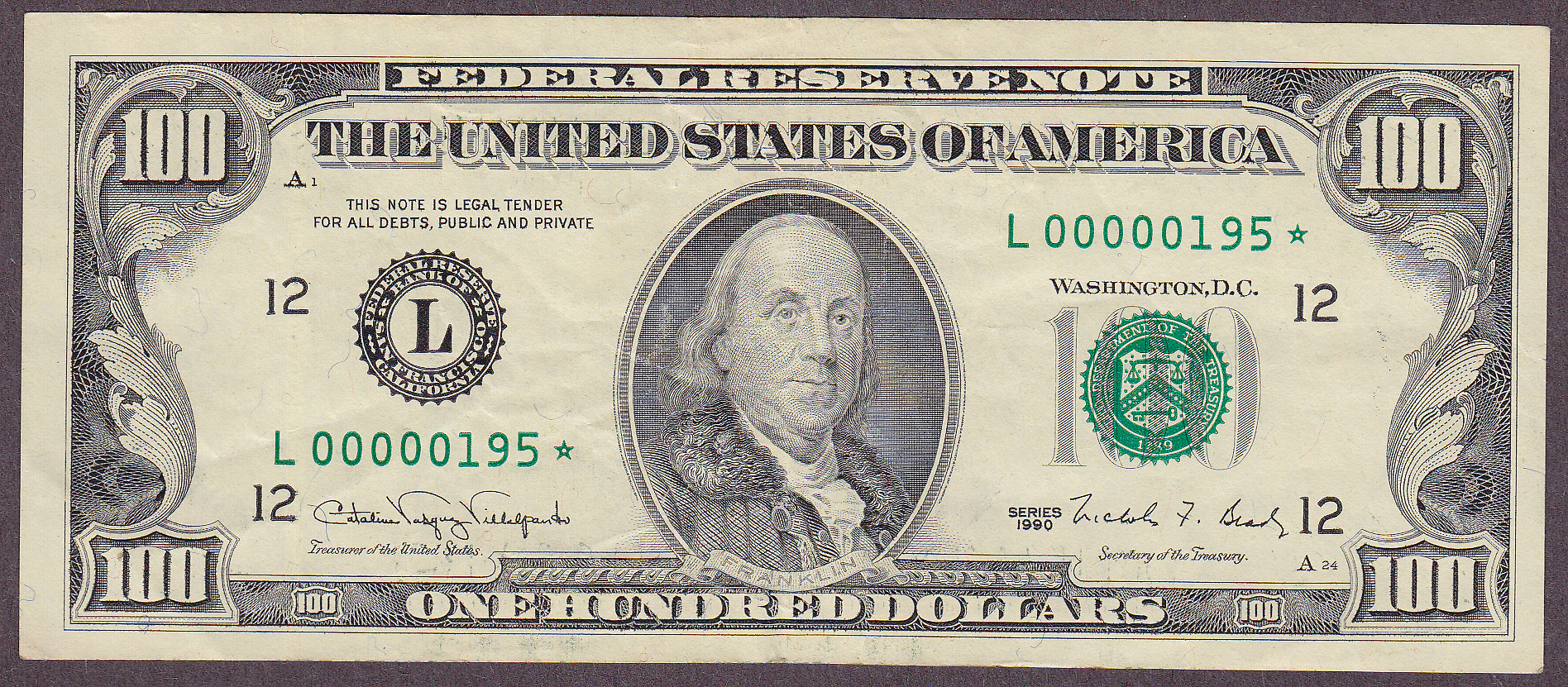 How about a three-digit serialed numbered STAR on a 1990 $100 bill from the San Francisco district. Pretty cool and a nice low three digit number and a STAR. A solid and all original Very Fine plus. No rips, tears or pinholes. The cool and fancy serial number is L00000195*.