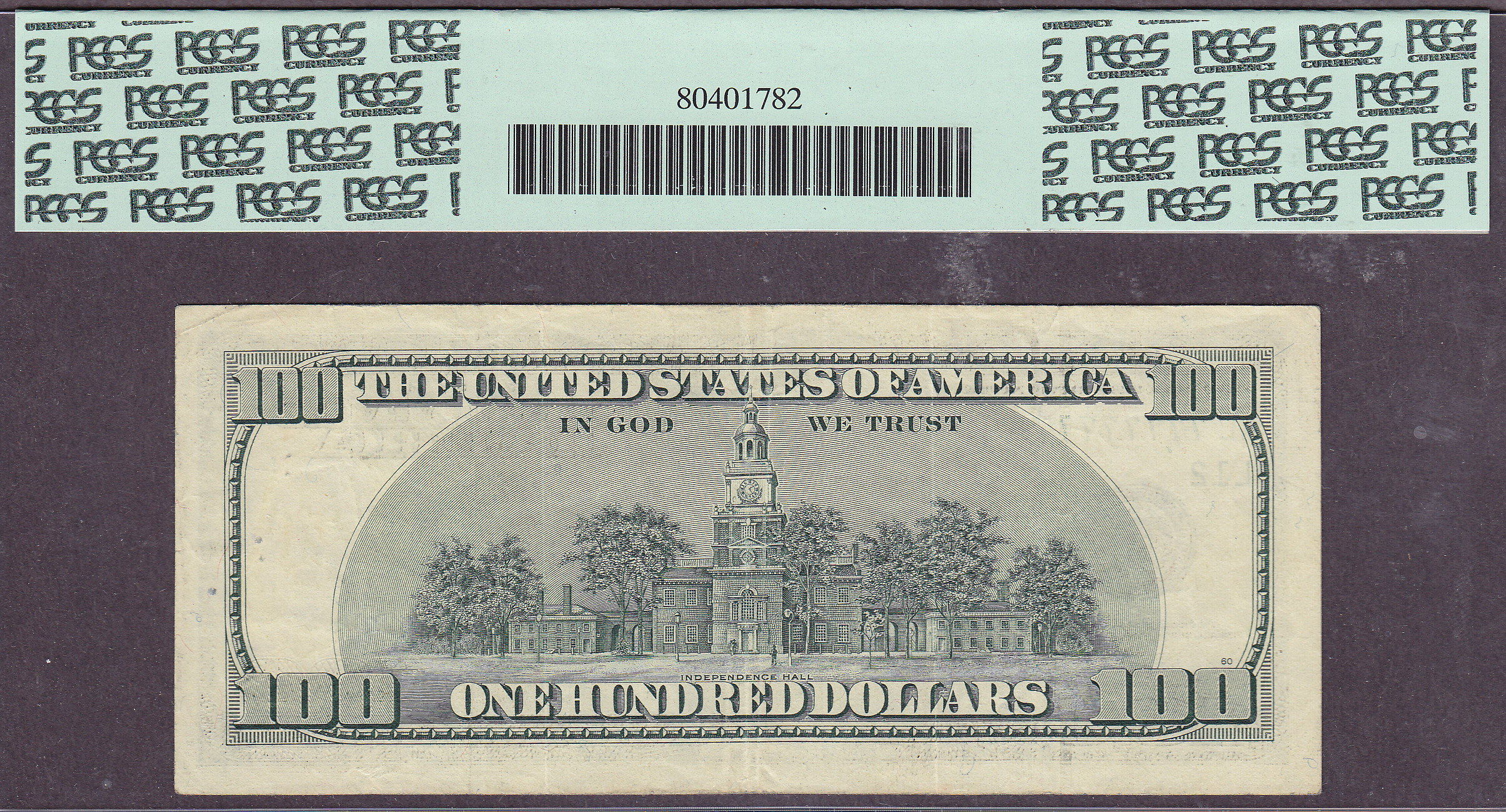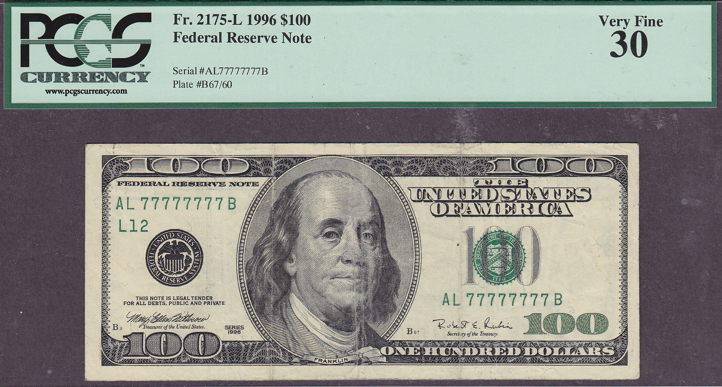 All sevens on a $100! This is the second solid serial number on a Big Head $100 FRN. This one is from the San Francisco district. There were two known on a BIG Heads. I owned both sets. I sold the other set 2 years ago in Long Beach. This serial number is AL77777777B. Although it is circulated there are no rips, tears or pinholes on it. These are always popular when you can find them. It is in a PCGS VF-30 holder.