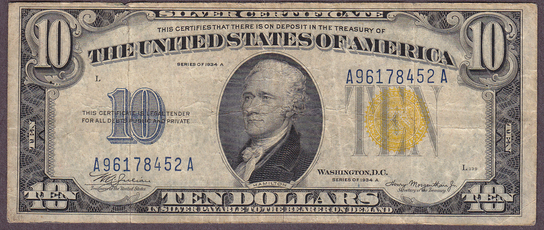 Fr.-2309 1934-A $10 Silver Certificate Ser. A96178452A Raw