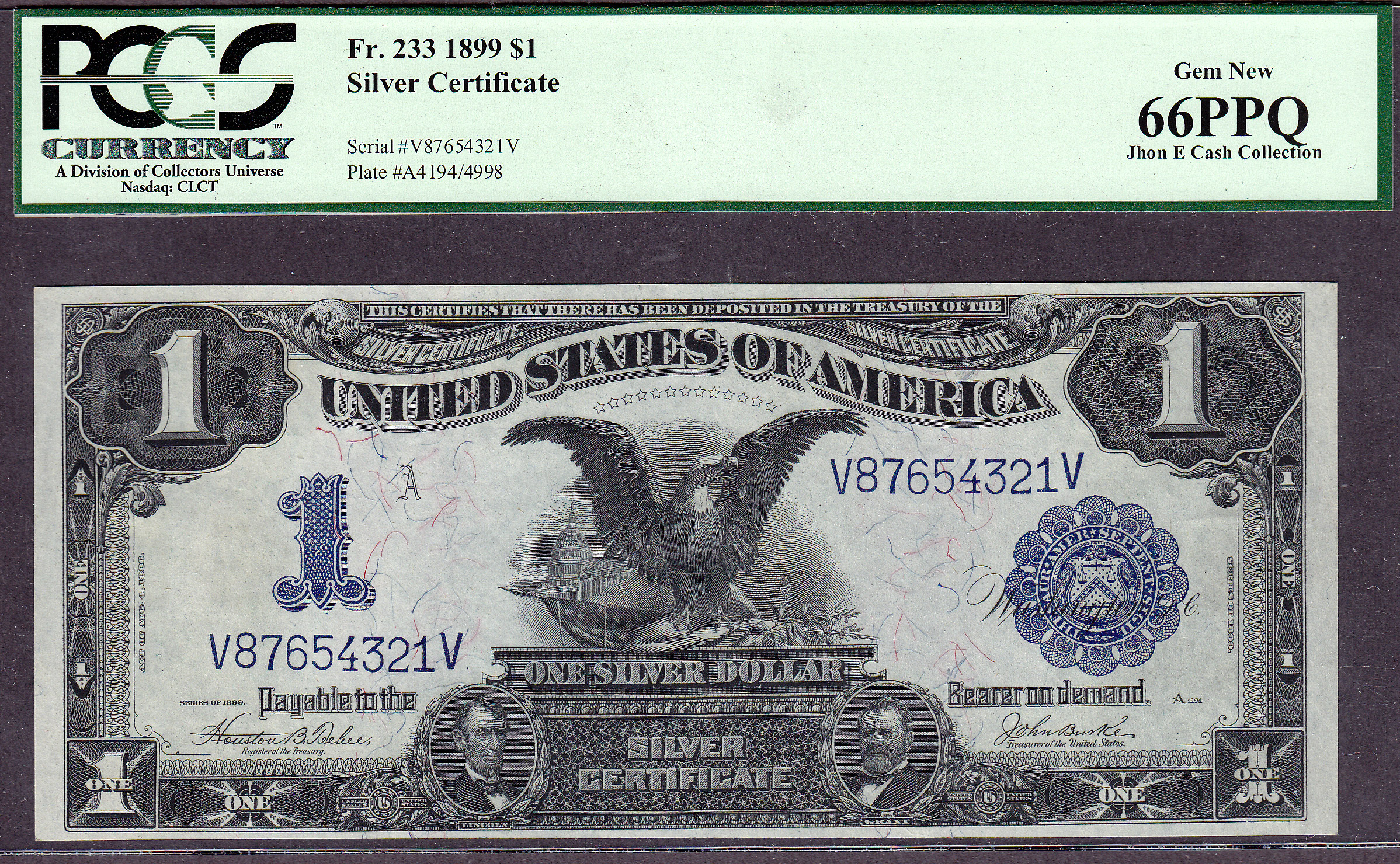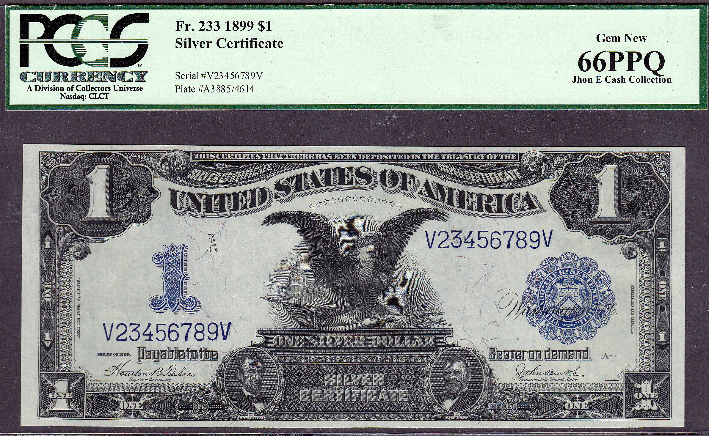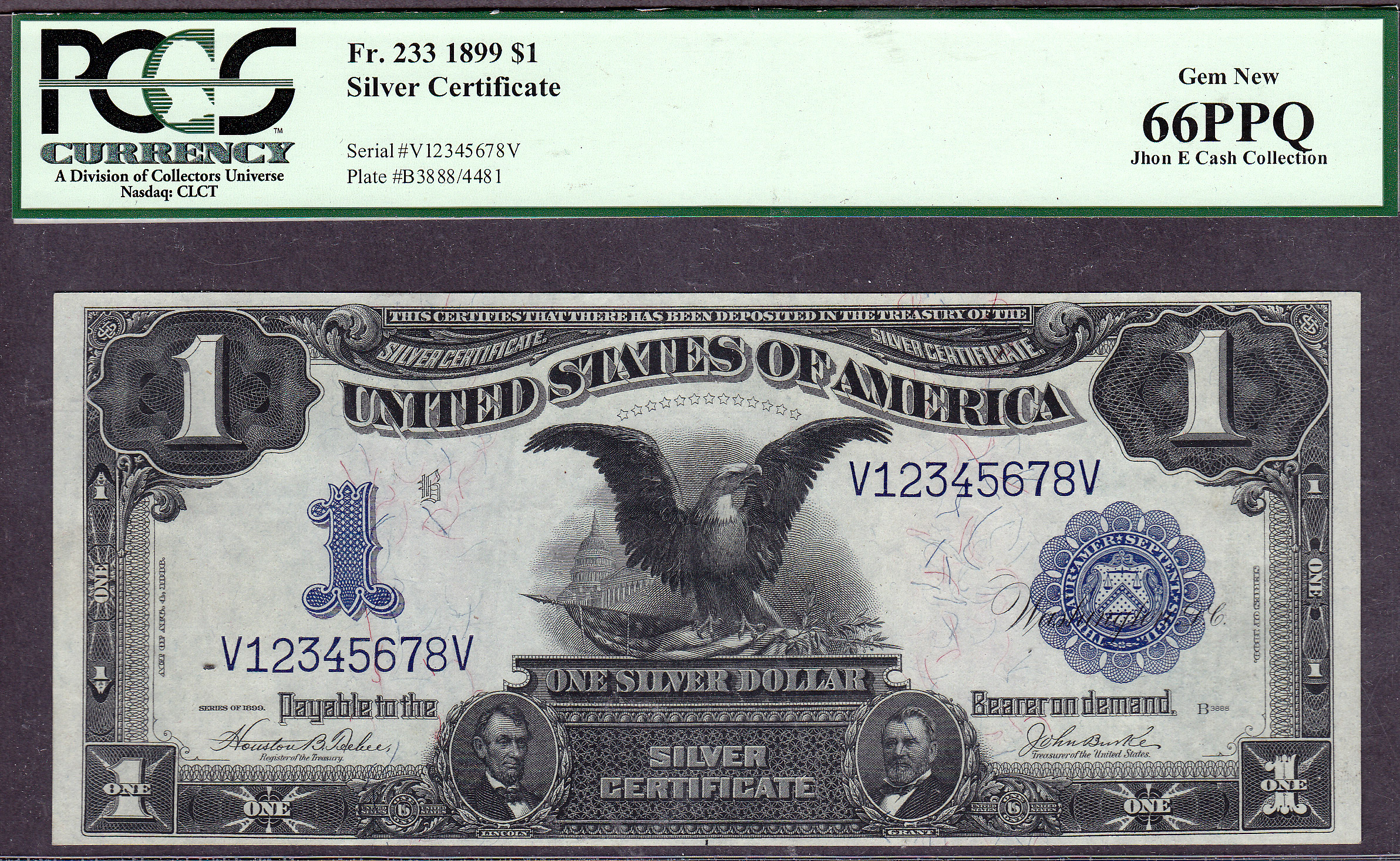 THIS INFAMOUS SET OF COMPLETE UP AND DOWN LADDERS IS PART OF THE "JHON E. CASH COLLECTION". This is a neat set of three Fr.-233 Black Eagles. The serial numbers are up-ladders V12345678V, V23456789V and the perfect down-ladder V87654321V. When you go to view this note, all eight of the Black Eagles will be displayed for your viewing. This set of Black Eagles are from the famous "Zollie Kelman" Black Eagle Collection that I purchased from Harry Jones at the Memphis Show in 2005. The Zollie Kelman Collection consisted of 86 Black Eagles that come in various serialized sets. These Presentation Notes were generally issued to Heads of State or Foreign Dignitaries as gifts by the US Treasury Department on behalf of the United States government. These Black eagles were never released to the general public for circulation. Zollie Kelman was the 3rd owner of this Black Eagle collection and now Jhon E Cash is the fourth owner. These are very special serialized sets and I will not break them up. You will find additional sets of these notes through the website, go view them as they are impressive. Thanks and enjoy them...as I have for so many years. Jhon E Cash