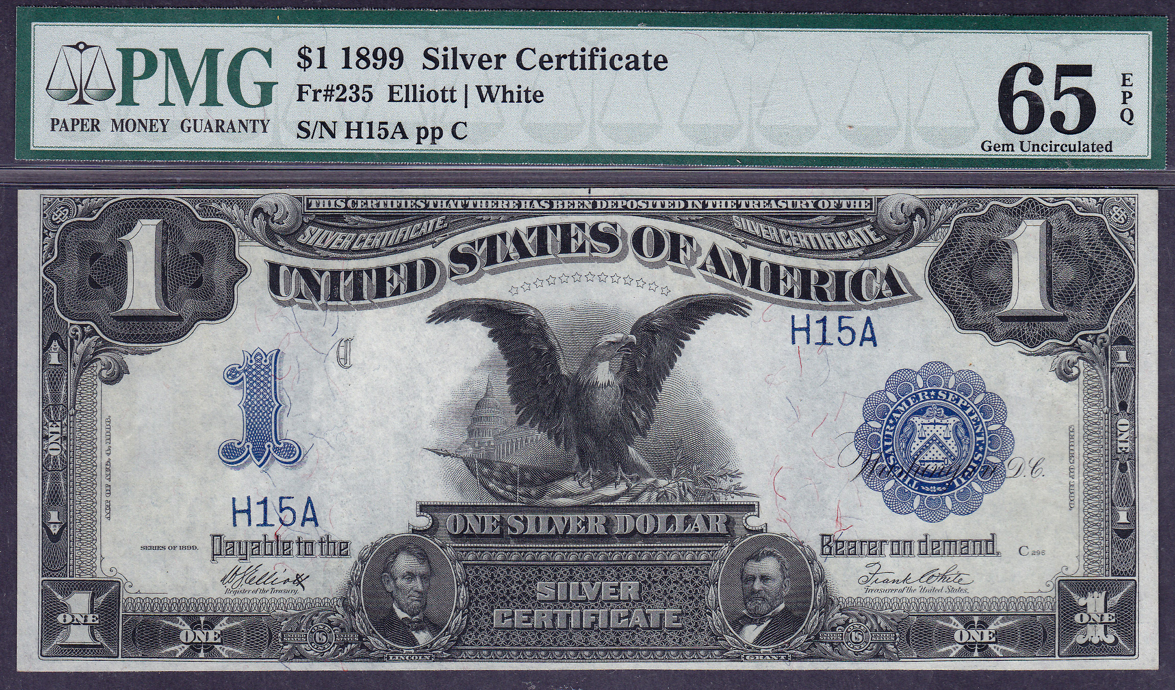 Fr.-235 1899 $1 Black Eagle Ser. # H15A PMG-65EPQ