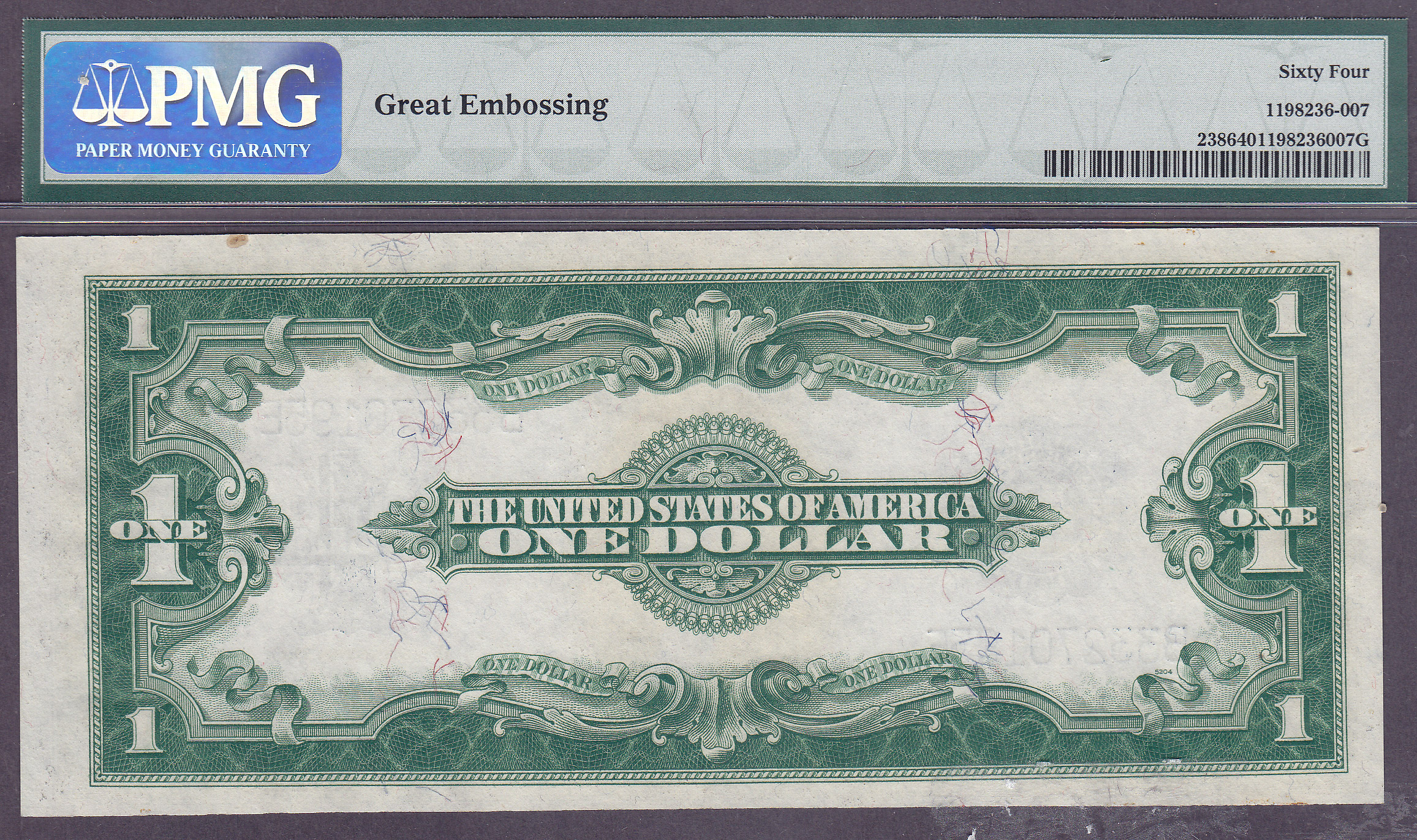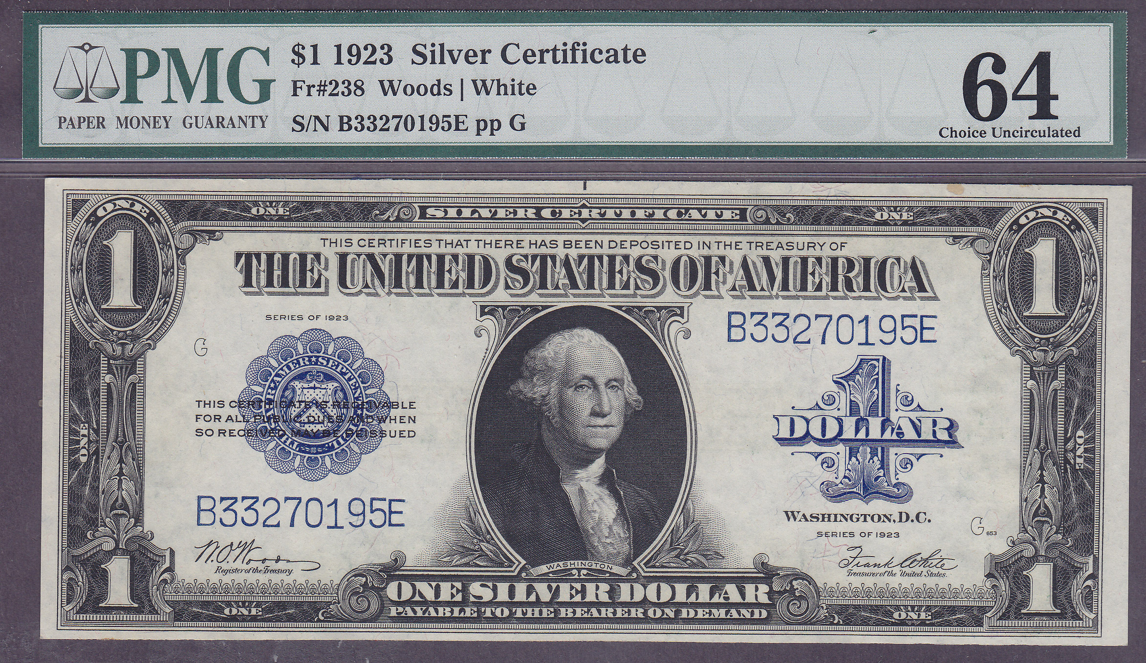 This is a note that I took in on trade. It is a Fr.-238 1923 $1 Silver certificate.The last $1 printed of the large size notes. It is one of PMG's first notes and has Great Embossing on the back. This was graded BEFORE they used the EPQ notation. At the shows, PMG will re holder it in a PMG-64EPQ holder for a $20 fee. The serial number is B33270195E and is totally problem free. It definitely is priced to sell!