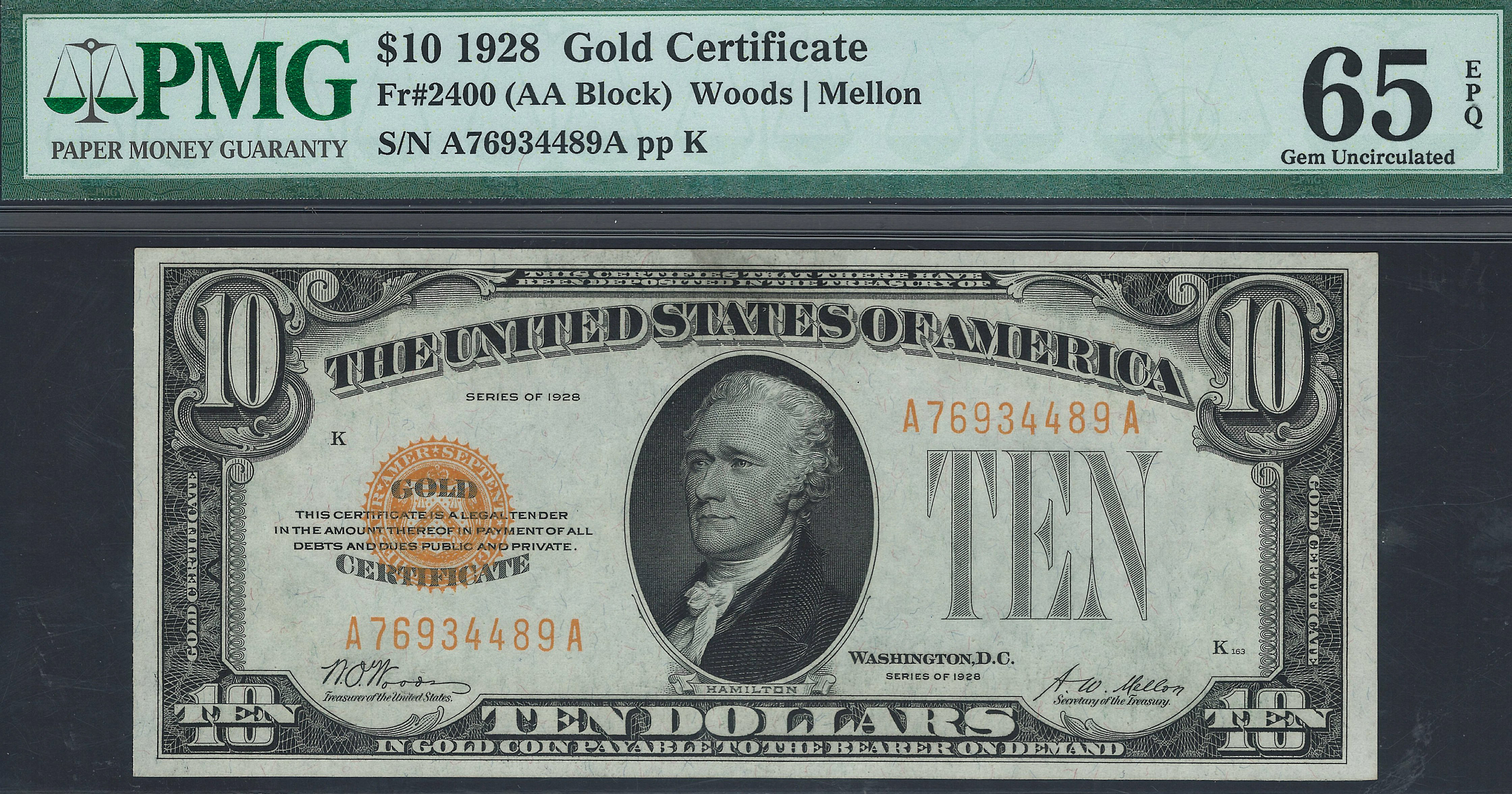 Fr.-2400 1928 $10 Gold Certificate Ser. A76934489A PMG 65EPQ