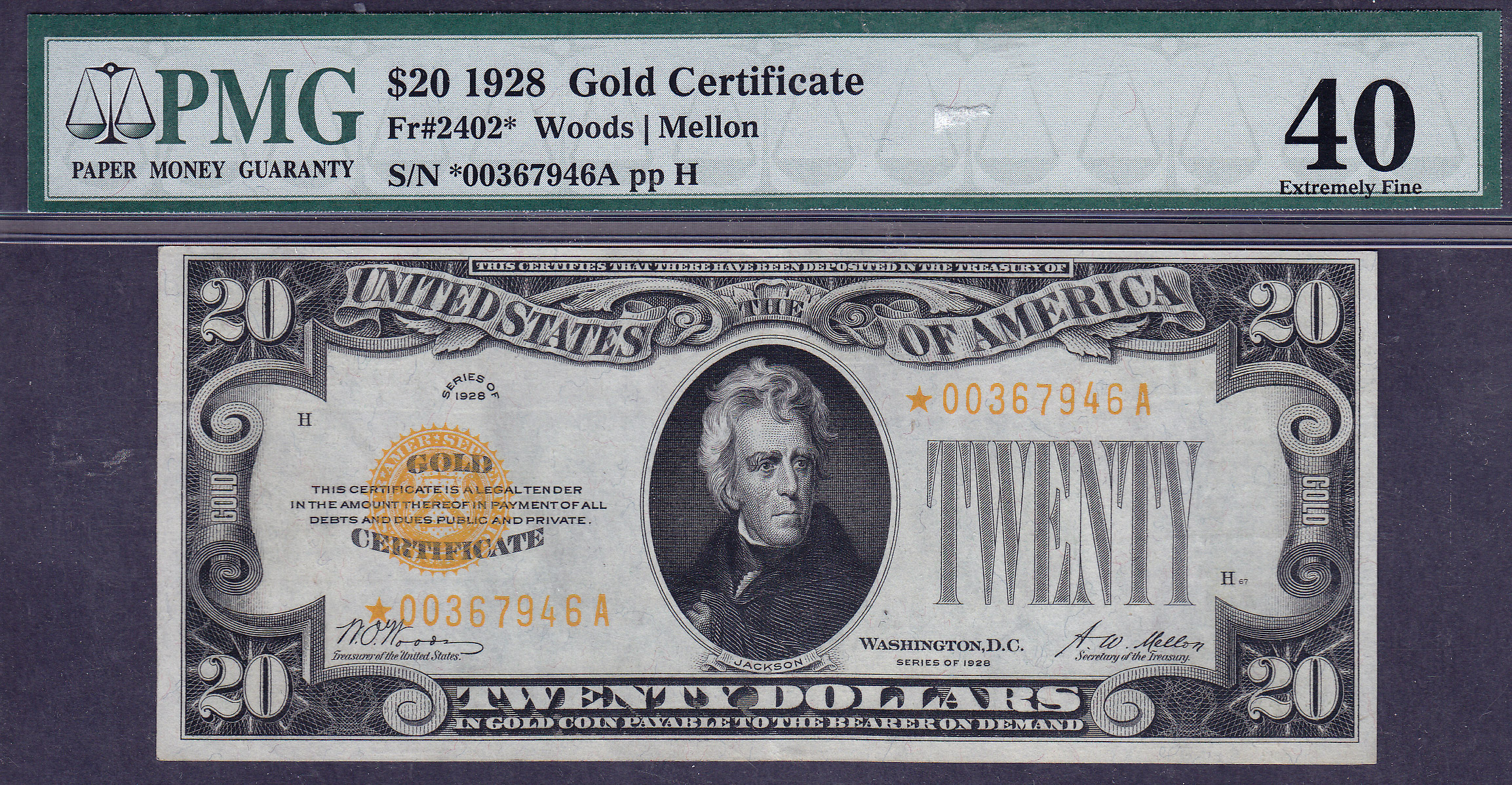 Fr.-2402 1928 $20 Gold Certificate Ser. # *00367946A PMG-40