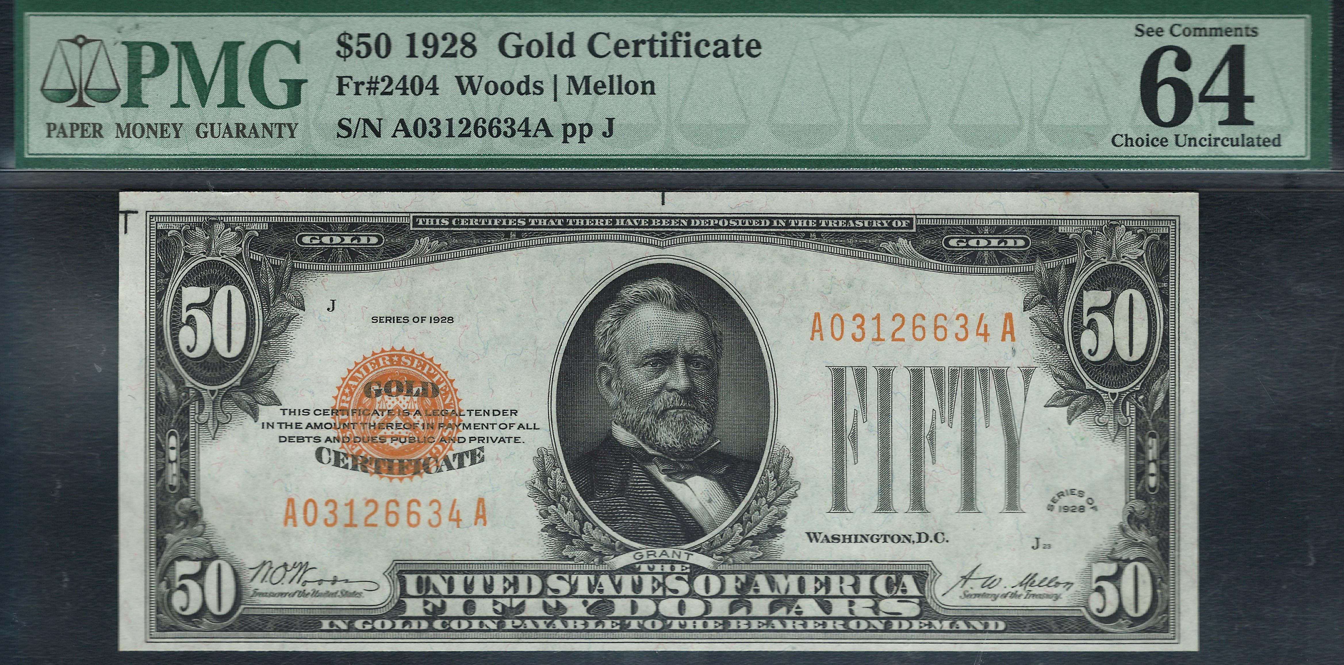 Fr.-2404 1928 $50 Gold Certificate Ser. A03126634A PMG-64