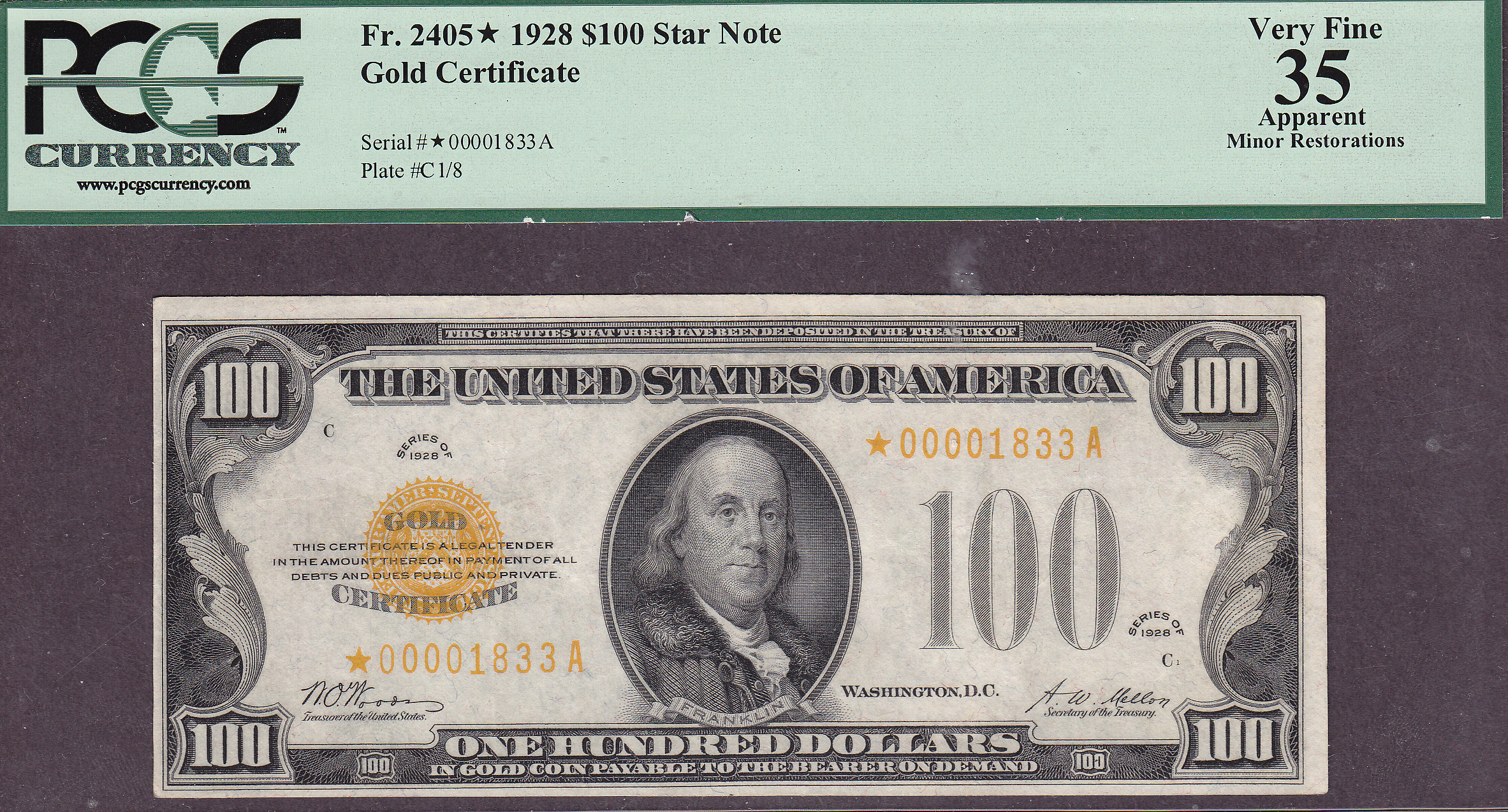 POP2/1 finer. I know most of you collectors have never seen one of these. It is a 1928 $100 Gold Certificate STAR note. There are less than 9 or 10 known and this is the SECOND FINEST known according to the PMG and PCGS pop reports with a PCGS-50 being higher. This note along the 1928 $50 Gold Certificate STAR note that I have on the website came out of an old 1980 collection. The $50 Gold STAR is also the second finest known. Neither star notes have ever been offered to the public or through any auction house. Both star notes are new to the census!