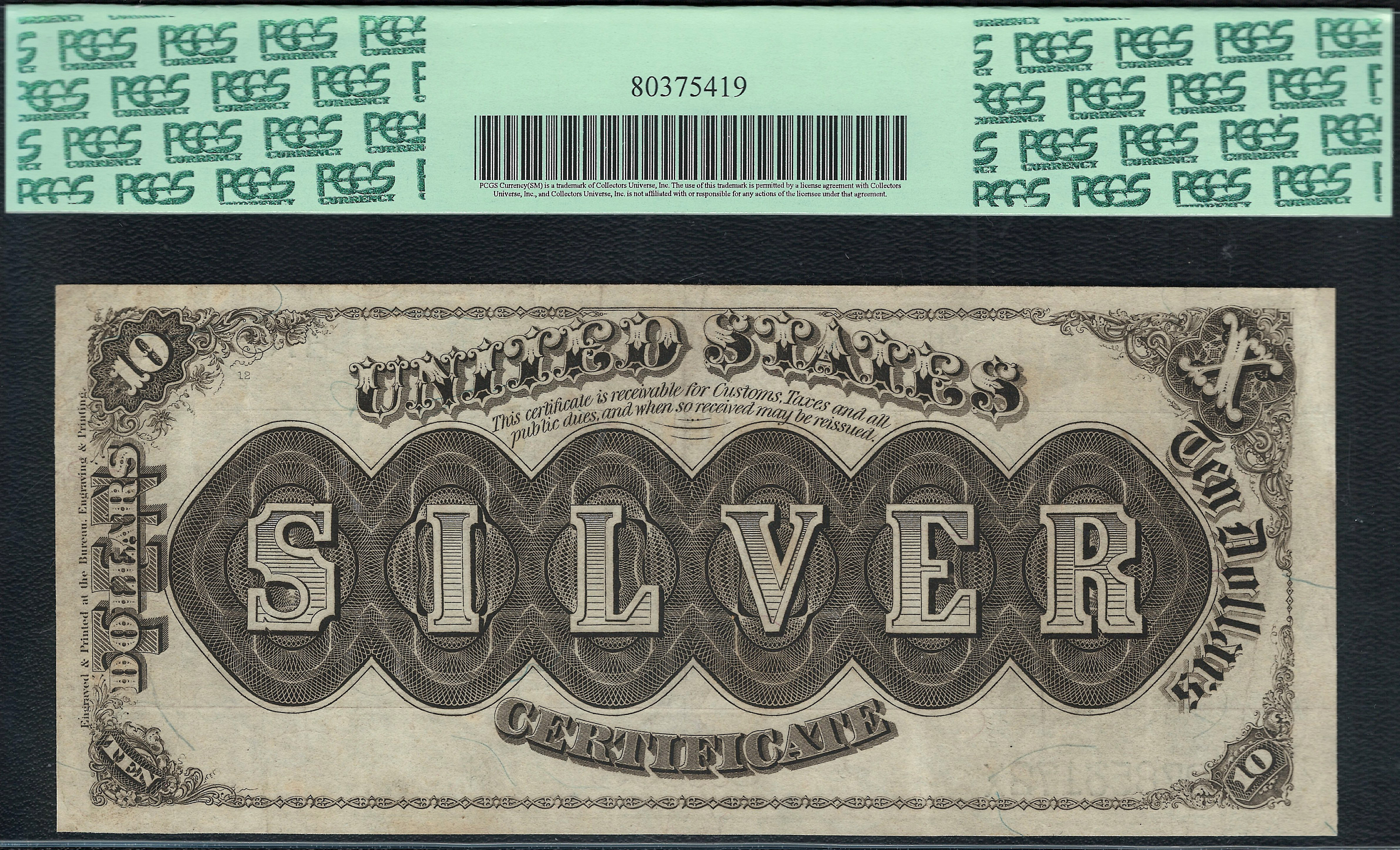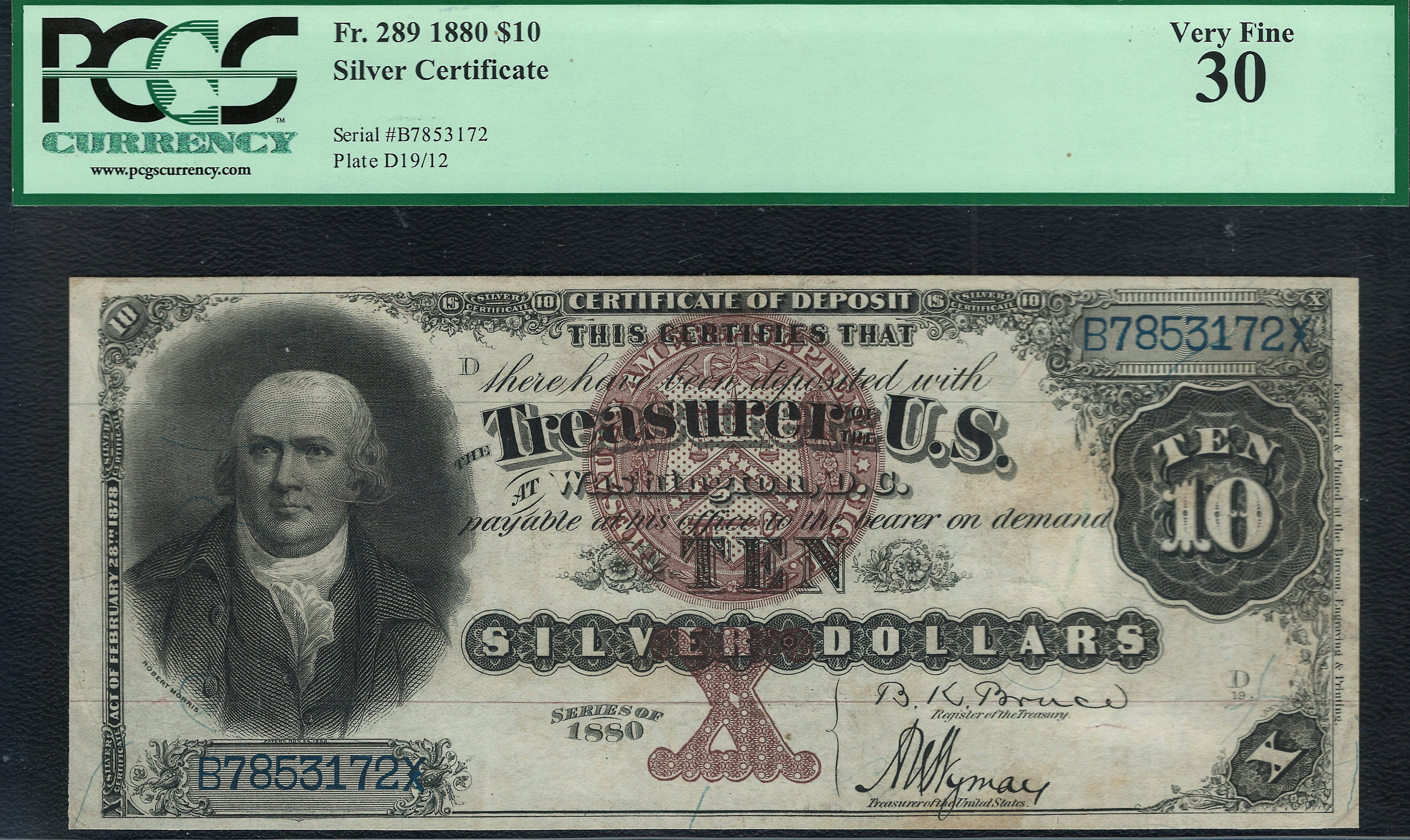 This is a Fr.-289 1880 $10 Silver Certificate commonly referred to as the Morris Note or Black Back. The front shows the bust of Robert Morris who was one of the signers of the Declaration of Independence, and superintendent of Finance from 1781 to 1784. This famous note is also sometimes referred to as the Black Back Note because of the black and brownish back design. Regardless, the back design is one of my favorites designs. I actively seek these $10 and $20 1880 silvers certificate at every show. The main issue you will see on most of these is the back design shows wear very easy. Normally you will see a frayed white horizontal fold across the middle with a whitish wear and tear. The last few I had showed the white horizontal fold line across them. The reason I jumped on this one is because there is no wear and tear tell-tell sign. This note walked up to my table at one of the last shows and I bought it. I paid a little more for it, but to me it was well worth every penny to own it in this shape. The Fr.-289 features the Bruce/Wyman signature combo and the Large Brown Spiked Seal, which is my favorite seal of all. I like any note with the large brown spiked seal.I am proud to say that there are no rips, tears, pinholes or bank marks. The margins are great and even for the grade. The brown ink has retained it color very well for a 126 year old note. The serial number is B7853172 and it is in a PCGS Very Fine-30 holder. This Morris Note will end up in someone high end collection!