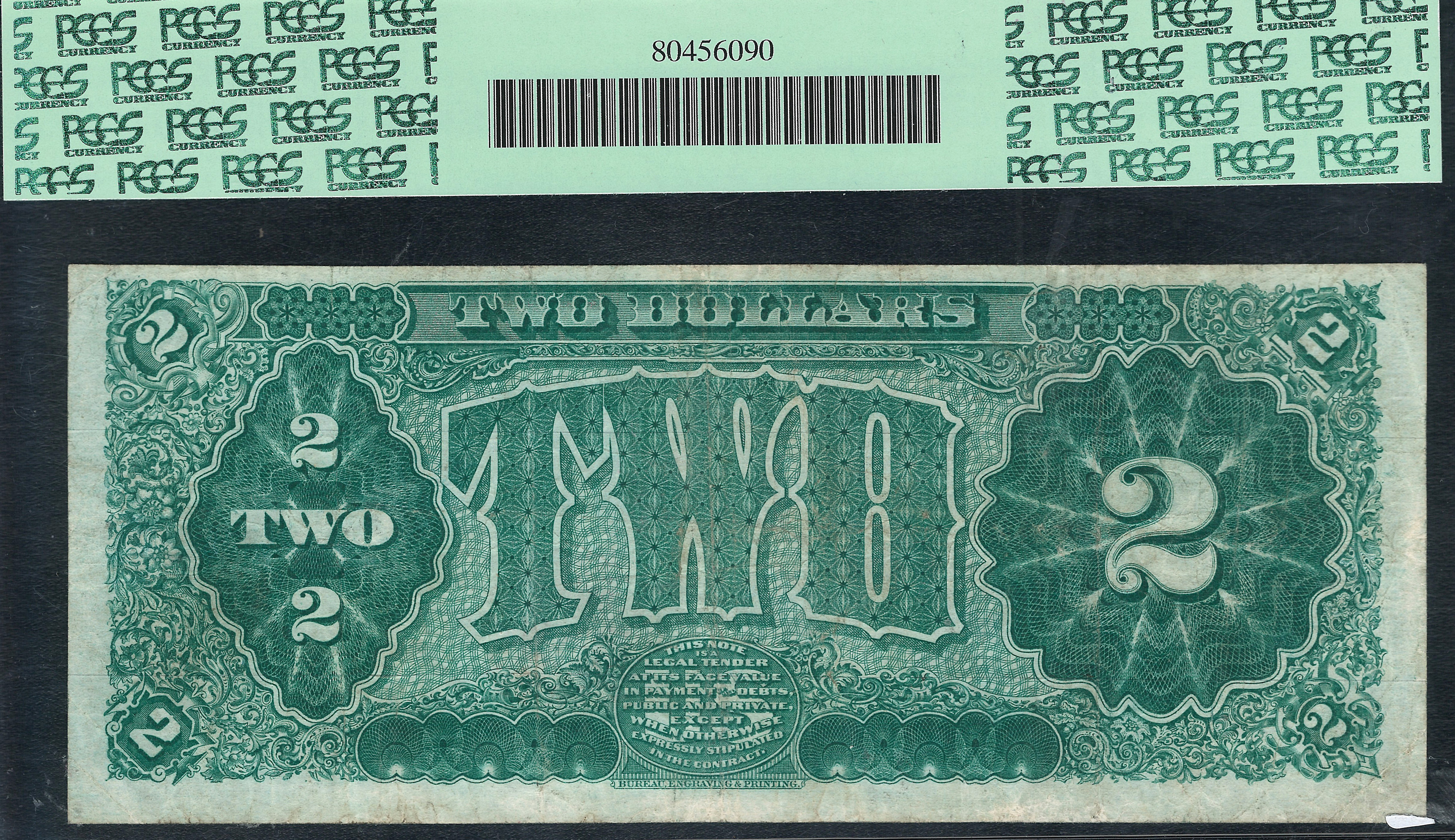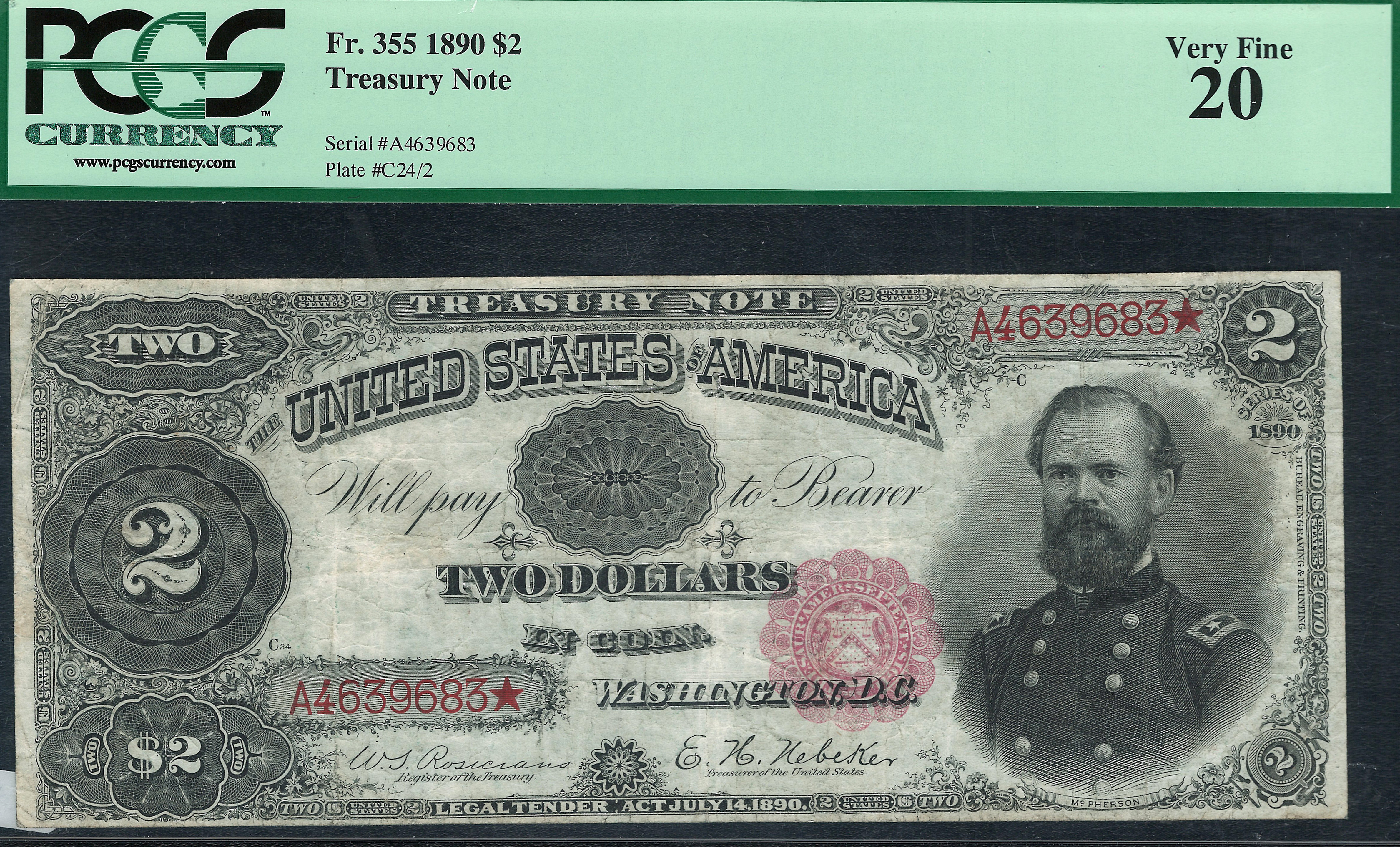 This is a nice example problem free example of the 1890 $2 Treasury Note commonly referred to as the McPherson Note. General James McPherson (1828-1864) was a Union Army General who was a hero of the Battle of Vicksburg. He was killed on July 22nd, 1864 at the Battle of Atlanta and became the second highest ranking officer killed during the Civil War. I have always loved this note because of the intricate designs on the left front and especially the back. There are NO rips, tears, pinholes or other problems. There are four squared corners and even margins both front and back. This note also features nice bright red serial numbers with a small red scalloped seal to the right. It you need a real good deal on a very nice midrange 1890 $2 Treasury Note, look no further. The serial number is A4639683 and is in a very conservative PCGS-VF20 holder.