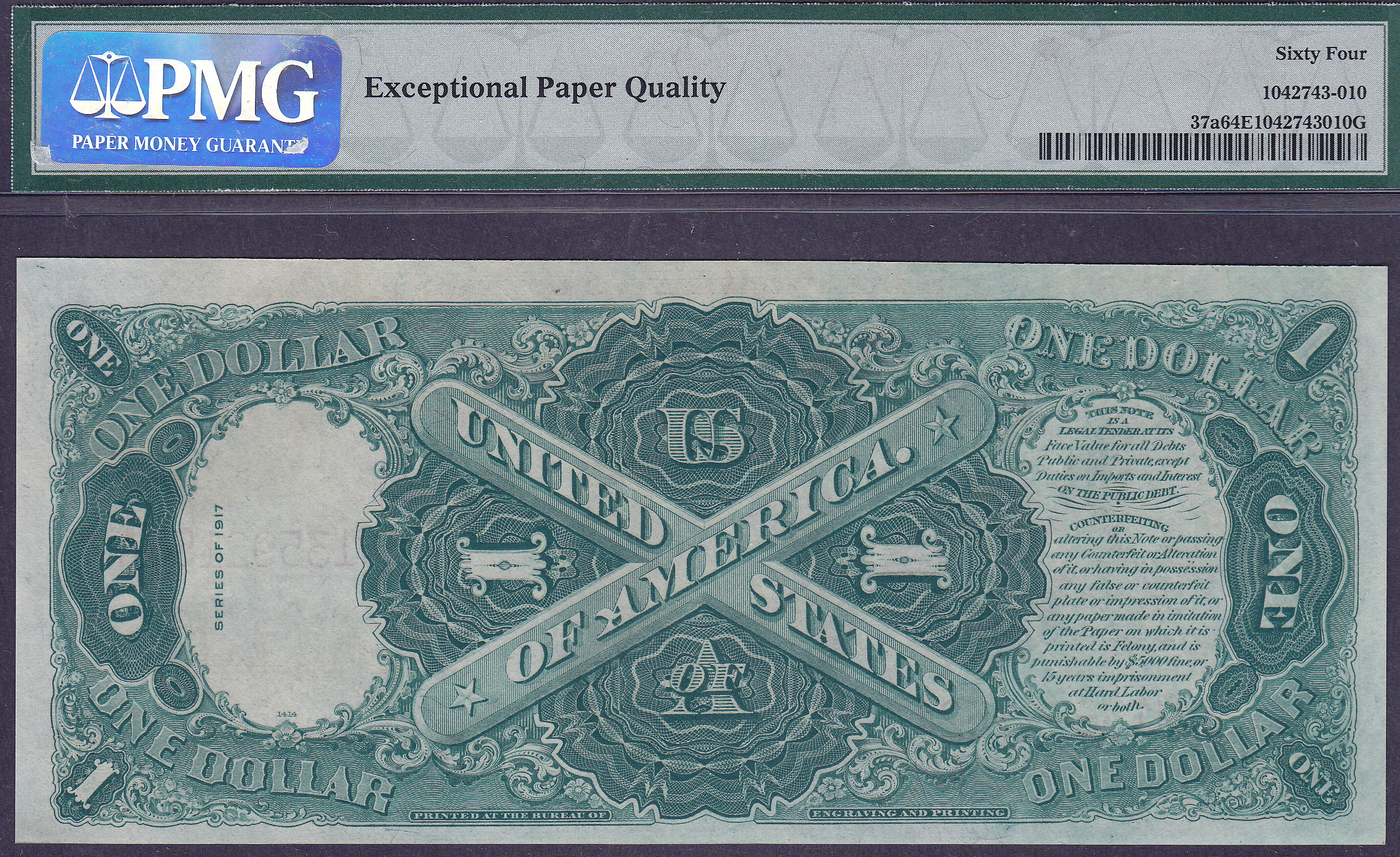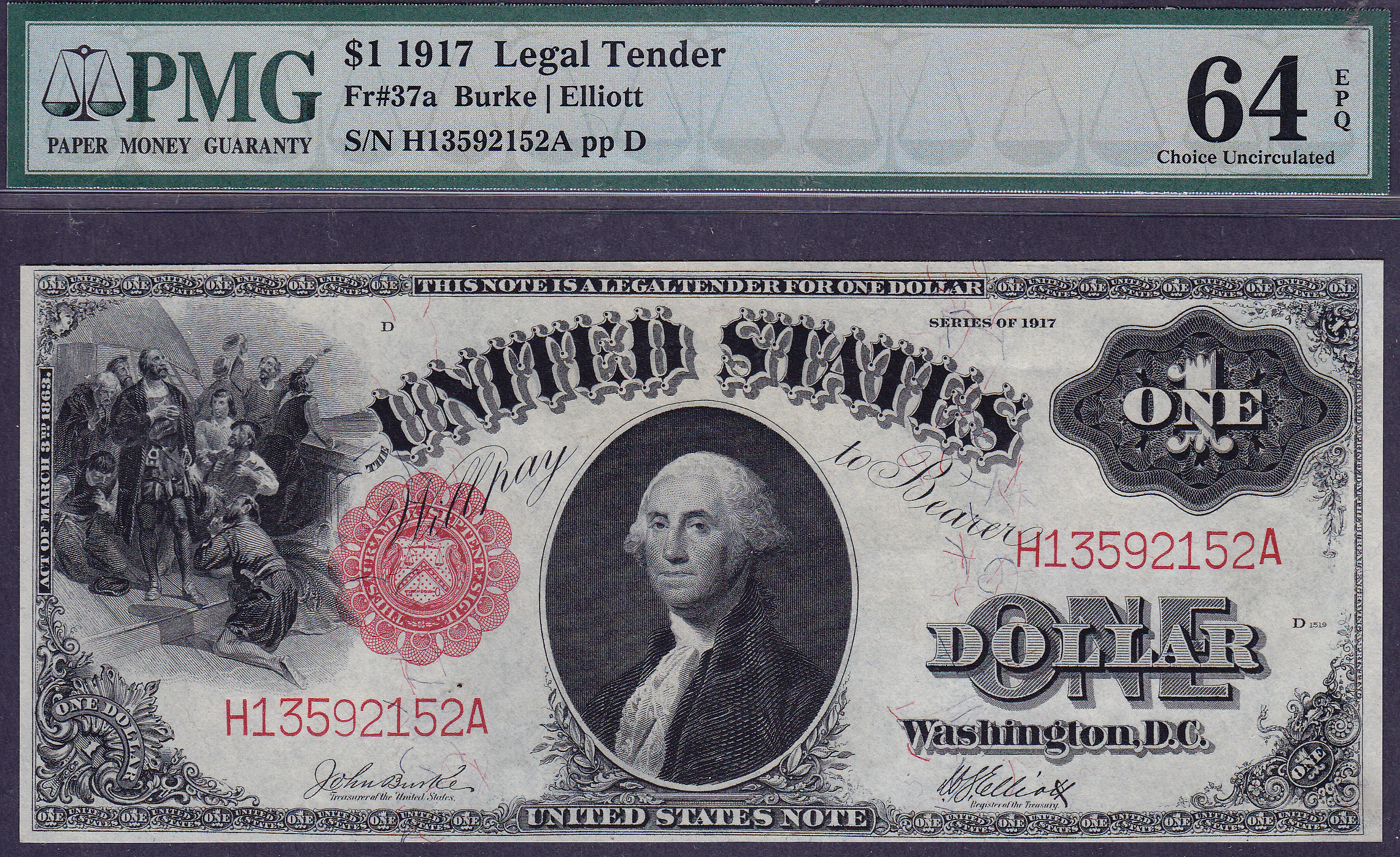 There are only 104 examples of this reverse signature combination note. The Fr-37a at was at one time considered a error note, until it was given its own FR number. This 1917 $1 Legal Tender note has pleasing margins all around and is fully original, supplemented by the lipstick red scalloped seal on the front. The serial number is H13592152A and is in a PMG-64PPQ holder. Funny how this note is missing from most collections.