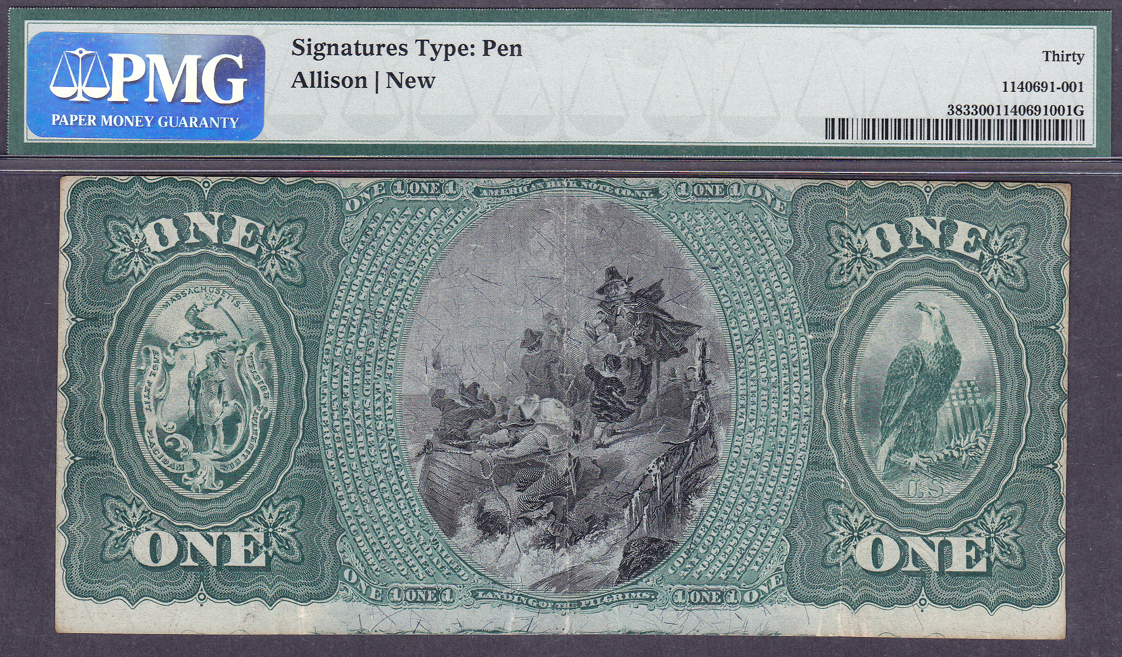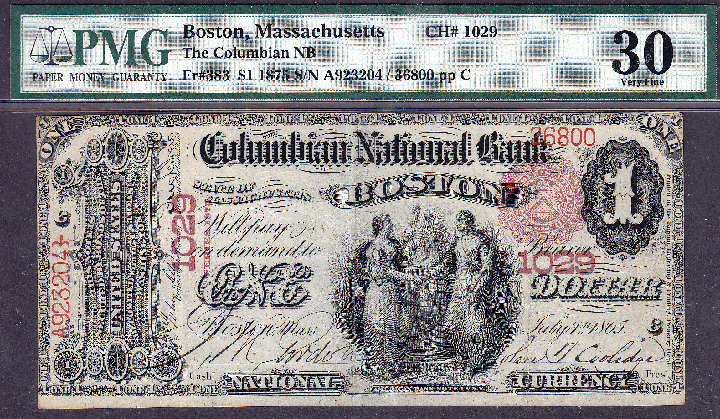 This is a very rare Note. It is an 1875 $1 Original from the Columbian National Bank of Boston. It is UNLISTED in Kellys new book. It is the Second Finest Known on the bank from this series. These type notes have completely dried up, period. Try acquiring one. The paper quality is excellent, not limp or pressed and cleaned like so many of the others and the superb colors of the serial numbers and Charter number are remarkable. You will be hard pressed to try and find a nicer one on this tough bank.