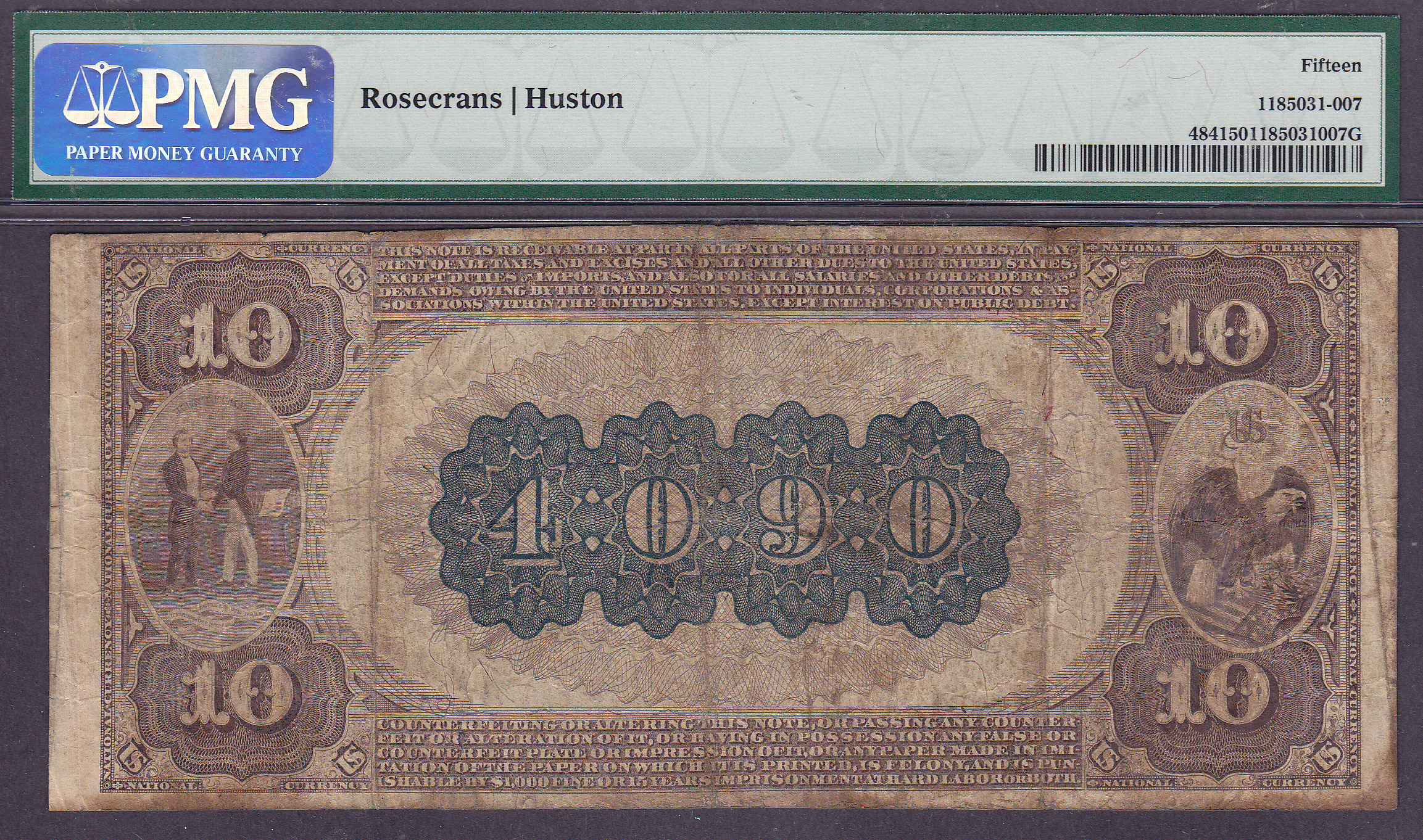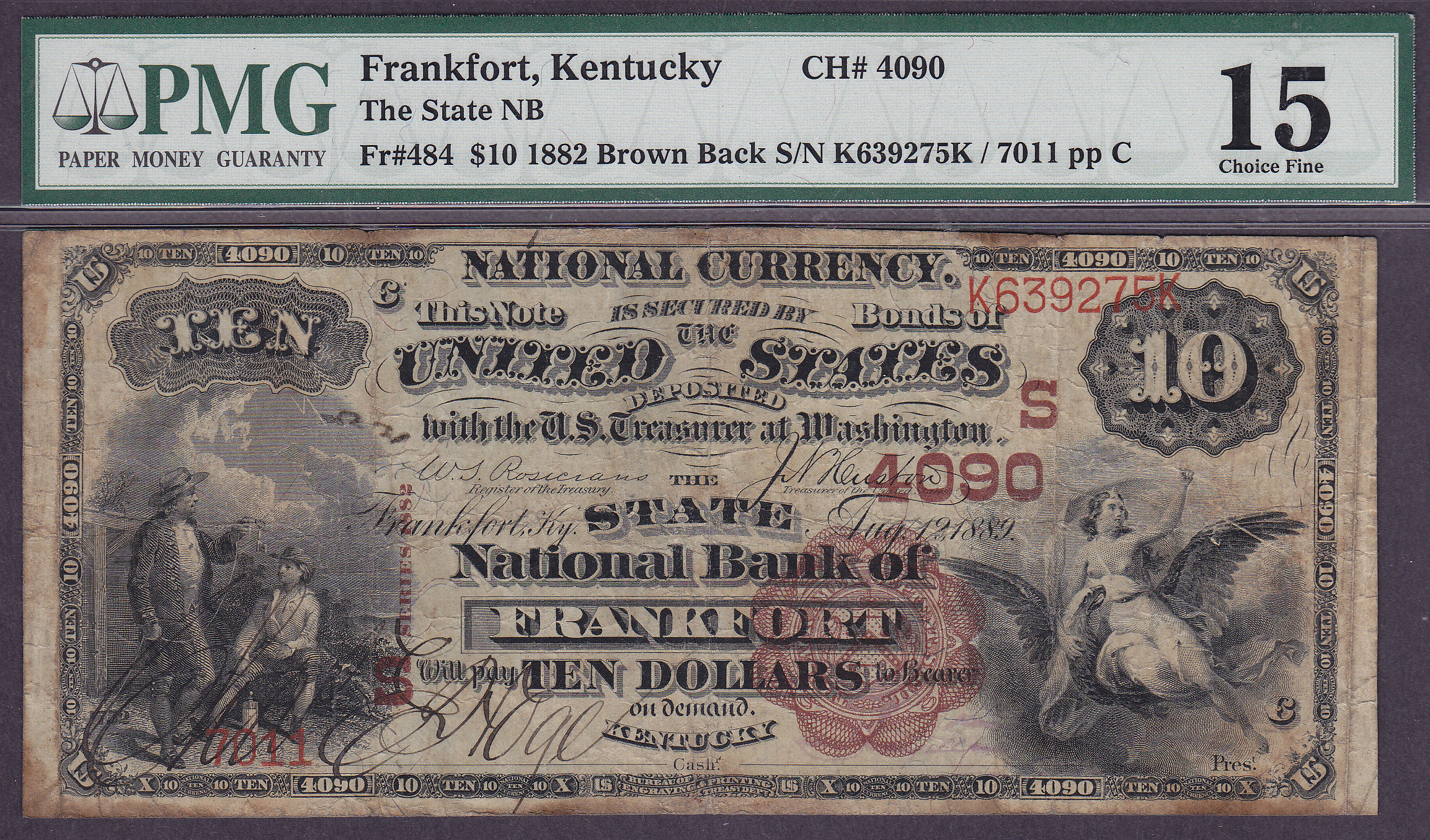 Here is a Fr.-484 or a 1882 $10 Browb Back wit a Charter # of 4090. It is from The State Nationa Bank of Frankfort, It has been graded at a PMG F-15. THERE ARE ONLY FOUR OF THESE 1882 $10 bROWN BACKS KNOWN FROM THIS BANK.