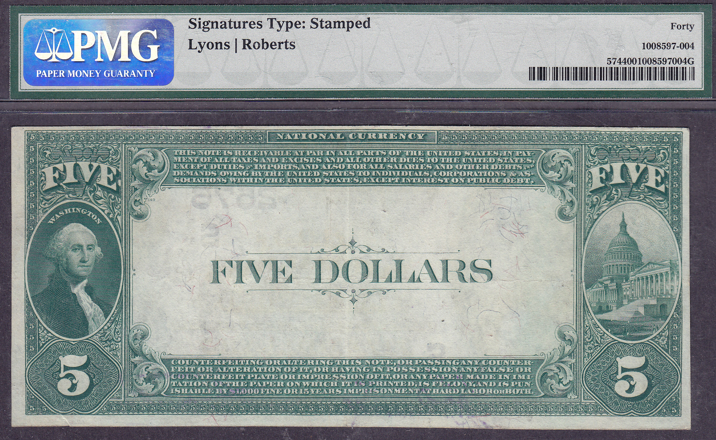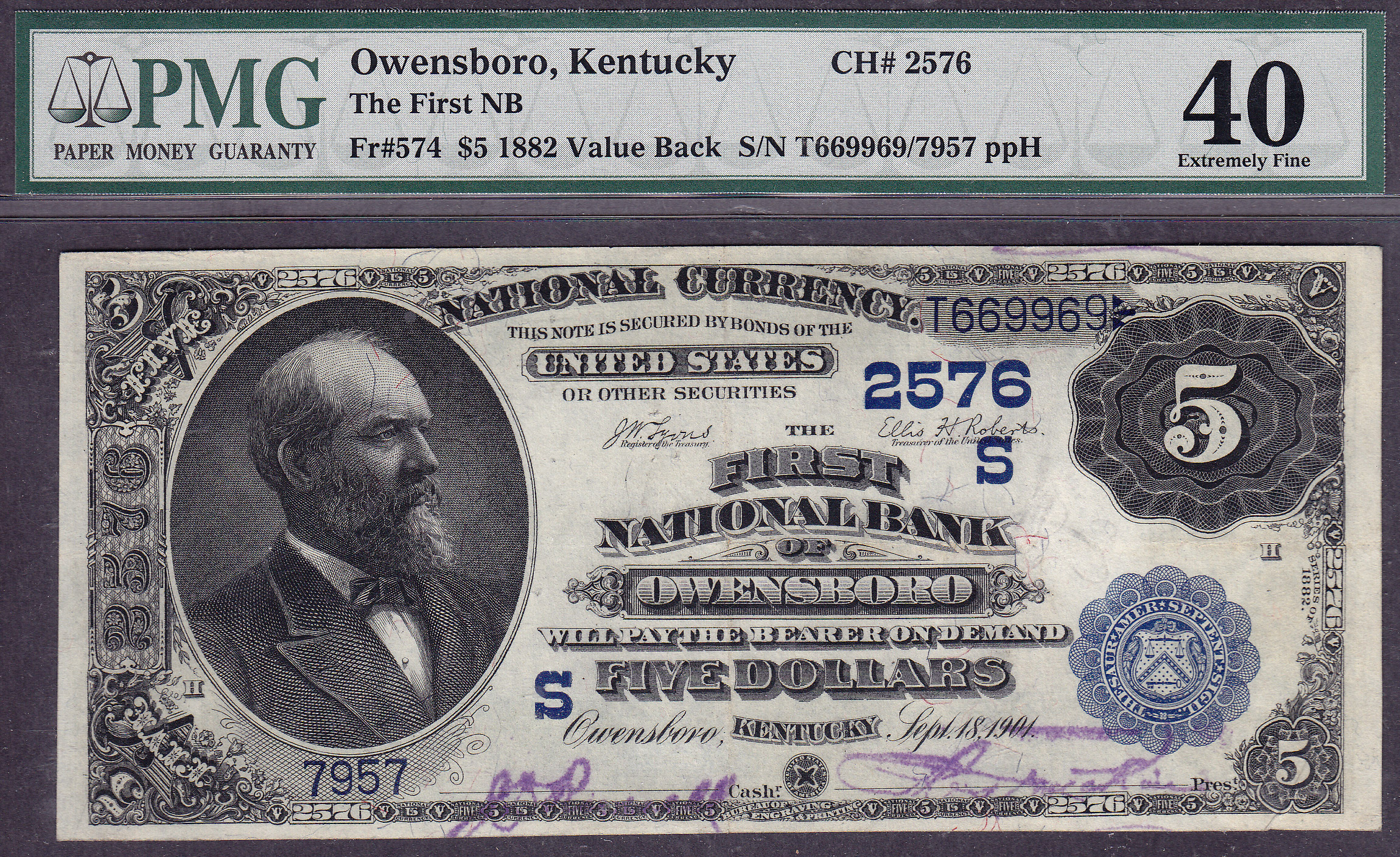 This is a very nice 1882 $5 Value Back from The 1st National Bank of Owensboro, KY. The serial number is 7967. It has been graded as a PMG EF-40. The Charter # is 2605. There are only 4 known on the bank. This is almost a perfect note with ample margins and no hard folds. (See the Back) The signatures are "Hand Stamped". A real beauty for a scarce for a 128 year old Value Back.
