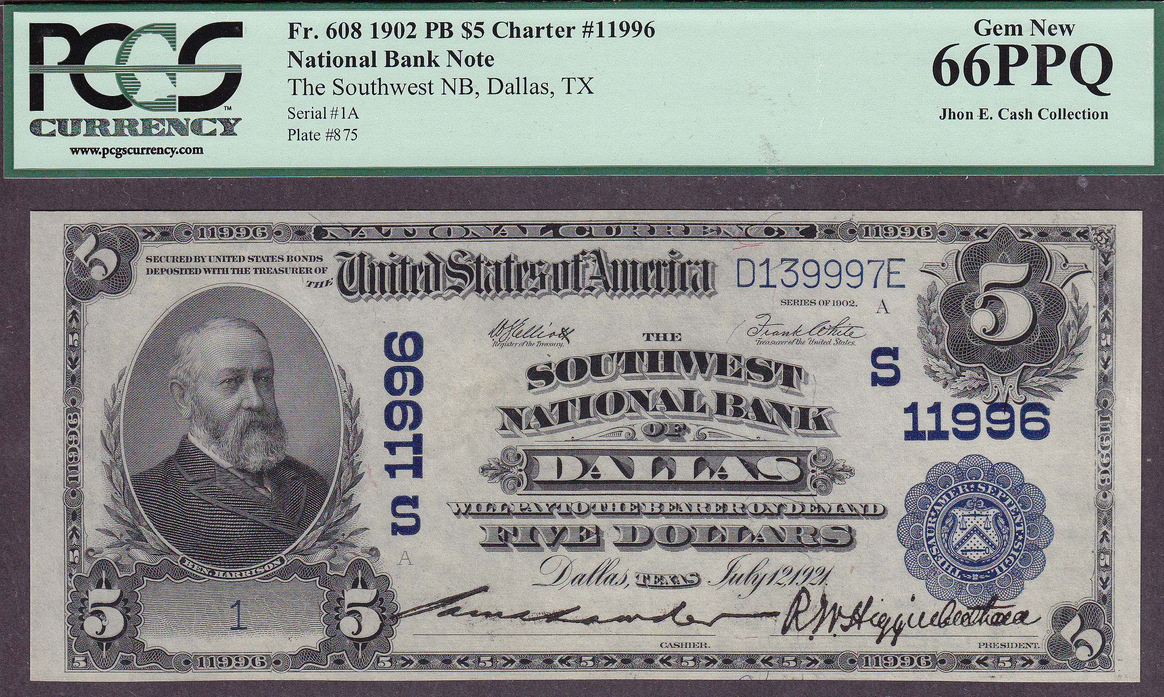 This is one of my favorite all time National Bank Notes. It is a 1902 $5 Plain Back from the Suthwest National Banl of Dallas, Texas. It is also the FIRST 1902 PB $5 bill ever printed on the bank. Not only is it a serial number one note it is also a superb GEM-66 by PCGS. This note currently resides in the Jhon E Cash Collection. Check out the scans it is a unblievable neat serial number one note.