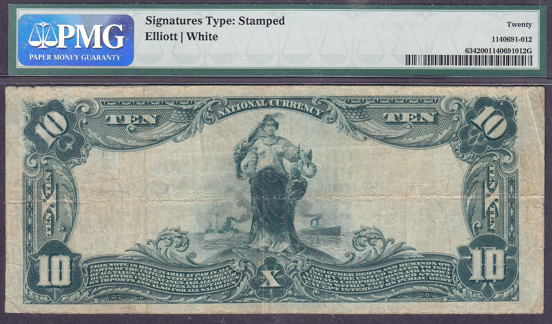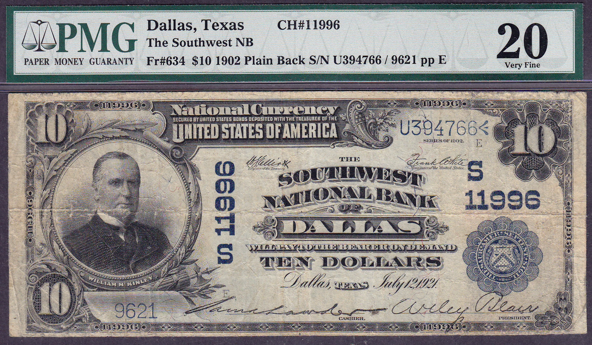 This 1902PB $10 Plain Back from the Southwest National Bank of Dallas is in very nice condition. The serial # is 9621 and the charter # is 11996. It has been housed in a PMG VF-20 holder.