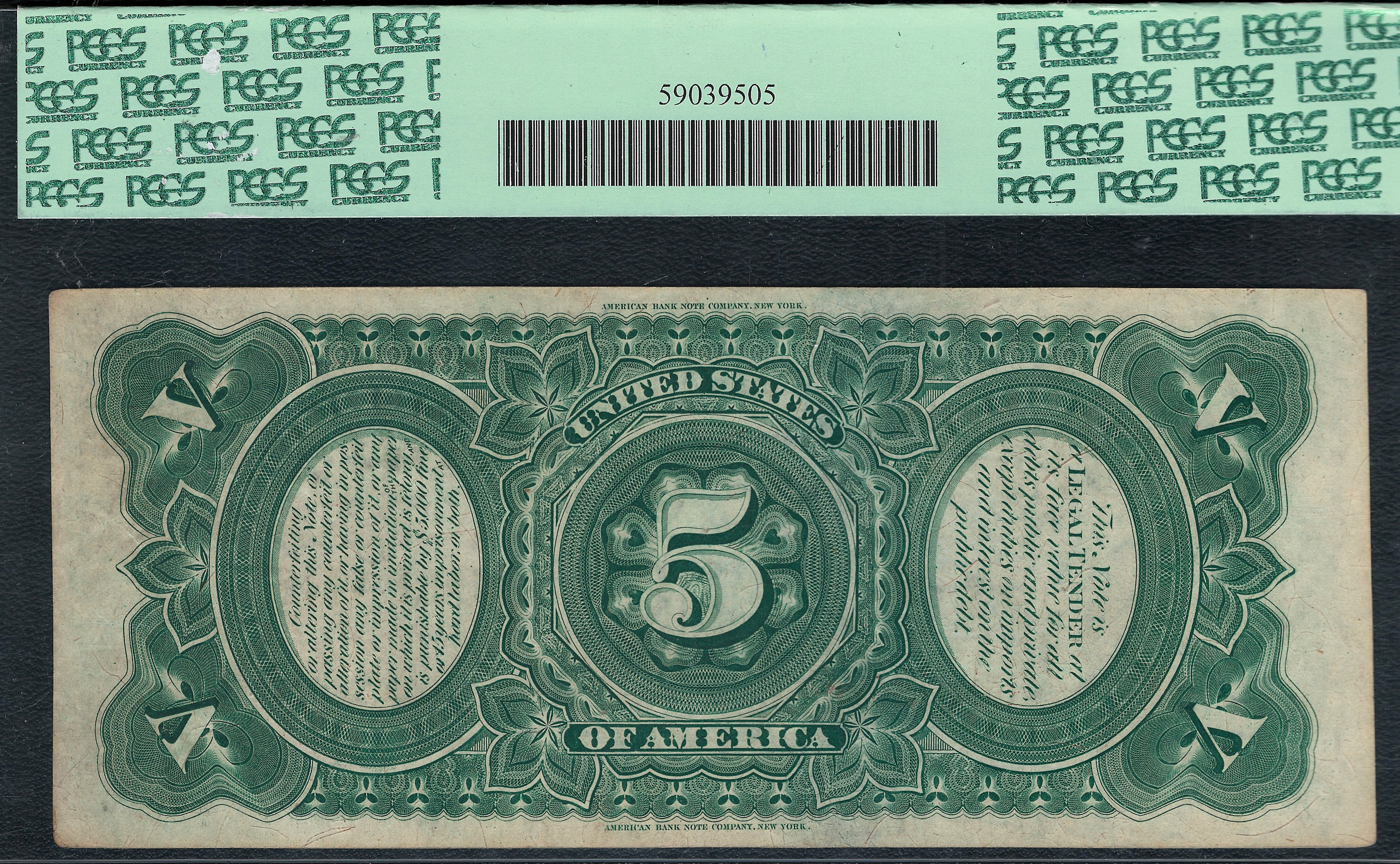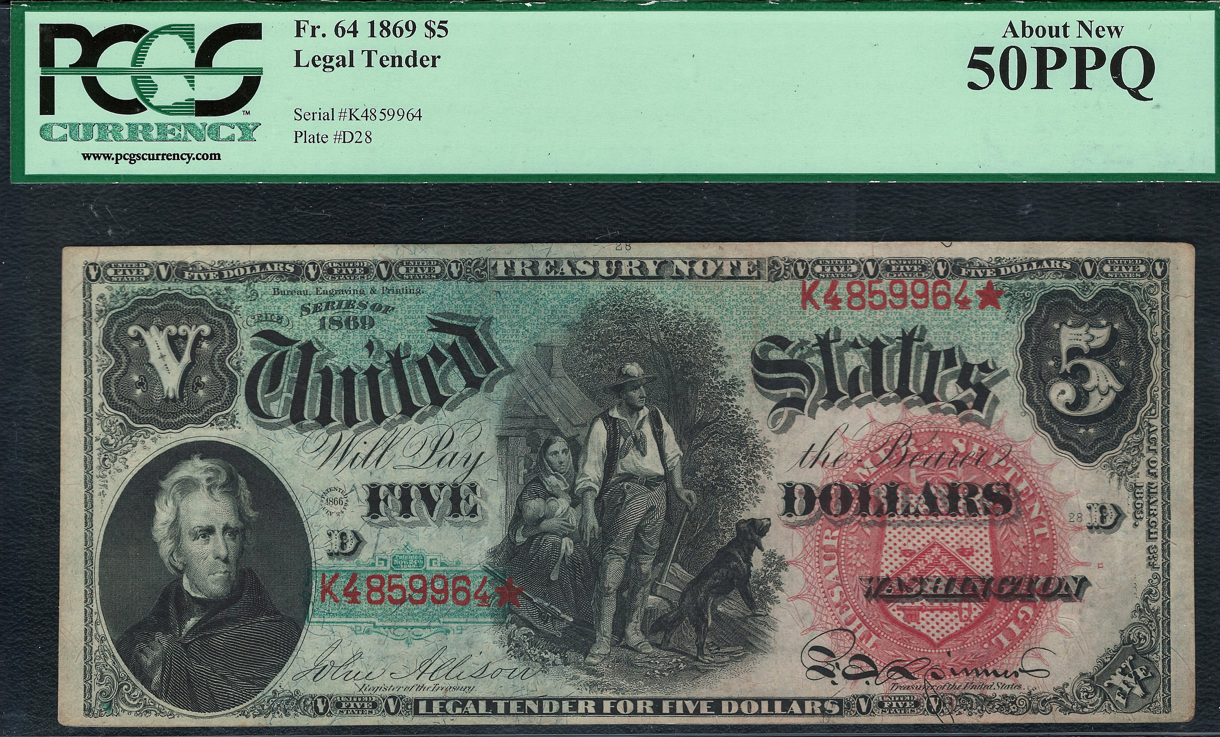This is a Fr.-64 1869 $5 Legal Tender commonly referred to as a Rainbow Note because of its beautiful rainbow colors across the face. The serial number is K4859964 and resides in a PCGS-50PPQ holder. The Rainbow series of Legal Tenders are one of the most collected of all US notes because of their beauty. This one is totally original with no rips, tears, pinholes or markings. It is marked at wholesale prices.