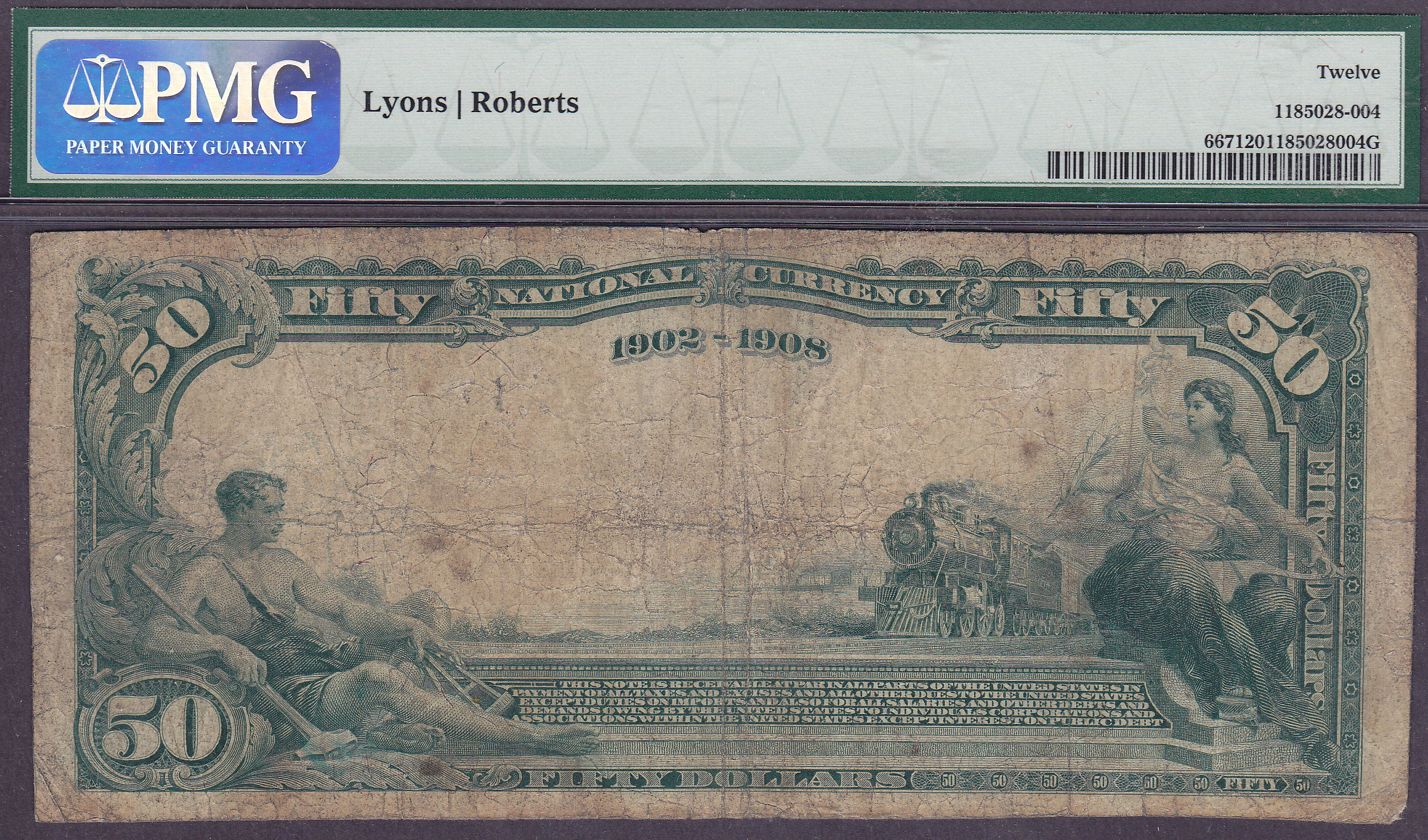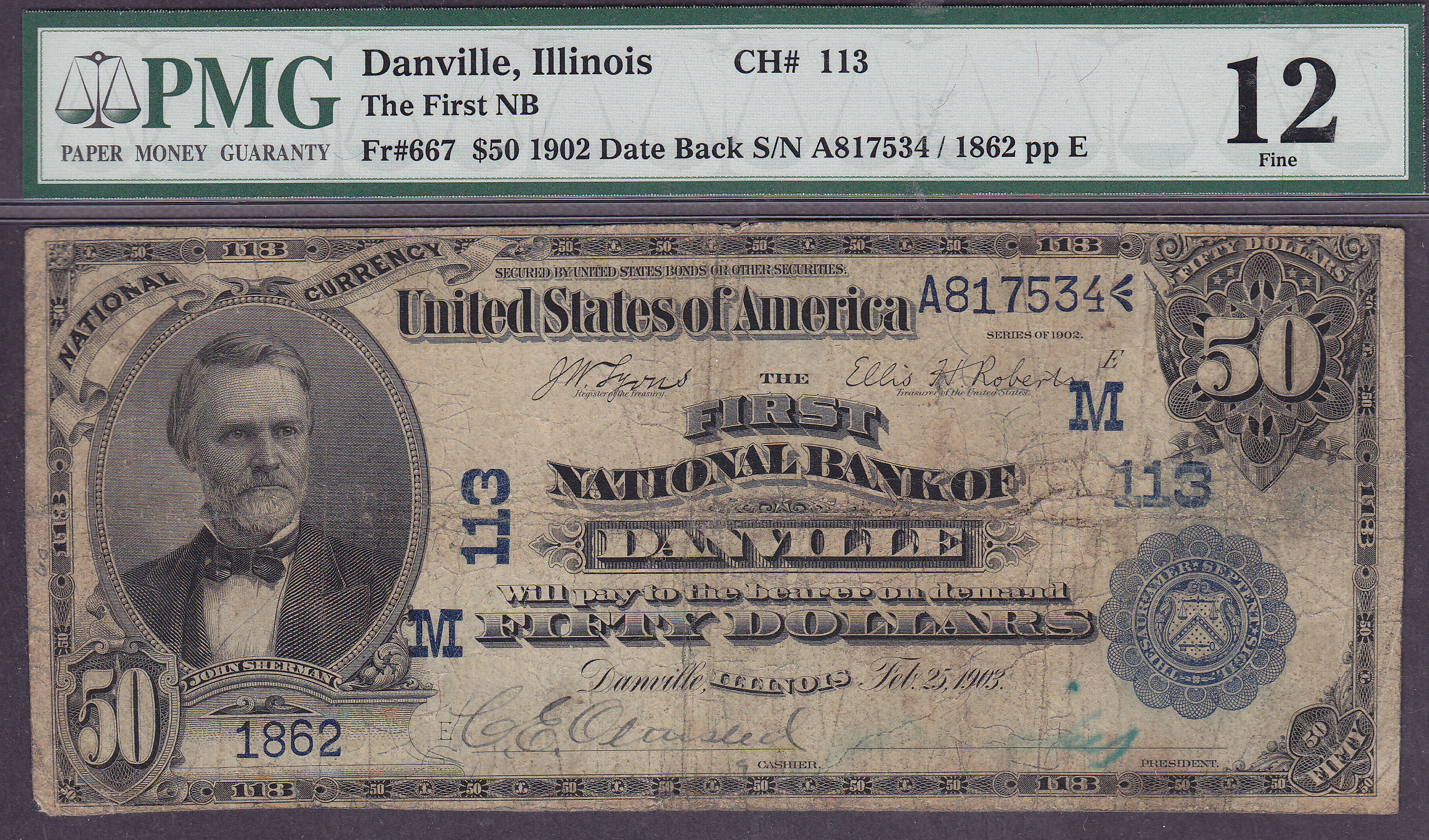 Here is another 1902 $50 Date Back from The First National Bank of Daneville, Ill. The Charter number is 113 and the Bank serial number is 1862. It is in a PMG Fine-12 holder. There are only eight of these 1902 $50 Date Backs known from this bank. Track and Price list this note for $1500 in Fine condition.
