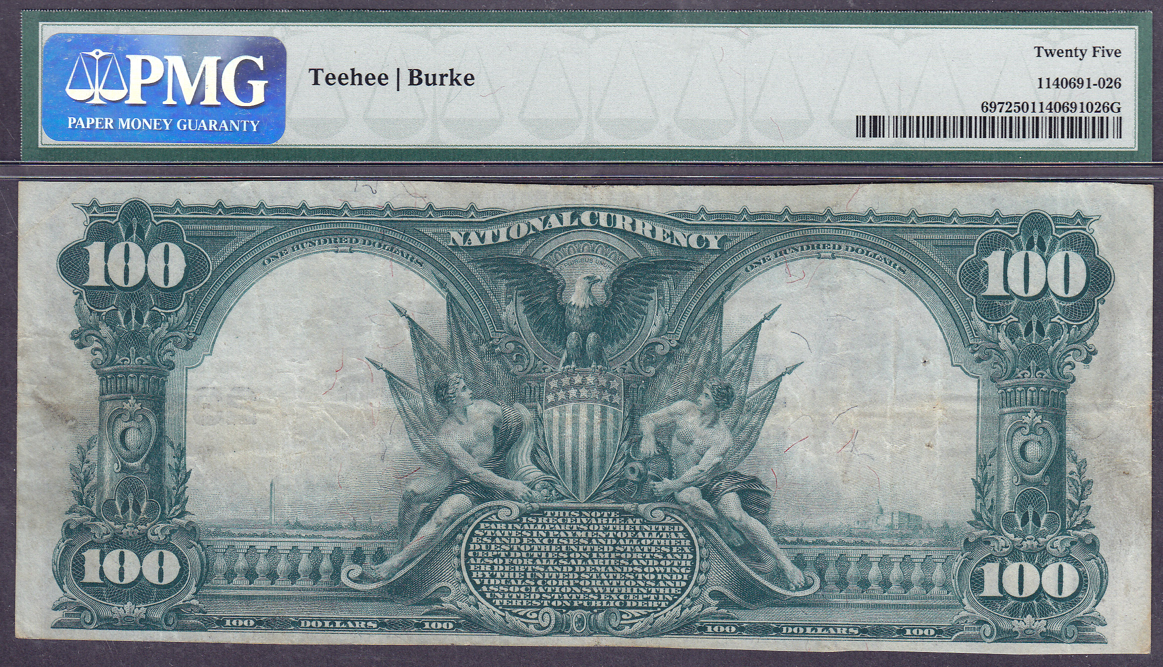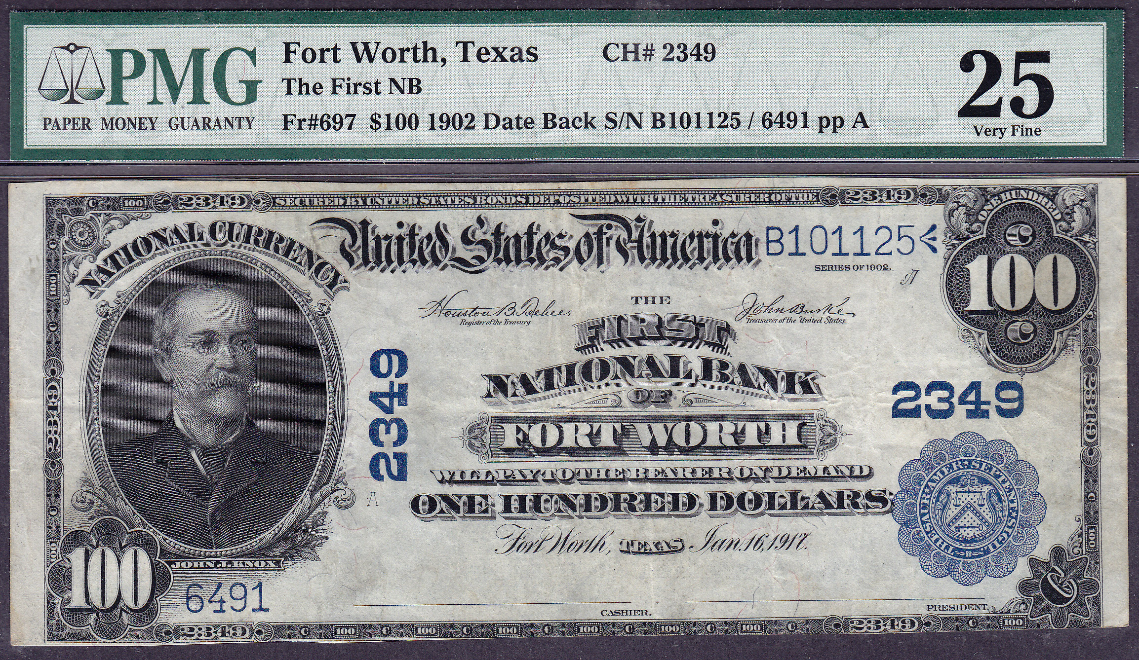 This is a real nice 1902 $100 Plain Back from The First National Bank of Ft Worth, TX. The Chrt. # is 2349. The PMG holder says Date Back but it is actually a Plain Back as you can see. PMG will change it for free as it is their mistake.