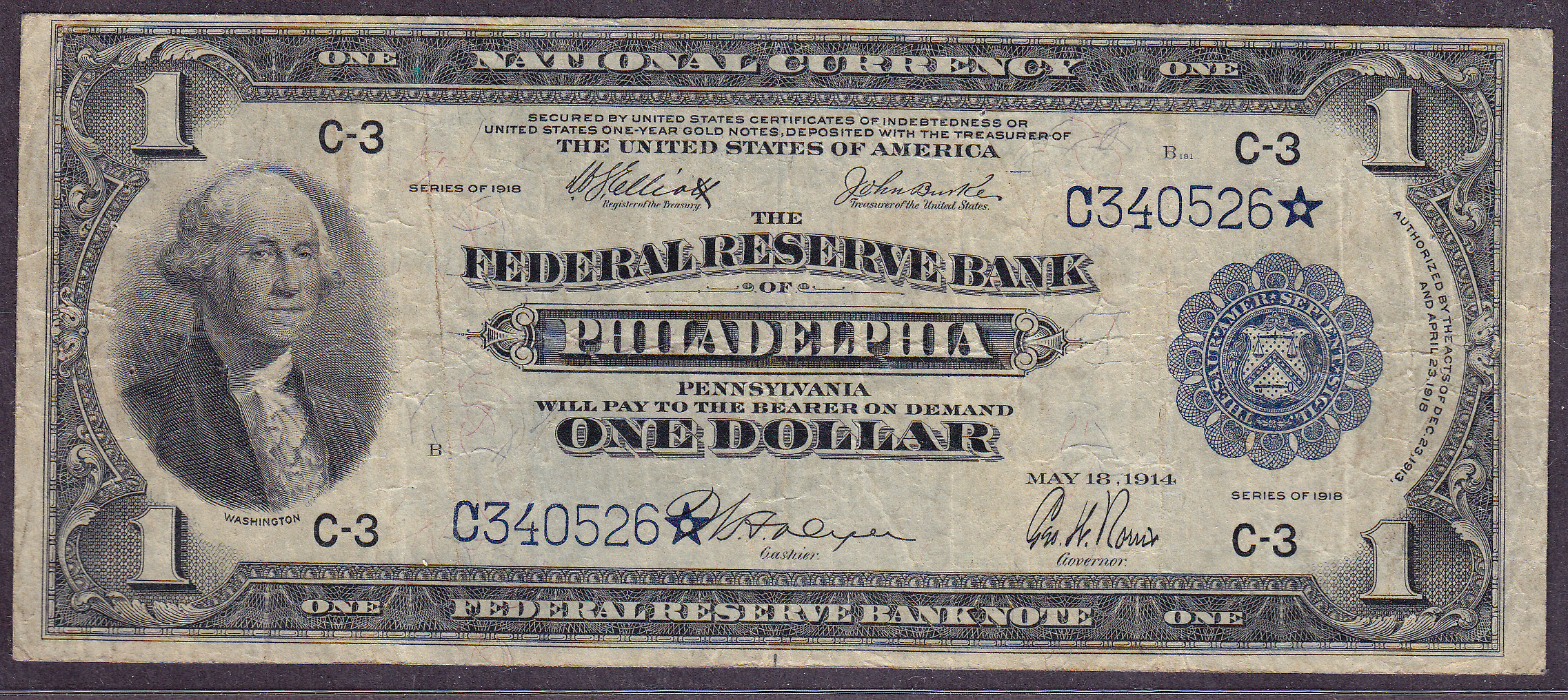 Fr.-717* 1918 $1 Philly FRBN Star Ser. # C340526* VF