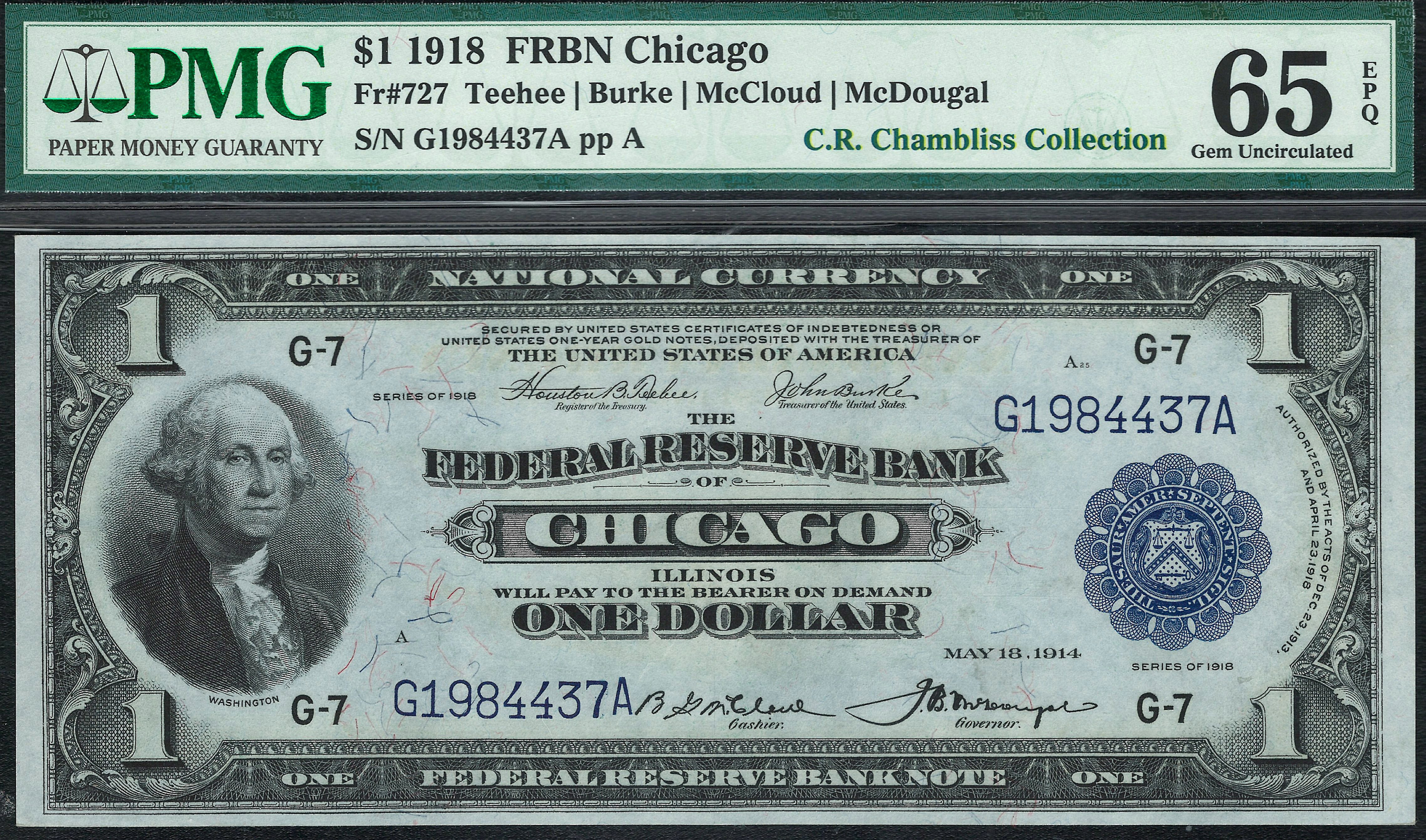 Fr.-727 1918 $1 Chicago FRBN Ser. G1984437A PMG-65EPQ