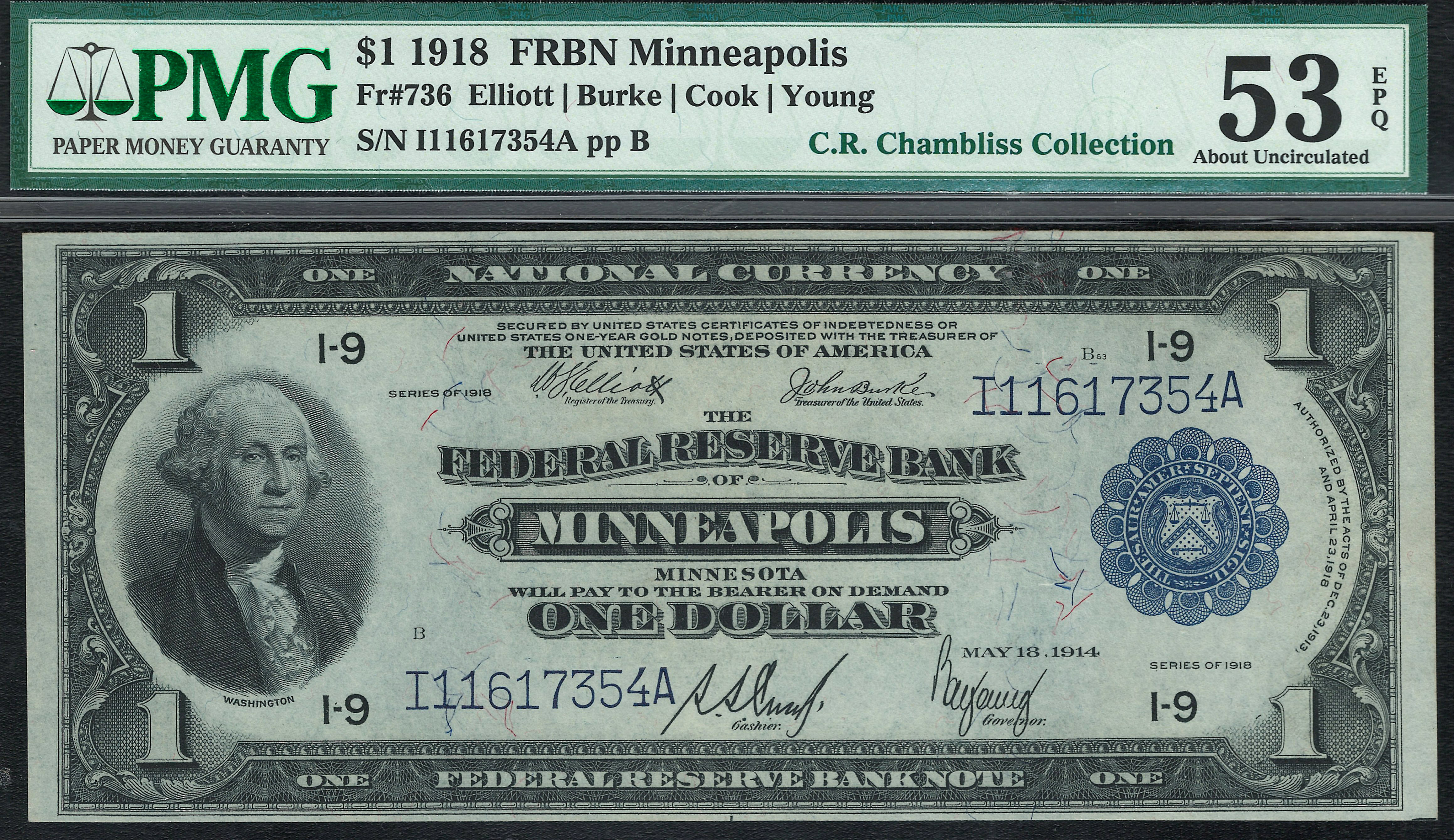 Fr.-736 1918 $1 Minneapolis FRBN Ser. I11617354A PMG-53-EPQ