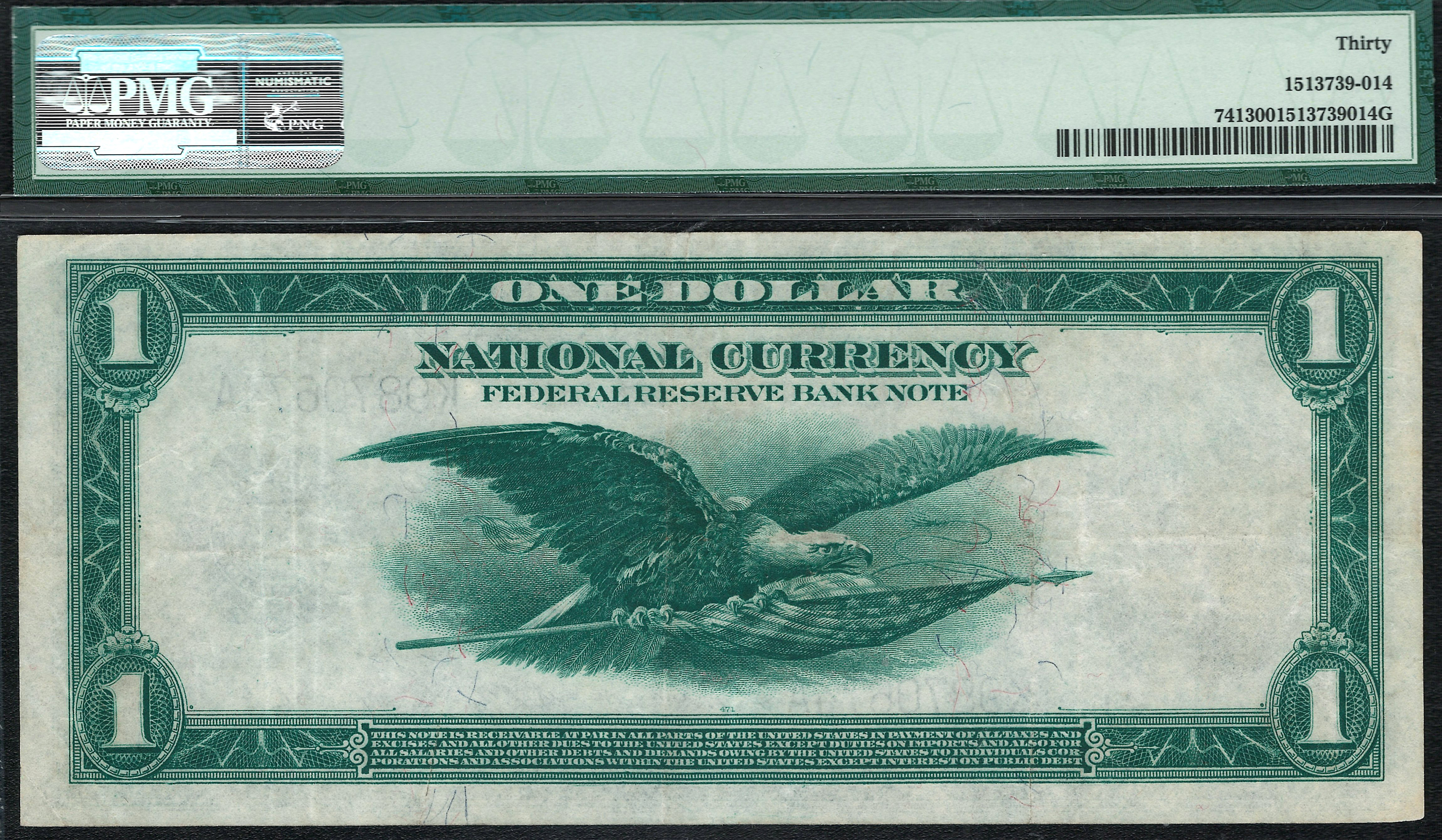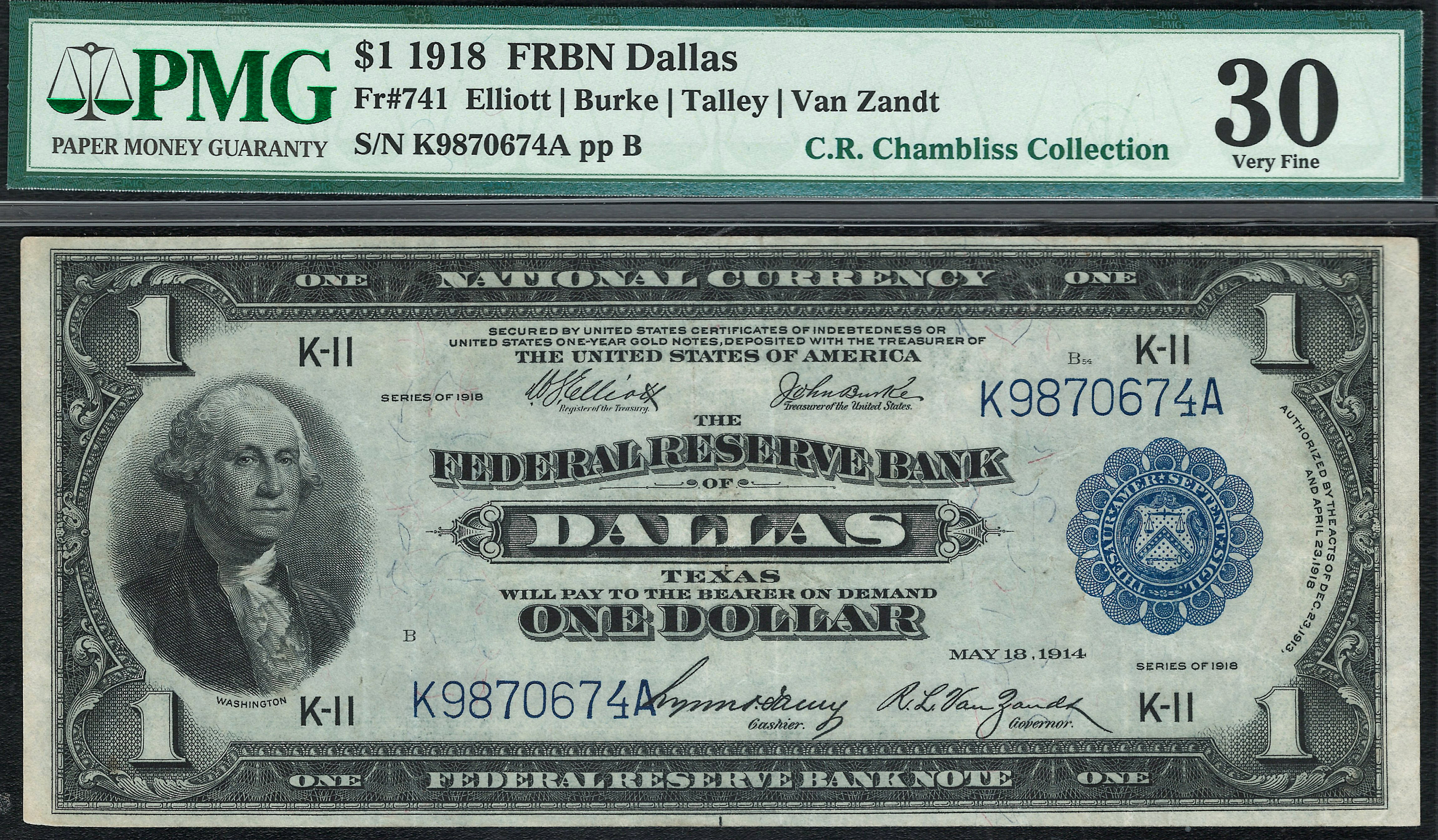Fr.-741 1918 $1 Dallas FRN Ser. K9870674A PMG 30