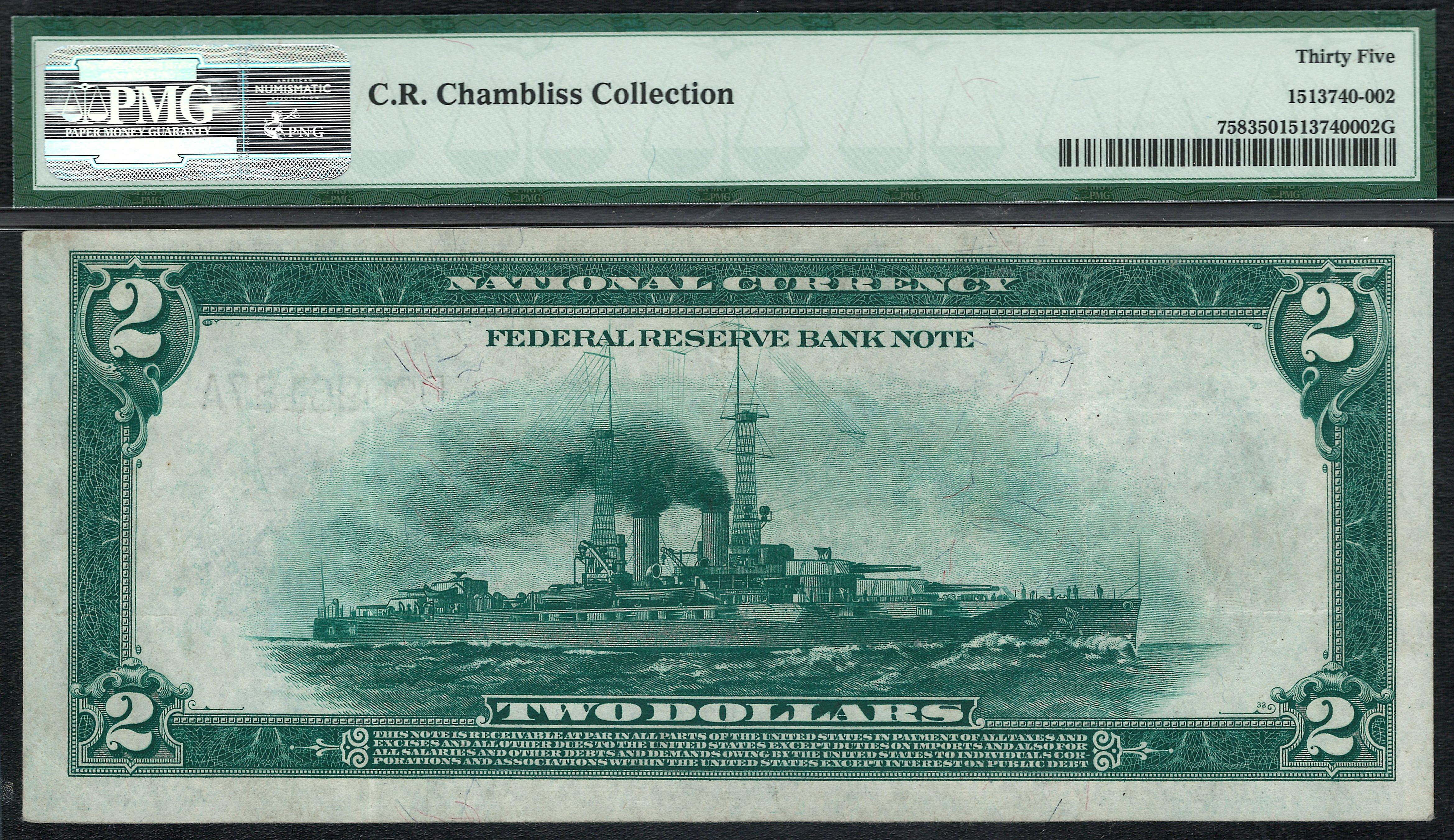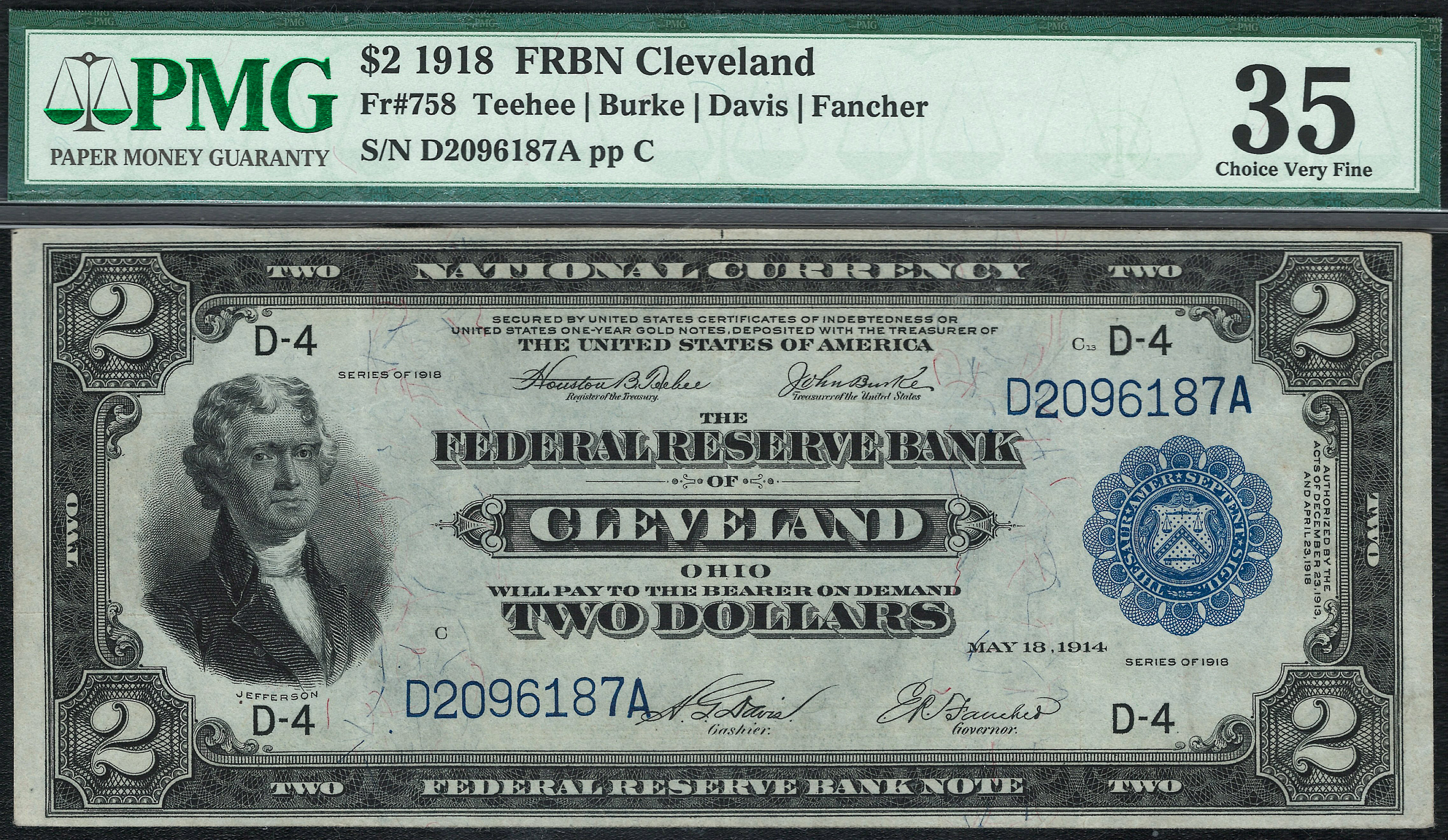 Fr.-758 This is a very fine example of the famous 1918 $2 Federal Reserve Bank Note commonly referred to as the Battleship because of its World War II Battleship on the reverse. This PMG-35 example hails from the popular Cleveland District. This example displays originality, nice centering and ink colors that fits the grade. This example is totally free of any issues such as pinholes, rips, tears or bank stamps. It Is not often than I can offer a nice mid grade Battleship to my clients for under $1,000. I guarantee at this price, IT WILL NOT LAST LONG! The serial number is D2096187A and resides in a PMG-VF35 holder.