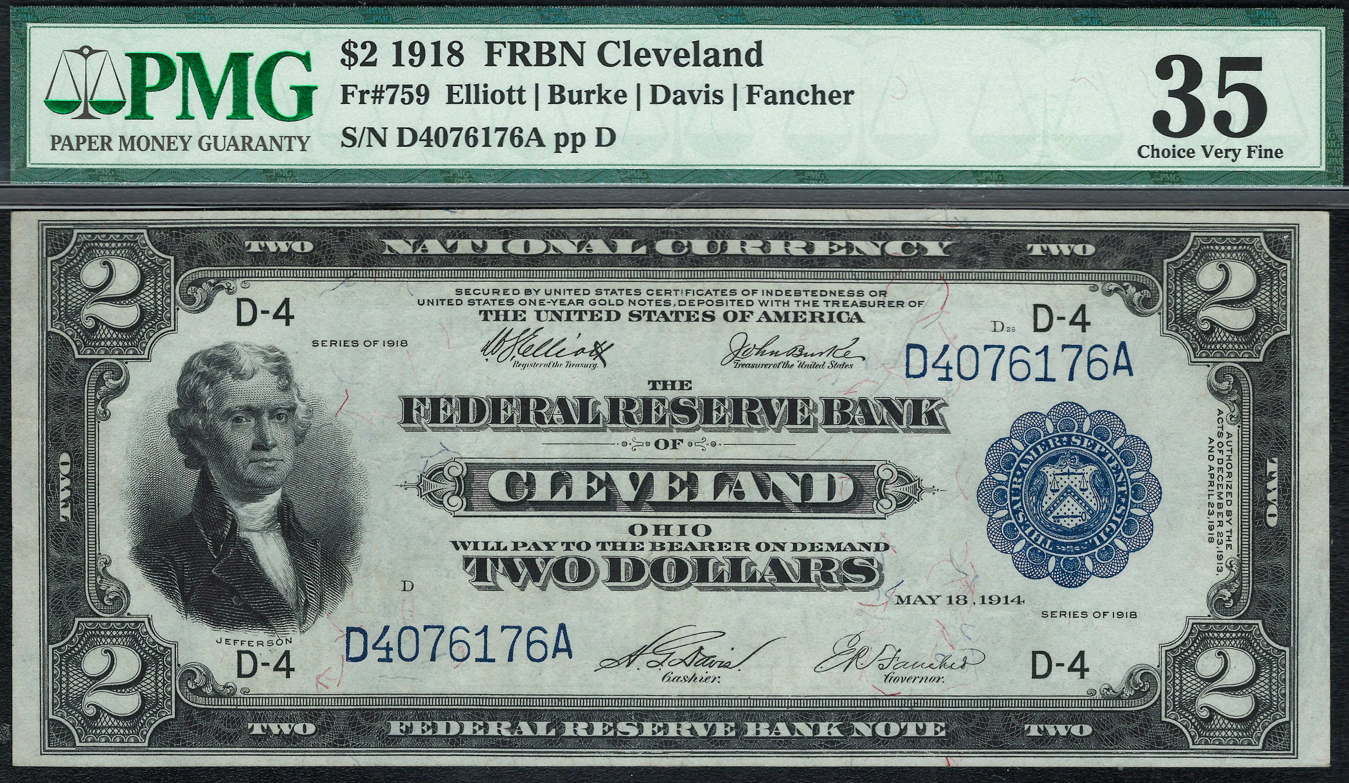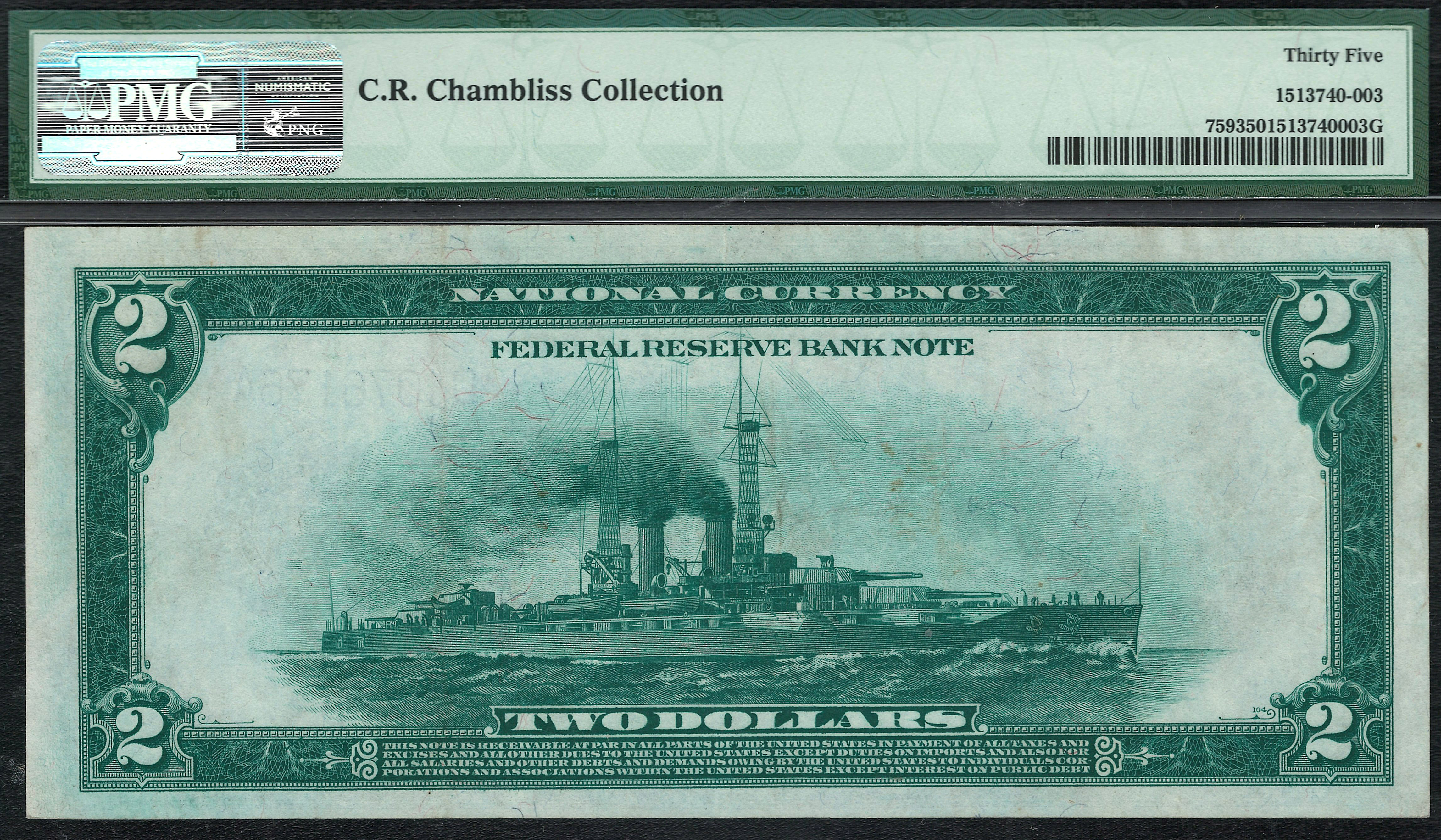 Fr.-759 This is a very fine example of the famous 1918 $2 Federal Reserve Bank Note commonly referred to as the Battleship because of its World War II Battleship on the reverse. This PMG-35 example hails from the popular Cleveland District. This example displays originality, nice centering and ink colors that fits the grade. This example is totally free of any issues such as pinholes, rips, tears or bank stamps. It Is not often than I can offer a nice mid grade Battleship to my clients for under $1,000. I guarantee at this price, IT WILL NOT LAST LONG! The serial number is D4076176A and resides in a PMG-VF35 holder.