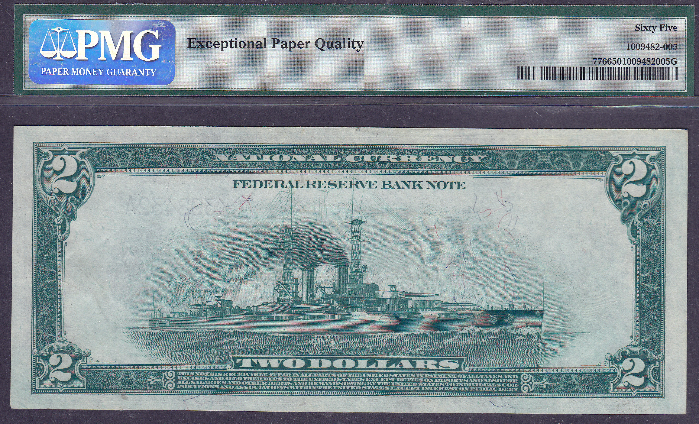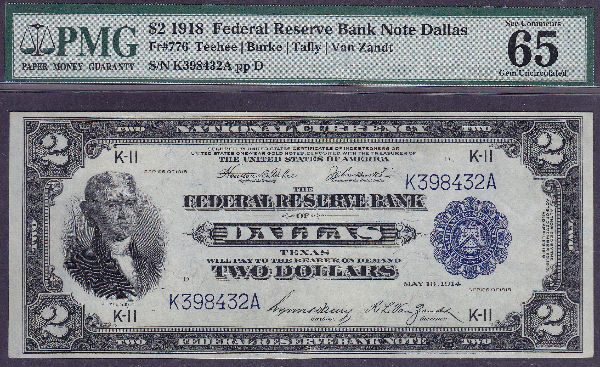 POP2/1 Finer...This is one of my favorite 1918 $2 Battleship FRBNs. Not only because it is from my home city but because of its true rarity in GEM. There are on 7 of these Dallas FRBN's known in GEM grade. Of the 29 graded by PMG, only one is graded higher in a PMG-66EPQ. The serial number is K398432A and is in a PMG-65EPQ holder.