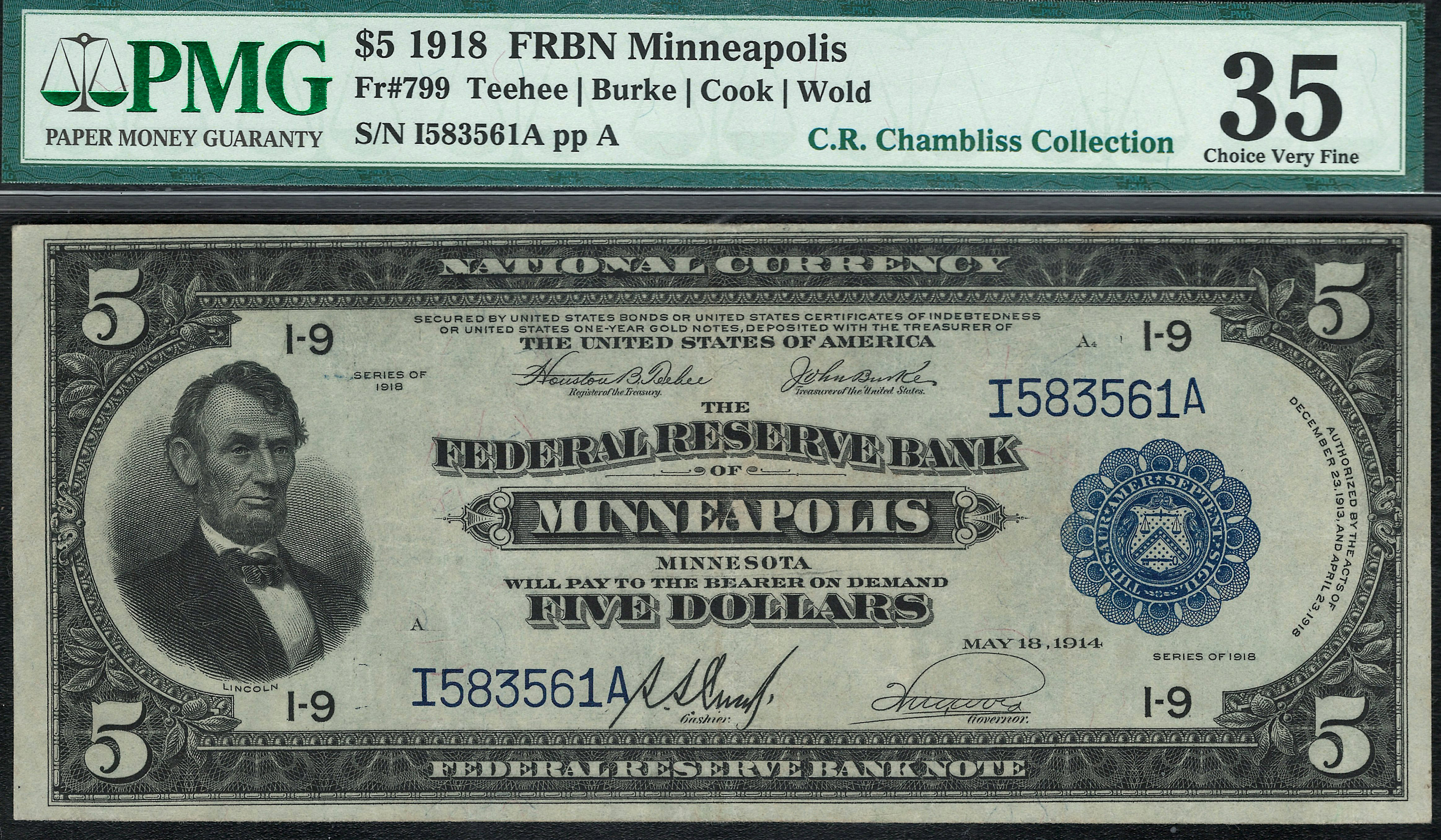 Fr.-799 1918 $5 Minneapolis FRBN Ser. I583561A PMG-35