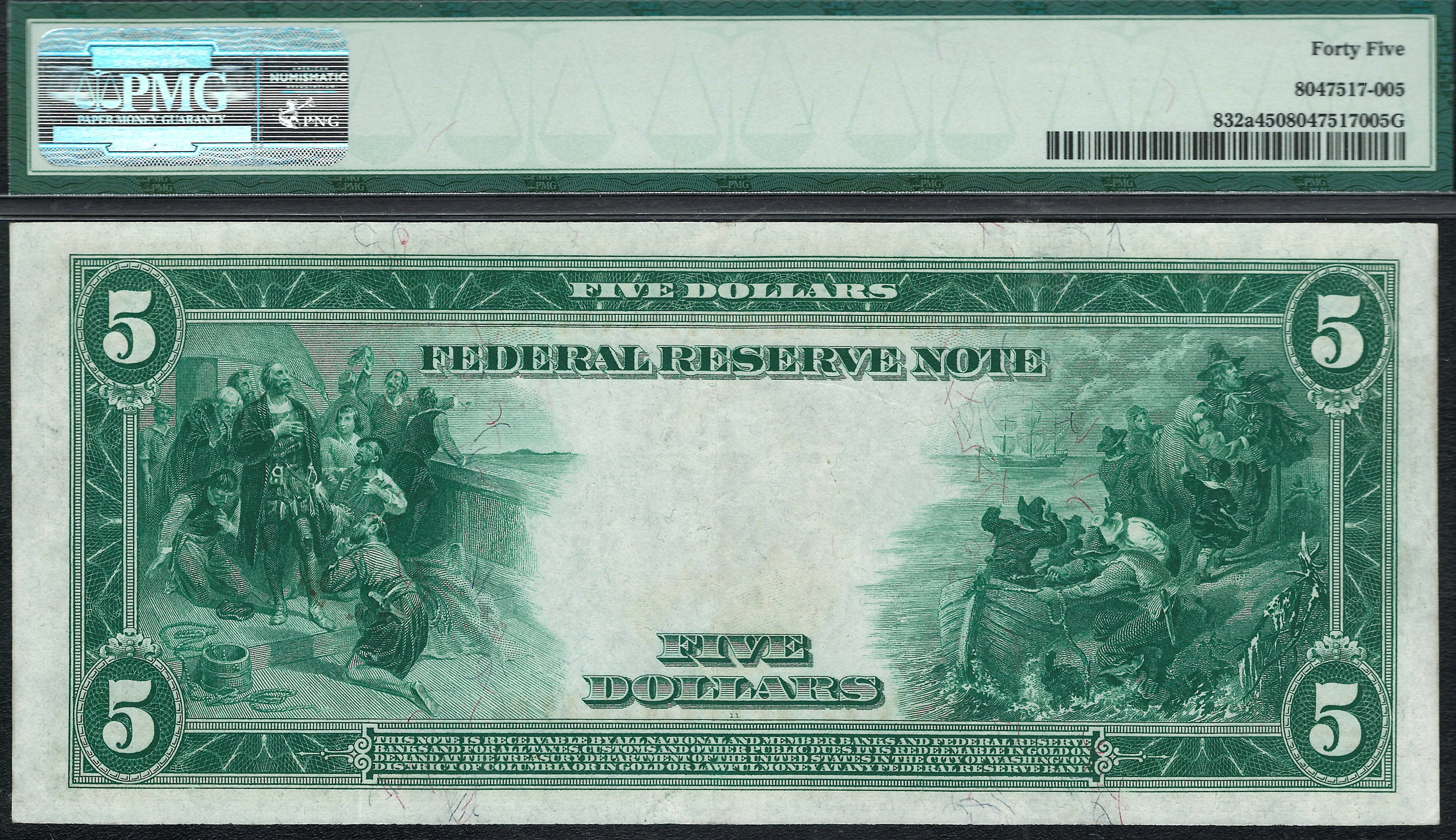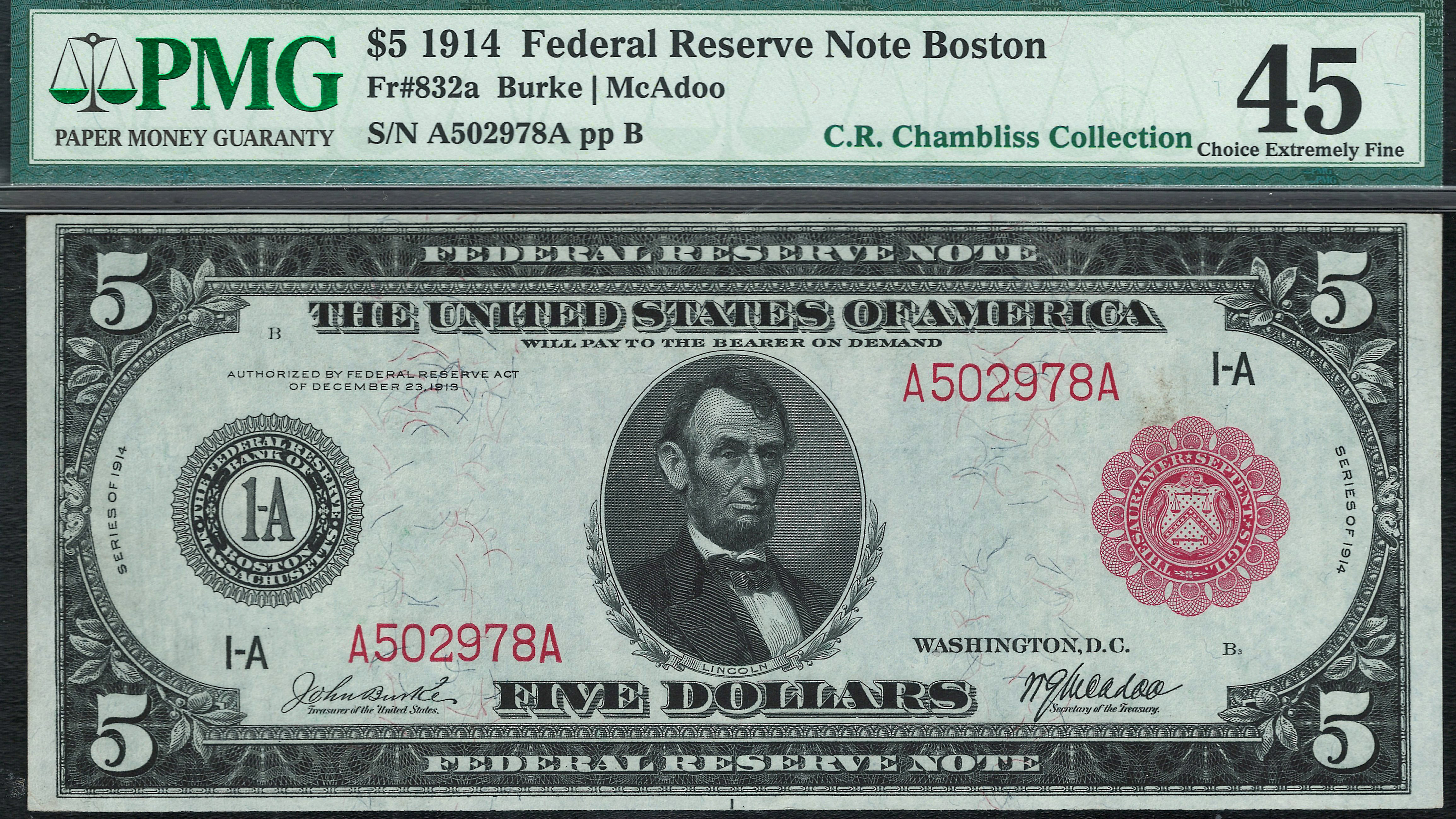 Fr.-832a 1914 $5 Boston FRN (RED SEAL) Ser. A502978A PMG-45