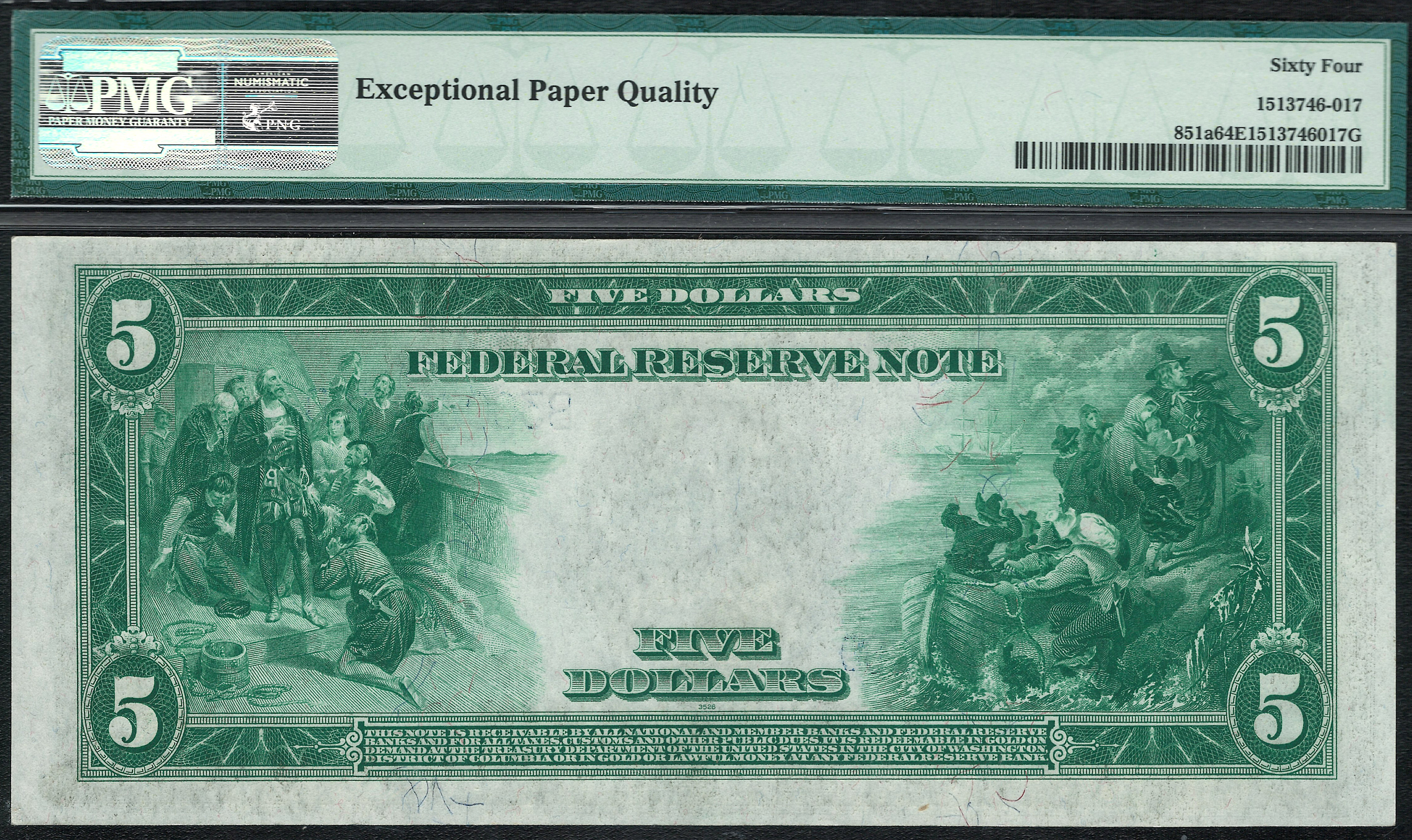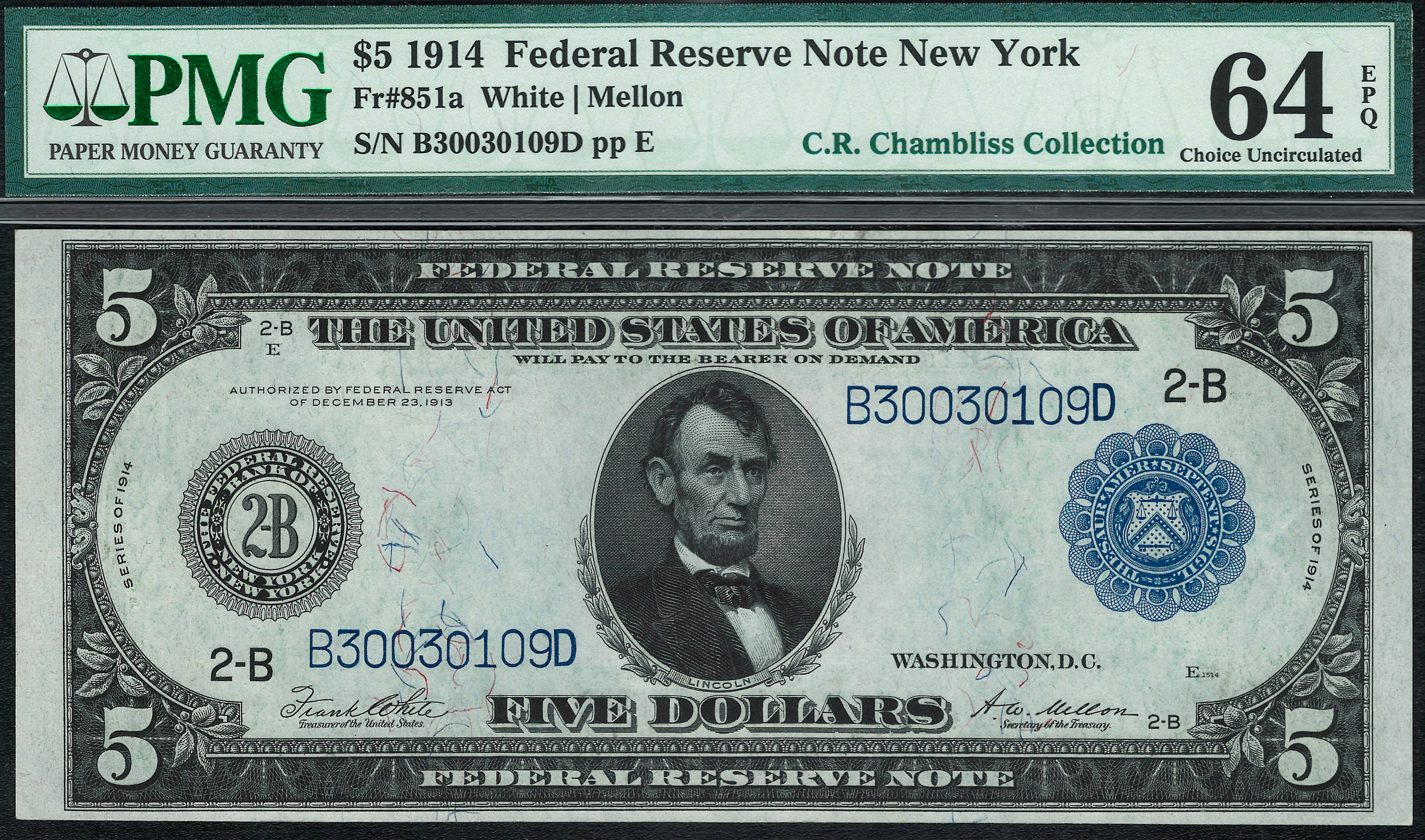 Fr.-851a 1914 $5 New York (Bue Seal) FRN Ser. B30030109D PMG-64EPQ