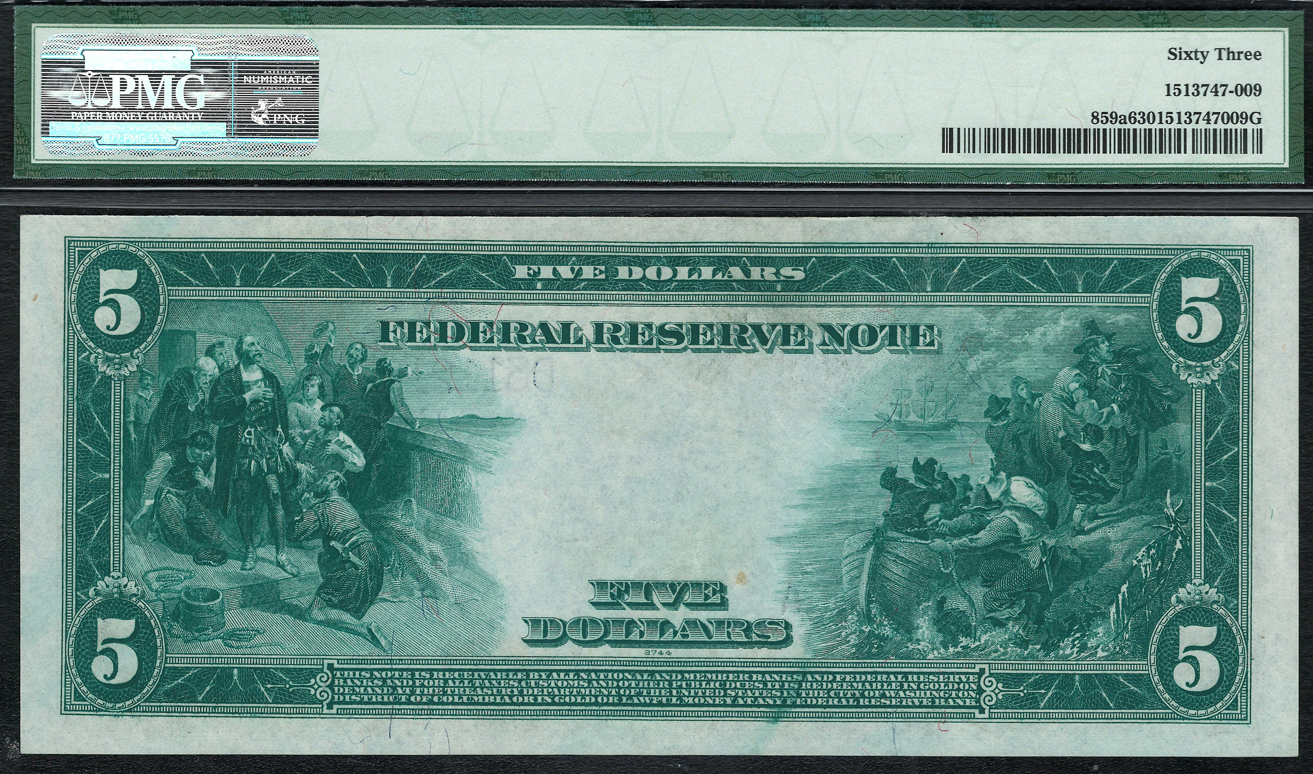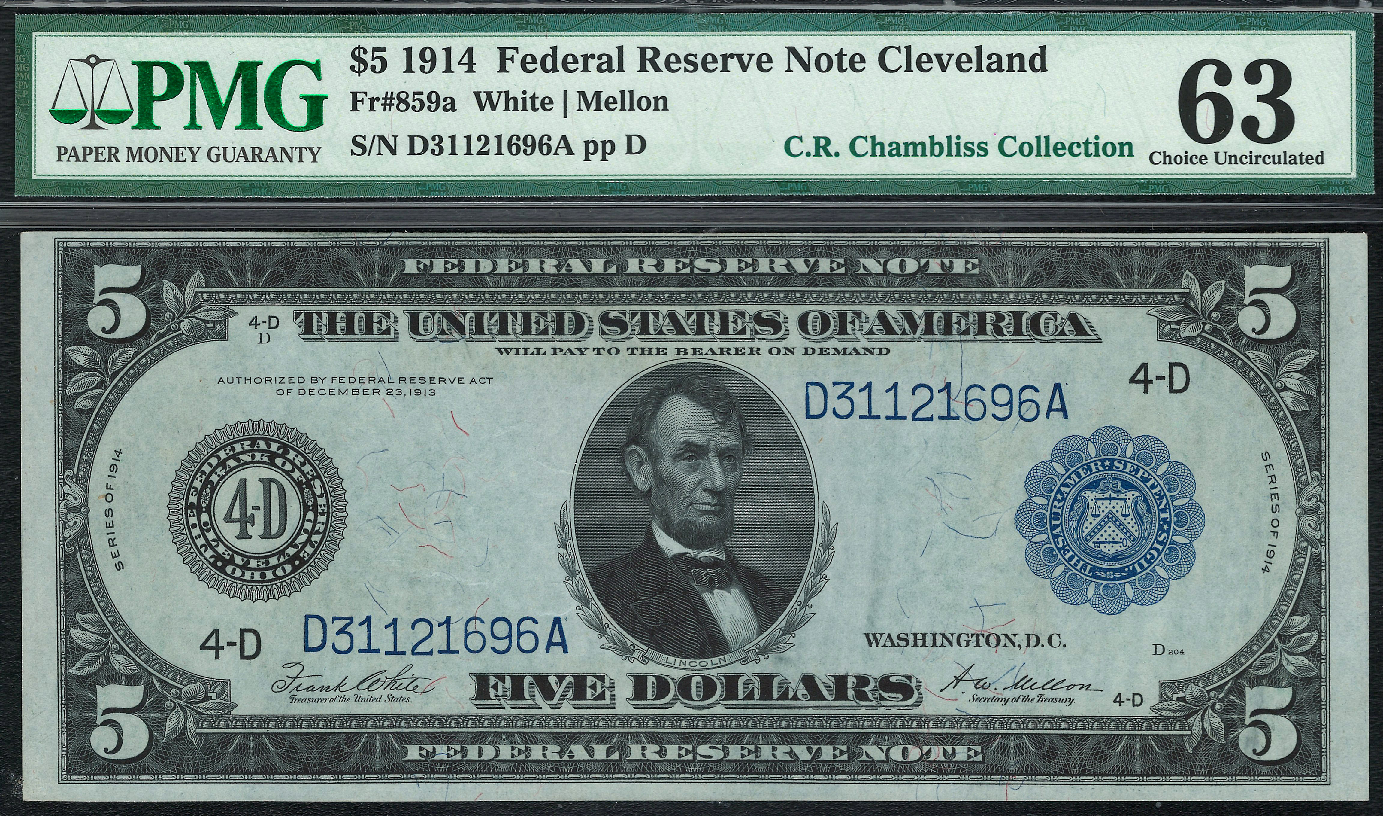 Fr.-859a 1914 $5 Cleveland (Blue Seal) FRN Ser. D31121696A PMG-63