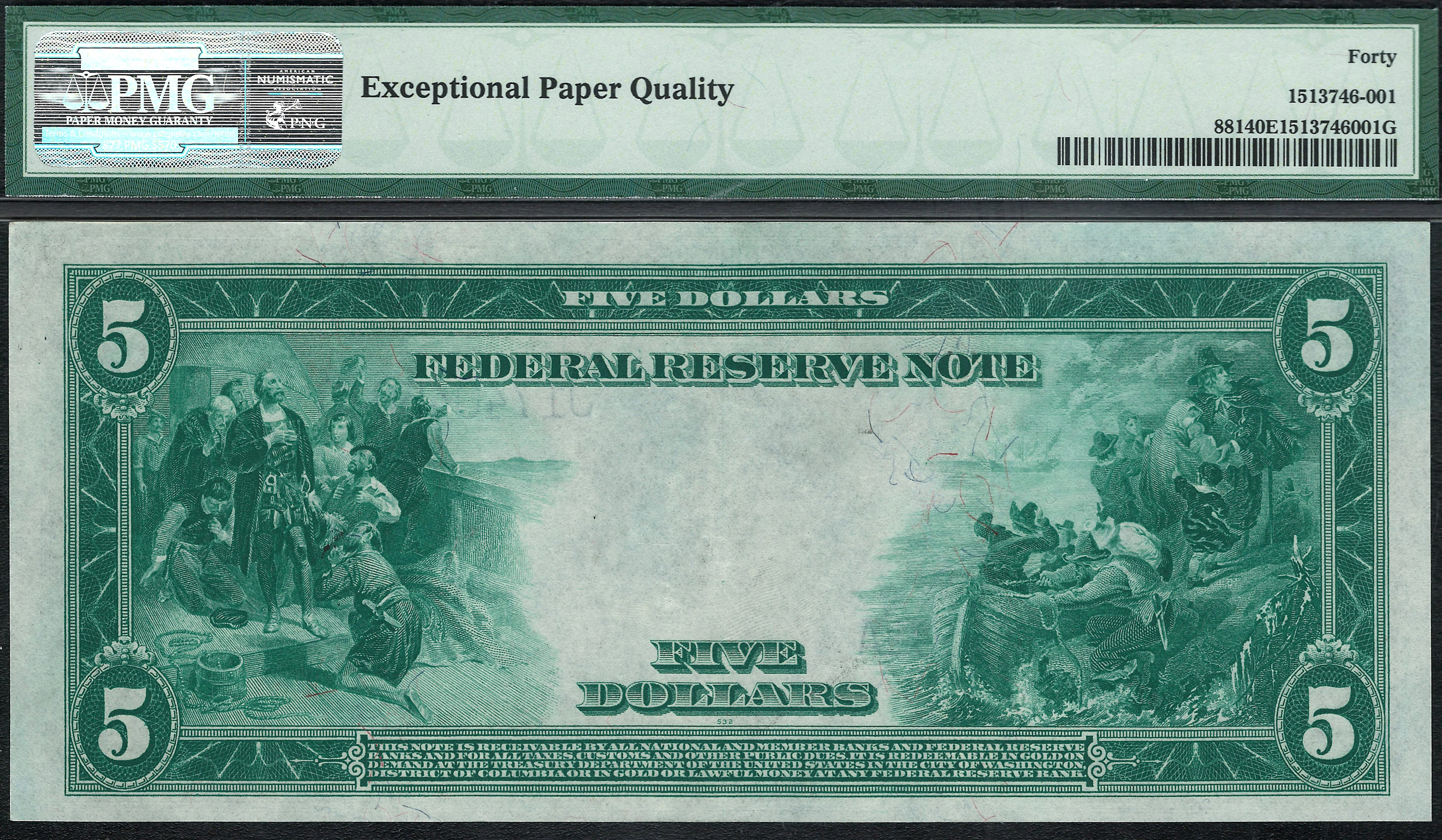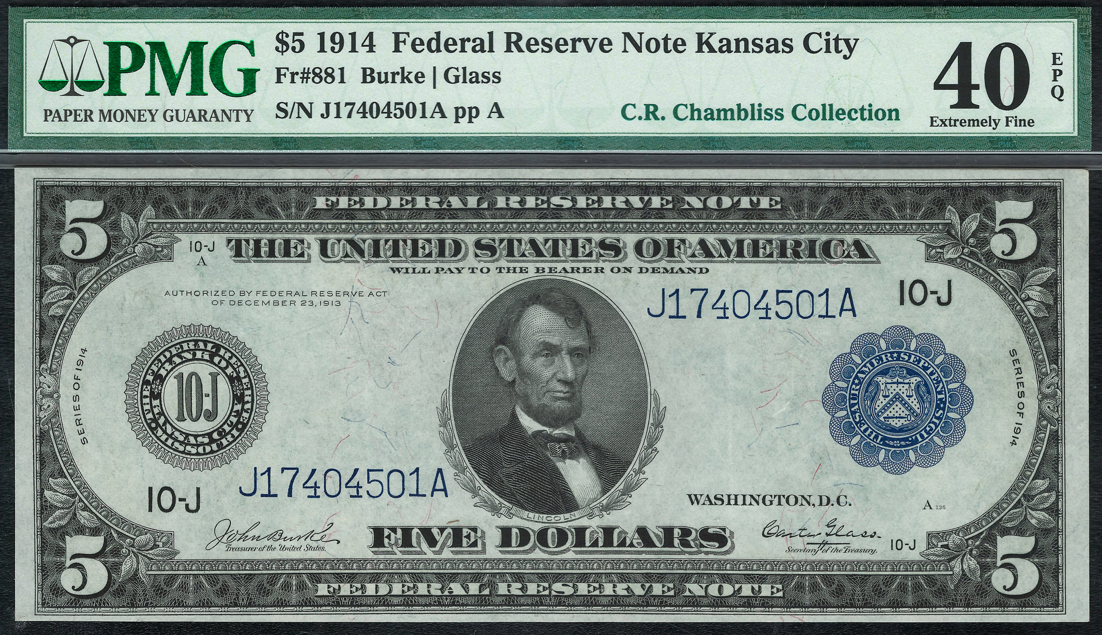 Fr.-881 1914 $5 Kansas City (Blue Seal) FRN Ser. J17404501A PMG-40EPQ
