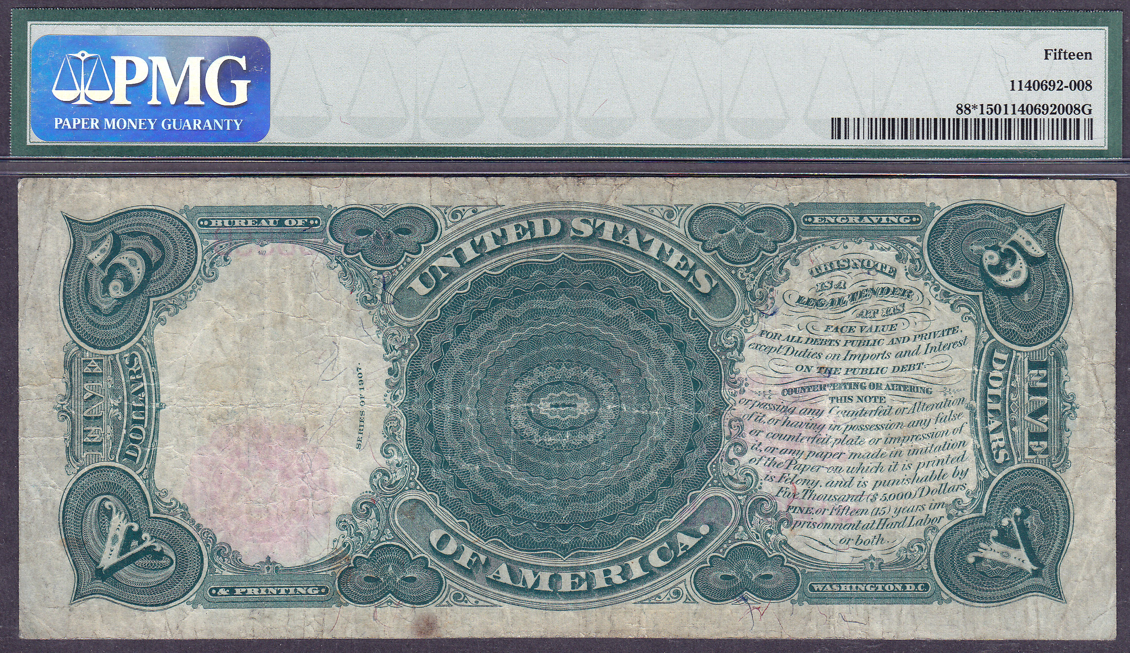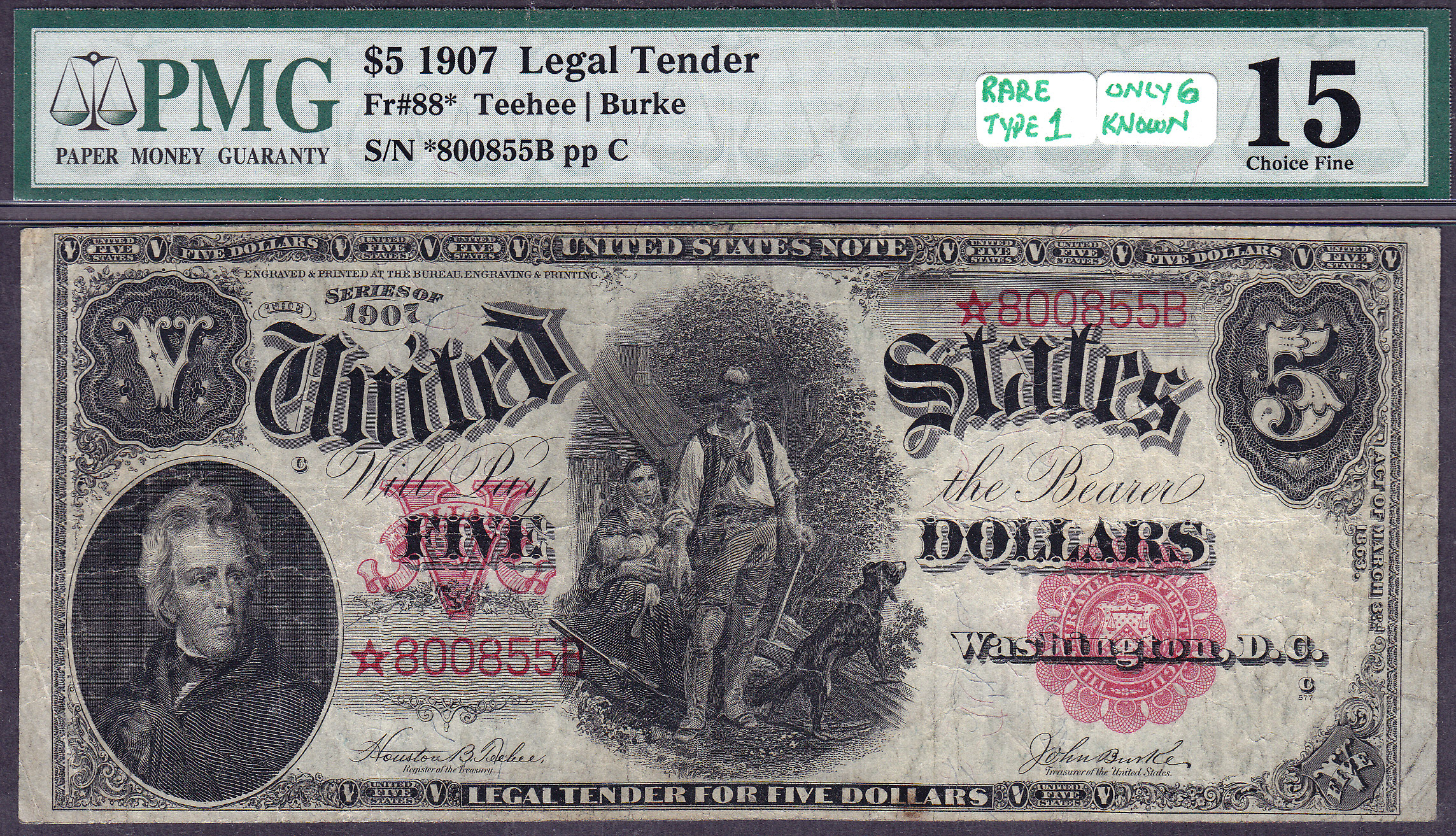 This is a 1907 Legal Tender star or a Fr.-88* Type 1, with only 6 known. Type 1 is described as when the plate number 577 on the bottom left side is "below" the plate letter C. You will notice the plate number of 577 is typed below the plate letter of C. Type 2 notes with 55 known, is where the plate number is listed beside the plate letter, for example C577. This 1907 $5 Fr.-88* star note is extremely rare and is missing from most all major star collections. This rare star has been graded as a PMG F-15 with a serial number of *800855B.This note is commonly referred to as the Pioneer Family or the Woodchopper note.