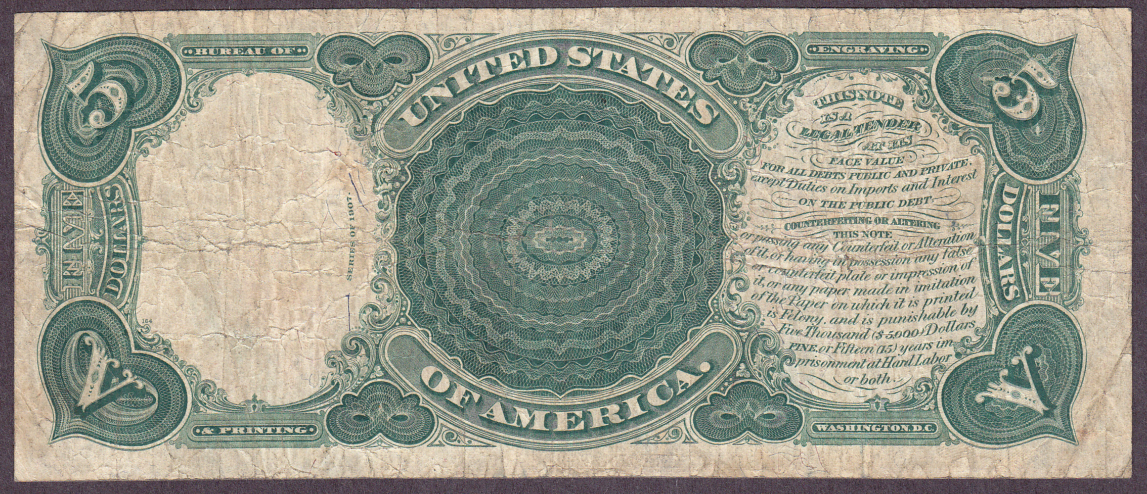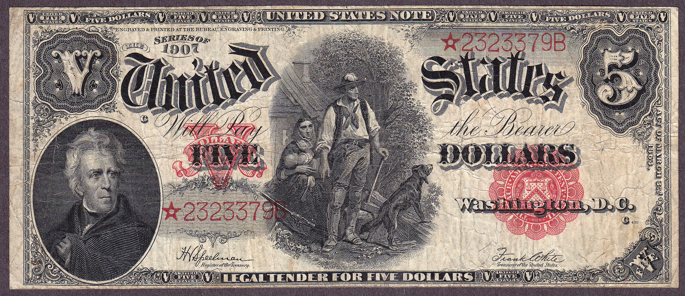 This is a cool Fr-91* or a 1907 $5 legal tender star note. although it is circulated there are no rips, tears, pinholes or missing pieces. It has never been cleaned or pressed. Check the scans. The serial number is *2323379B. This note is commonly refered to as the Woodchopper Note or the Pioneer Family Note because of the photo on the front. A real popular note especially since it is also a star note. This note was first reported in June of 1992 and I bought it in Aug of 2003.