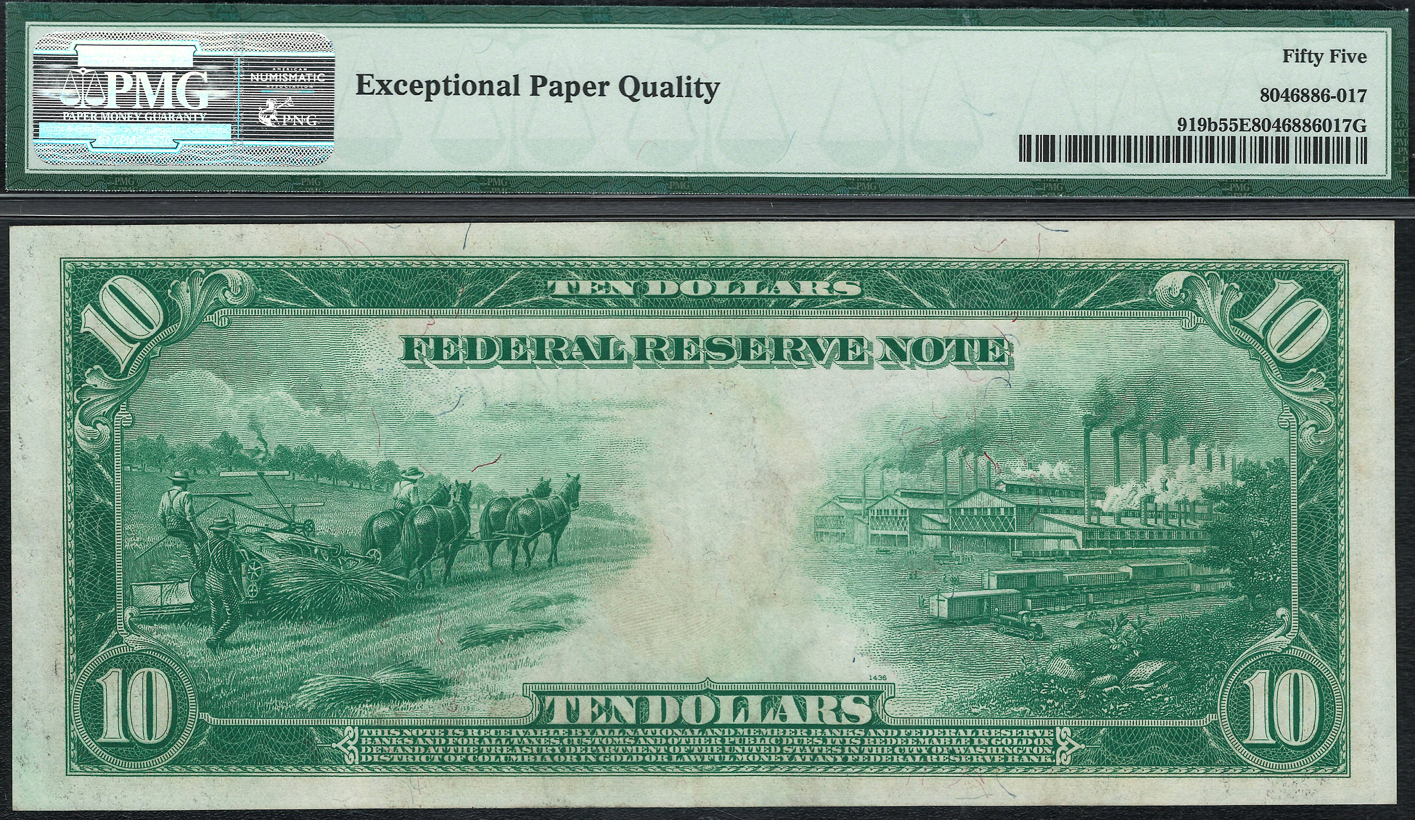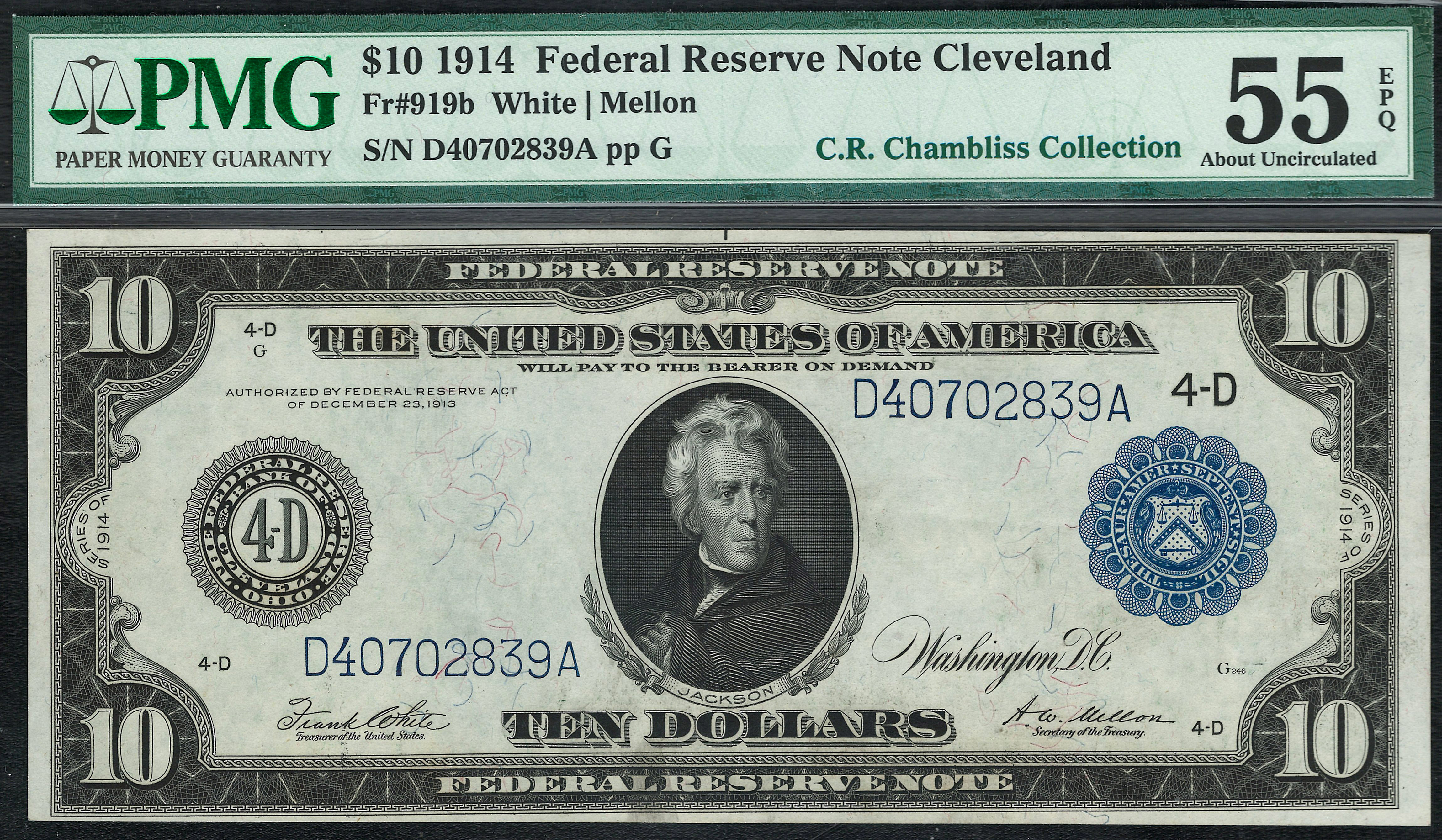 Fr.-919b 1914 $10 Cleveland FRN (Blue Seal) Ser. D40702839A PMG-55EPQ